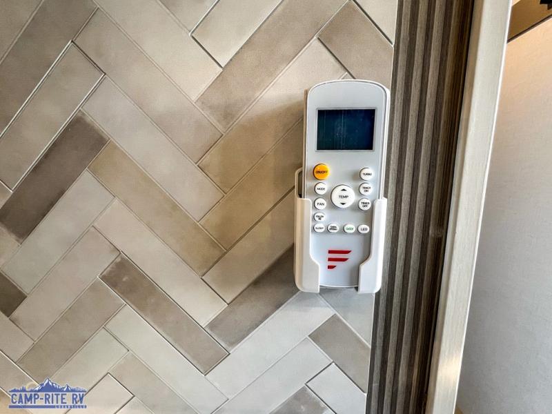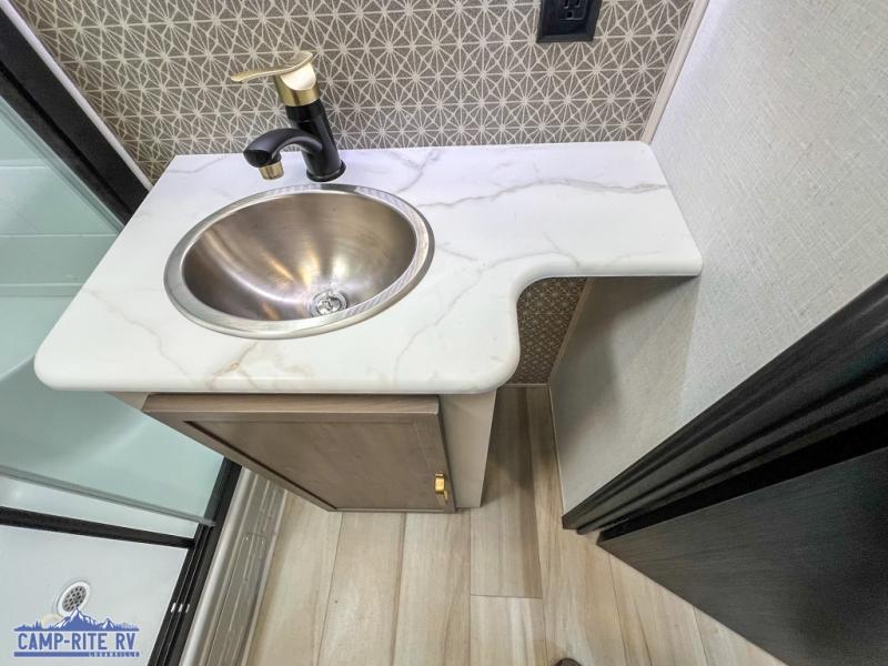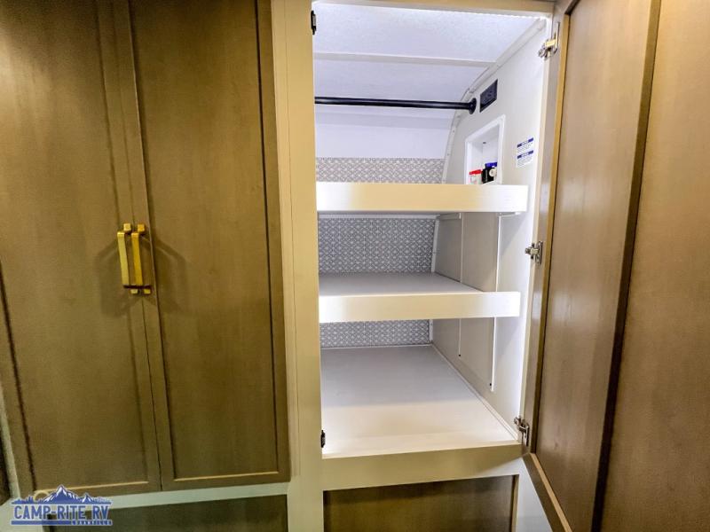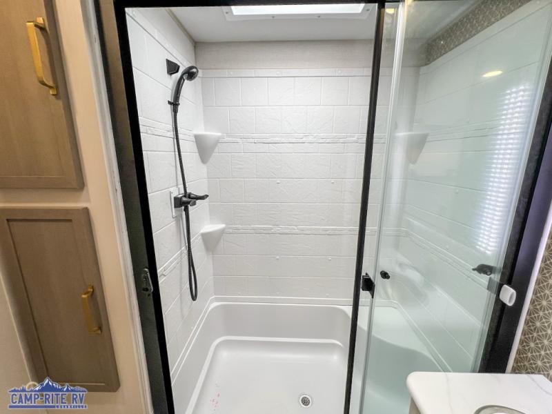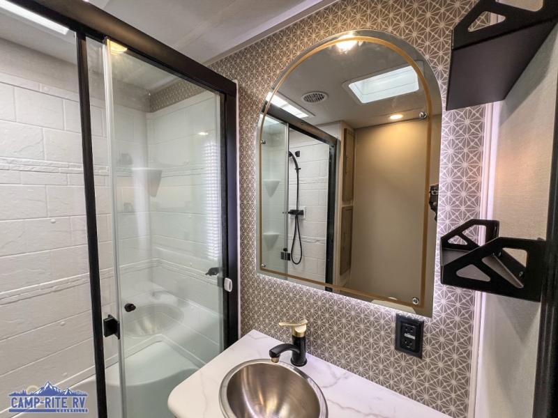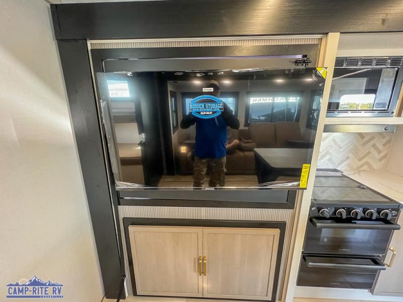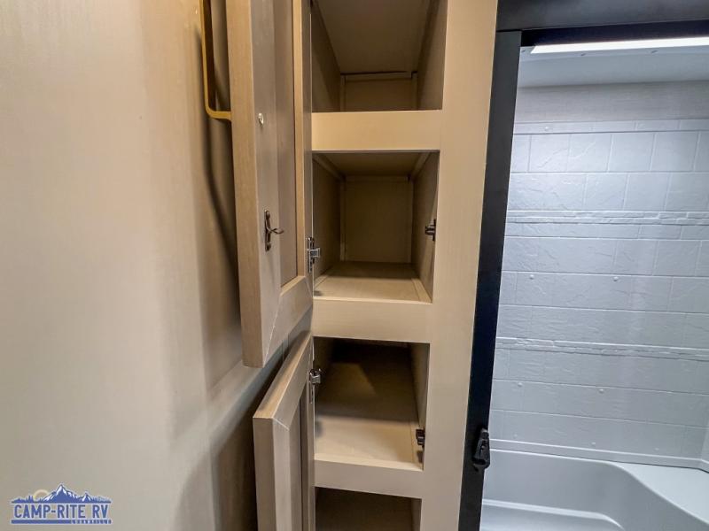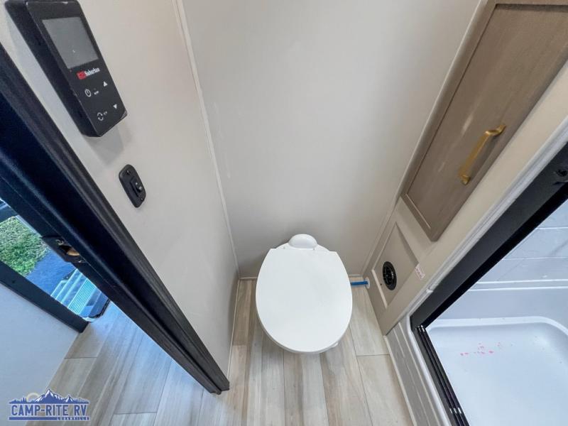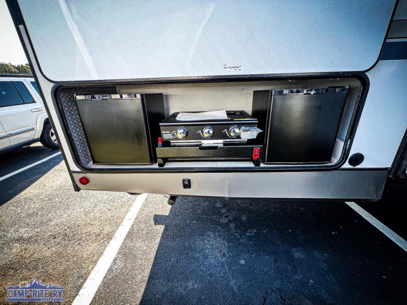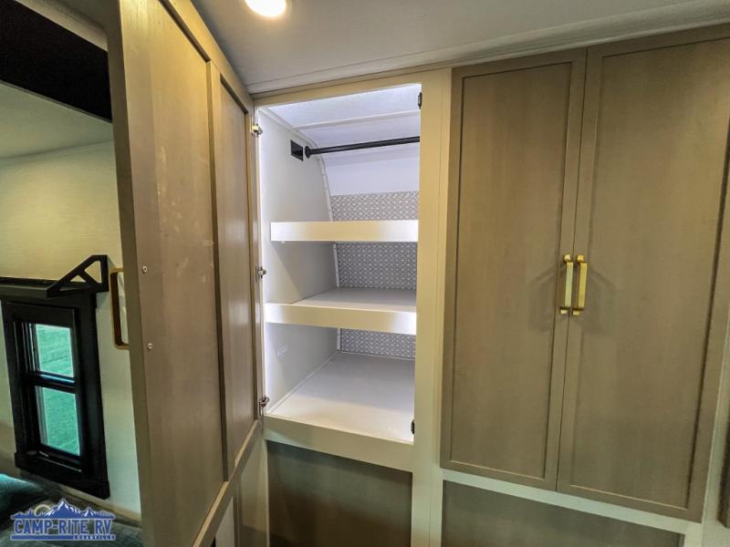 Your kids or friends are going to love camping in this travel trailer! It features a rear private bunkhouse with a bunk above a Versa queen convertible bed/sofa plus an additional bunk above an entertainment center with storage below. Just outside the bunkhouse is the kitchen with a 10 cu. ft. 12V black refrigerator, a microwave, a kitchen island, and a chef-sized walk-in pantry big enough to store everyone's favorite snacks. The booth dinette and the theatre seating are right next to panoramic windows so you can enjoy looking out at your beautiful scenery. You will also love taking a hot, steamy shower in the 30" x 36" shower with skylights and get a good night's rest on the queen bed with Versa Tilt in the front private bedroom!