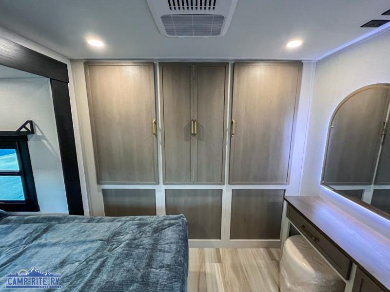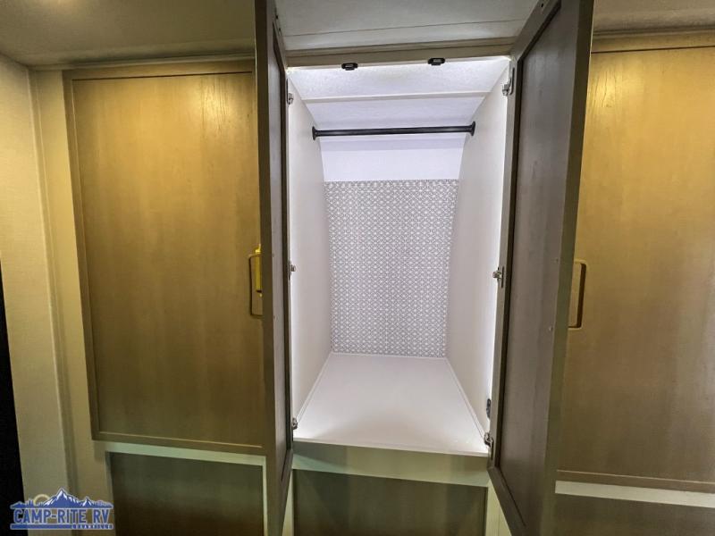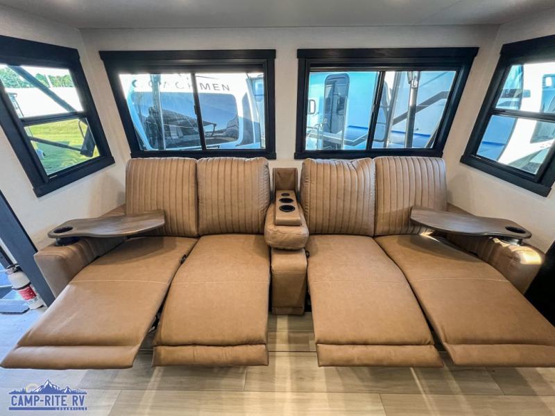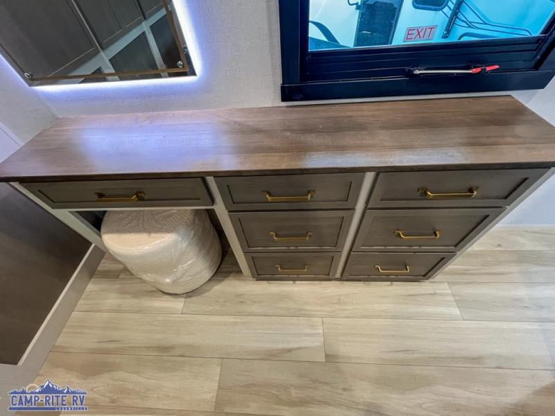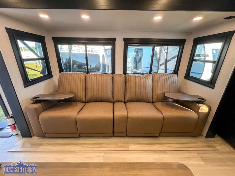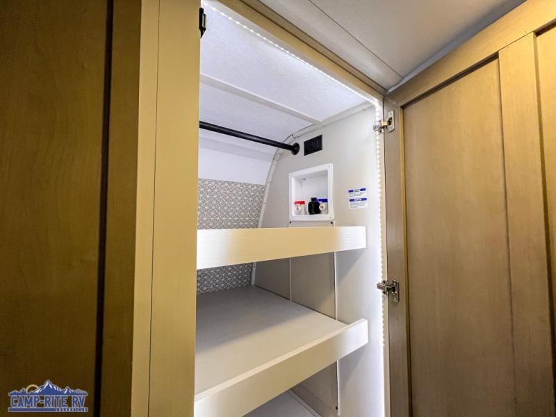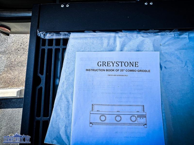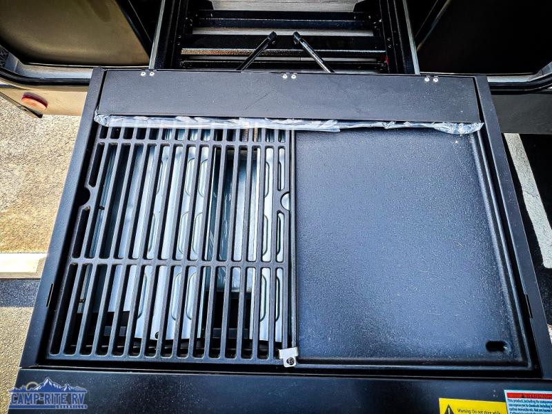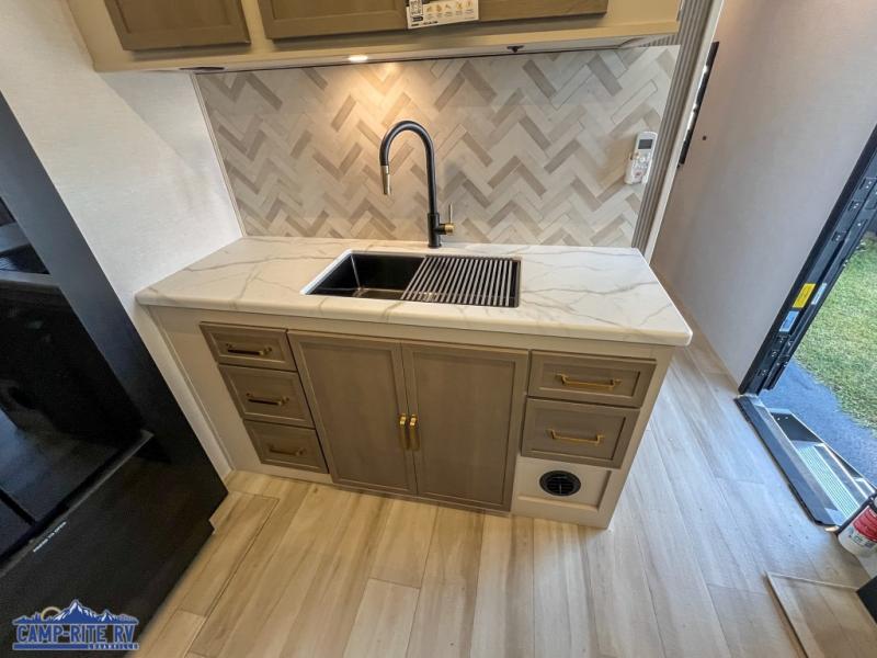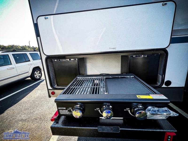 Your kids or friends are going to love camping in this travel trailer! It features a rear private bunkhouse with a bunk above a Versa queen convertible bed/sofa plus an additional bunk above an entertainment center with storage below. Just outside the bunkhouse is the kitchen with a 10 cu. ft. 12V black refrigerator, a microwave, a kitchen island, and a chef-sized walk-in pantry big enough to store everyone's favorite snacks. The booth dinette and the theatre seating are right next to panoramic windows so you can enjoy looking out at your beautiful scenery. You will also love taking a hot, steamy shower in the 30" x 36" shower with skylights and get a good night's rest on the queen bed with Versa Tilt in the front private bedroom!