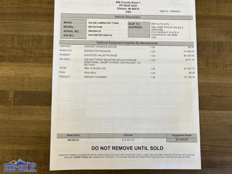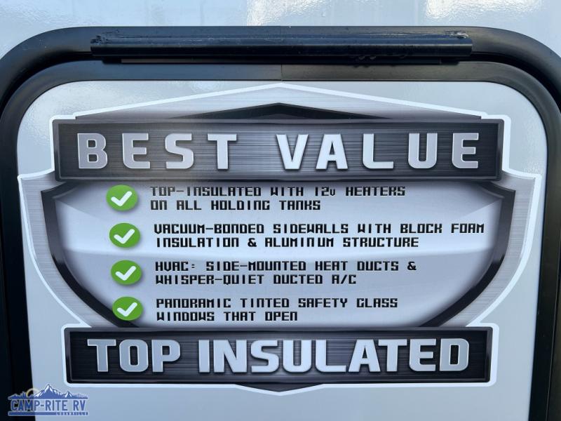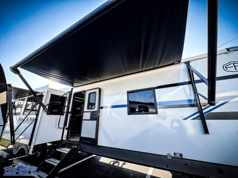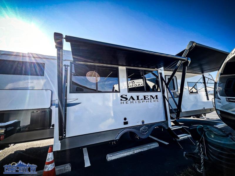 The Salem Hemisphere fifth wheels and travel trailers by Forest River are packed with features, while still being value-minded! Each model is constructed with laminated "Aluma Frame" sidewalls and floor with block foam insulation plus full length barreled ceilings for added head space. There are LED awning, marker and tail lights outside, along with an extra large pass-thru storage with slam latch baggage doors, plus solar prep and Lippert On-The-Go ladder prep. The 60K on-demand tankless water heater will provide endless hot showers, and the JBL sound system includes a head unit plus interior and exterior speakers to keep the party going. There are also many interior comforts found throughout that will make you feel right at home!