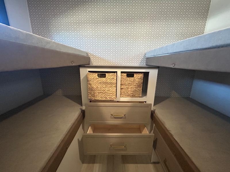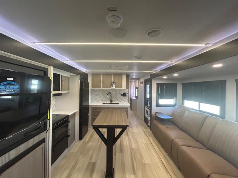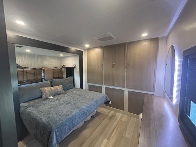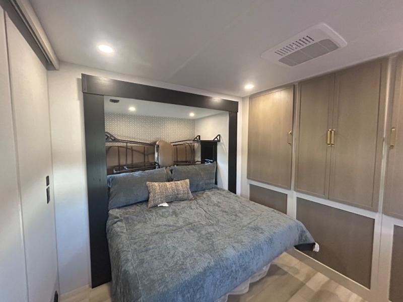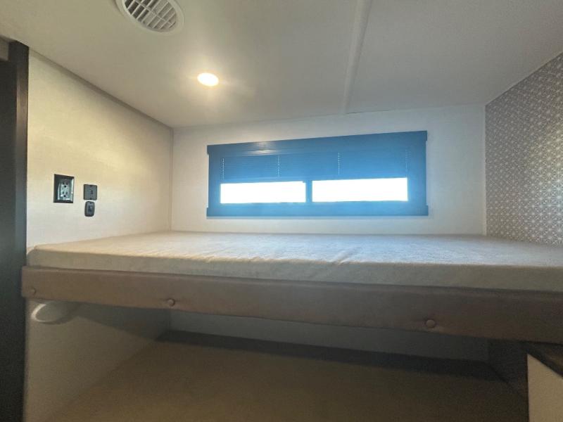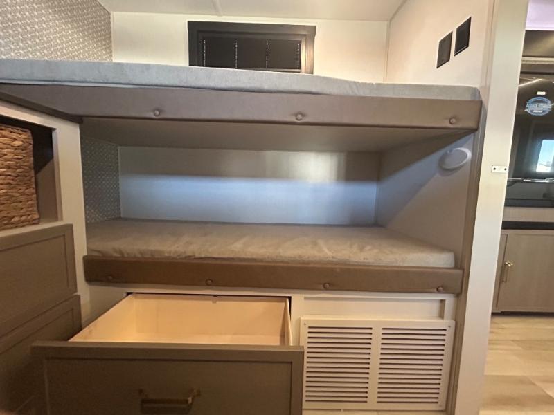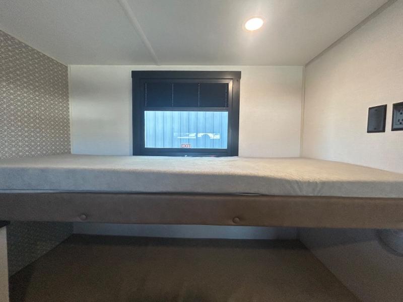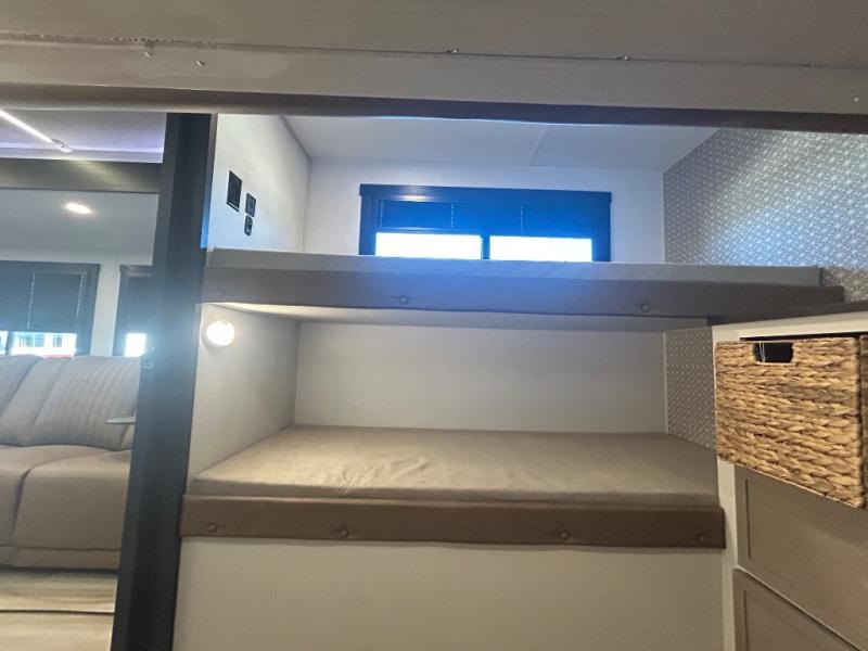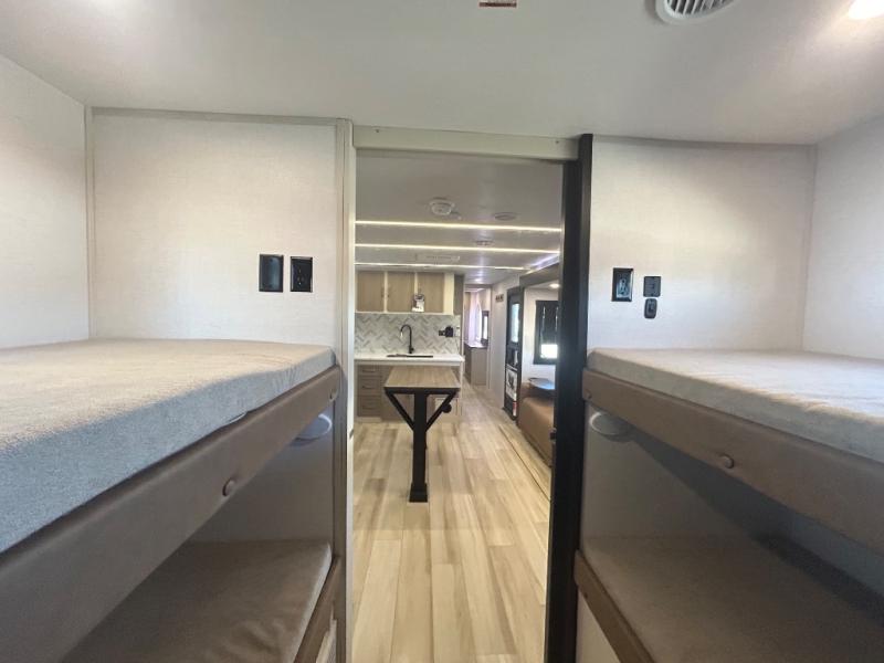 This is the perfect travel trailer if you enjoy camping with a larger group! The rear private bunkhouse includes four bunk beds plus a dresser to keep this space tidy. You'll have the queen bed slide out in the front bedroom all to yourselves, along with a dresser and an ottoman, plus a front wardrobe with washer/dryer prep. Everyone can meet in the combined kitchen and living area that includes spacious theater seating, a kitchen island with four chairs, full kitchen amenities, and dual opposing slides for more space!