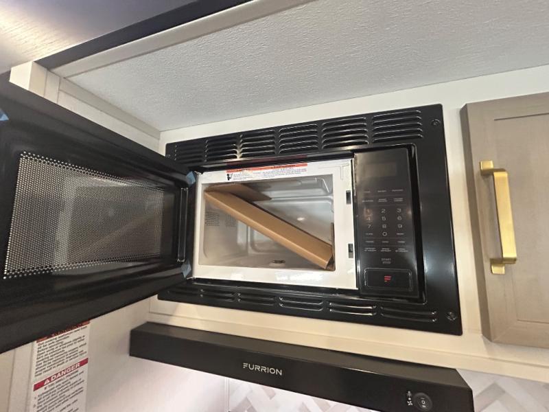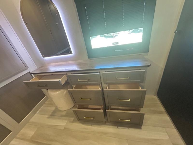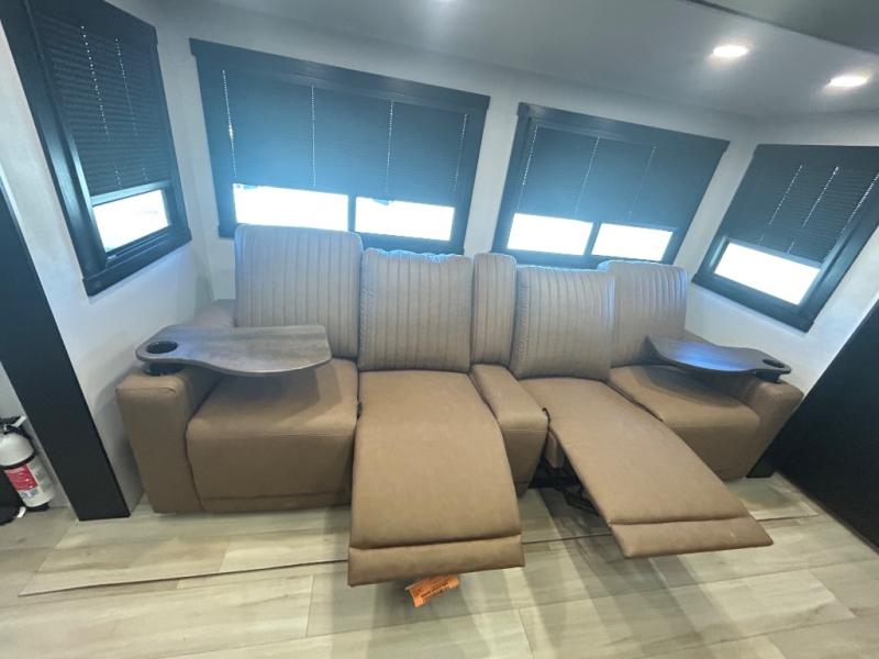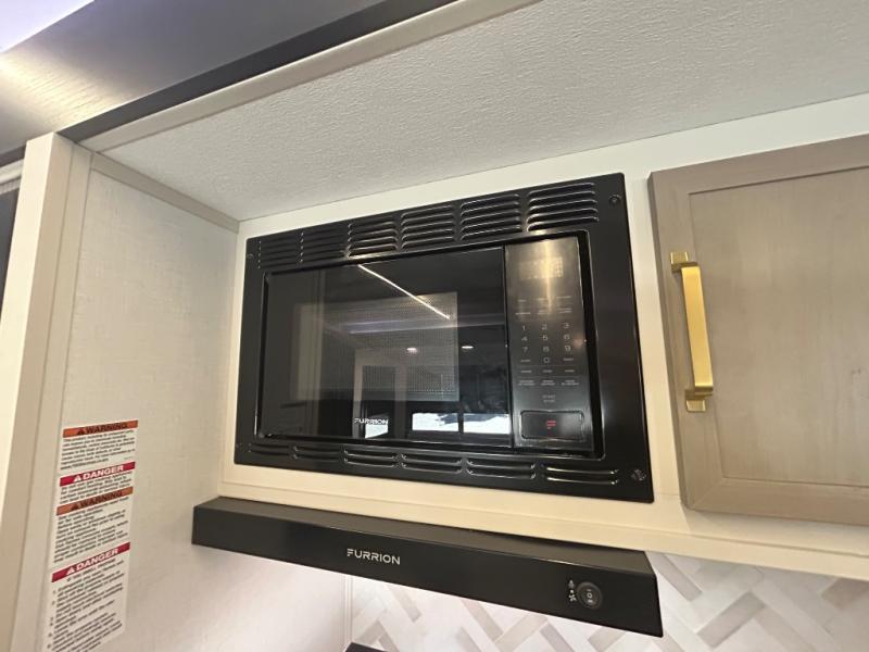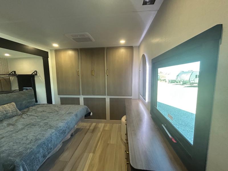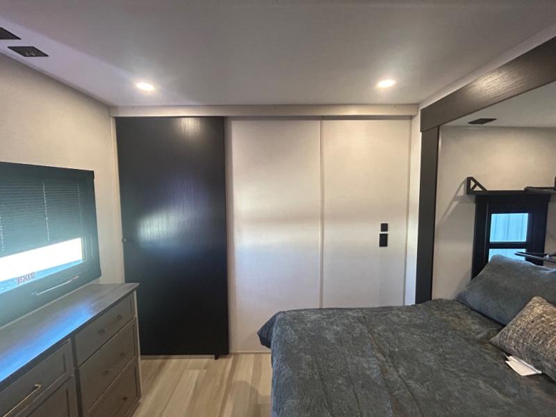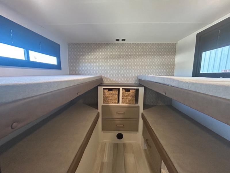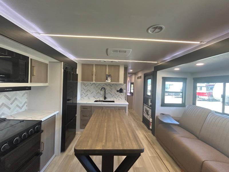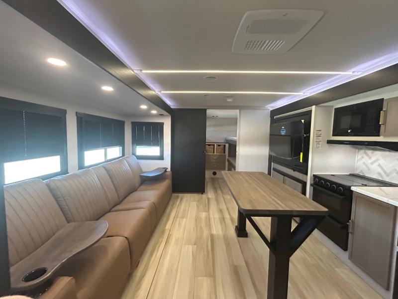 This is the perfect travel trailer if you enjoy camping with a larger group! The rear private bunkhouse includes four bunk beds plus a dresser to keep this space tidy. You'll have the queen bed slide out in the front bedroom all to yourselves, along with a dresser and an ottoman, plus a front wardrobe with washer/dryer prep. Everyone can meet in the combined kitchen and living area that includes spacious theater seating, a kitchen island with four chairs, full kitchen amenities, and dual opposing slides for more space!