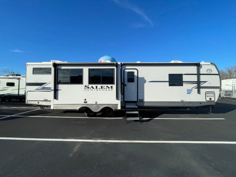 The Salem Hemisphere travel trailers by Forest River are packed with features, while still being value-minded! Each model is constructed with laminated "Aluma Frame" sidewalls and floor with block foam insulation plus an enclosed underbelly with 12V tank heaters on all holding tanks. There are LED awning, marker and taillights outside, along with an extra-large pass-thru storage with slam latch baggage doors, plus solar prep and Lippert On-The-Go ladder prep. The 60K on-demand tankless water heater will provide endless hot showers, and the JBL sound system includes a head unit plus interior and exterior speakers to keep the party going. There are also many interior comforts found throughout that will make you feel right at home!