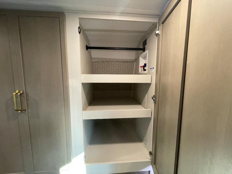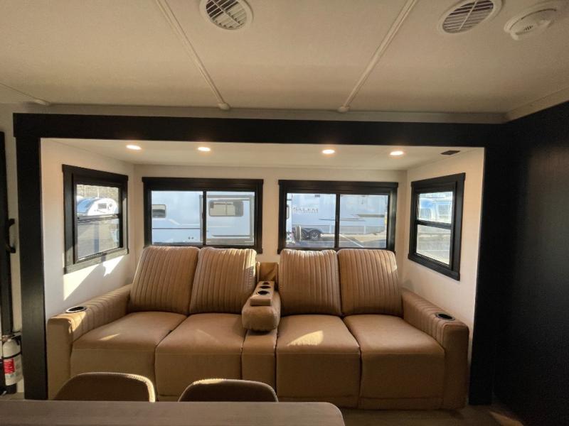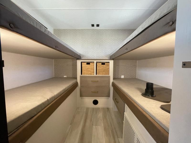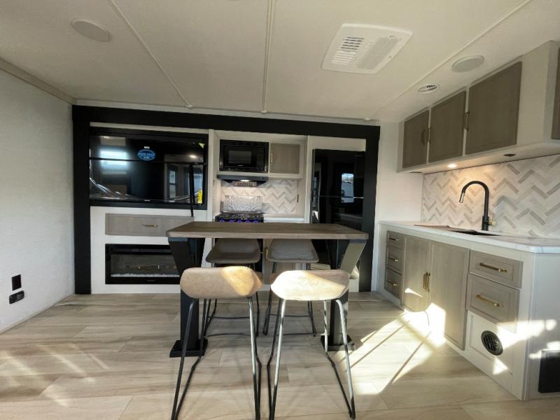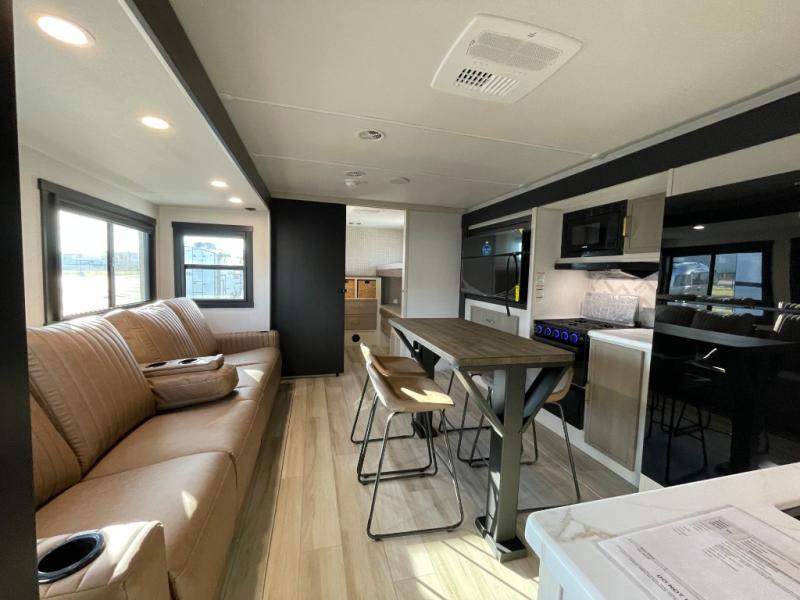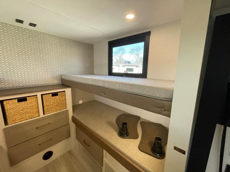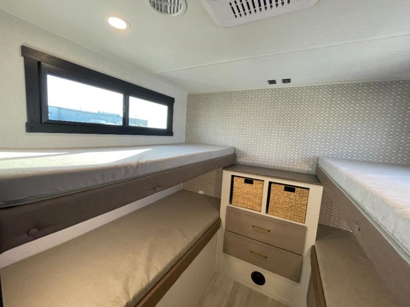This is the perfect travel trailer if you enjoy camping with a larger group! The rear private bunkhouse includes four bunk beds plus a dresser to keep this space tidy. You'll have the queen bed slide out in the front bedroom all to yourselves, along with a dresser and an ottoman, plus a front wardrobe with washer/dryer prep. Everyone can meet in the combined kitchen and living area that includes spacious theater seating, a kitchen island with four chairs, full kitchen amenities, and dual opposing slides for more space!