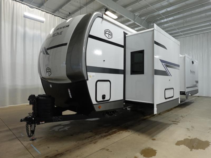 The Salem Hemisphere fifth wheels and travel trailers by Forest River are packed with features, while still being value-minded! Each model is constructed with laminated "Aluma Frame" sidewalls and floor with block foam insulation plus full length barreled ceilings for added head space. There are LED awning, marker and tail lights outside, along with an extra large pass-thru storage with slam latch baggage doors, plus solar prep and Lippert On-The-Go ladder prep. The 60K on-demand tankless water heater will provide endless hot showers, and the JBL sound system includes a head unit plus interior and exterior speakers to keep the party going. There are also many interior comforts found throughout that will make you feel right at home!