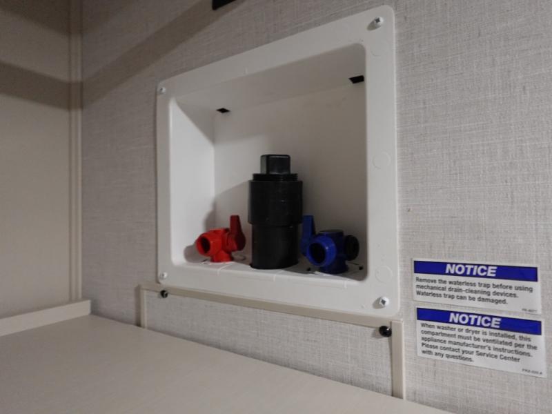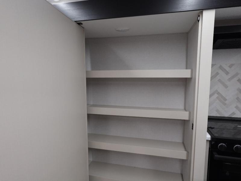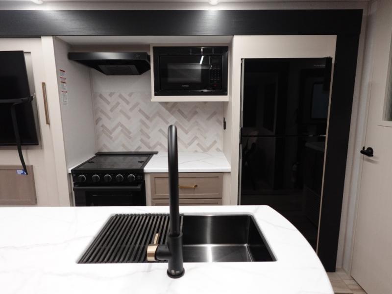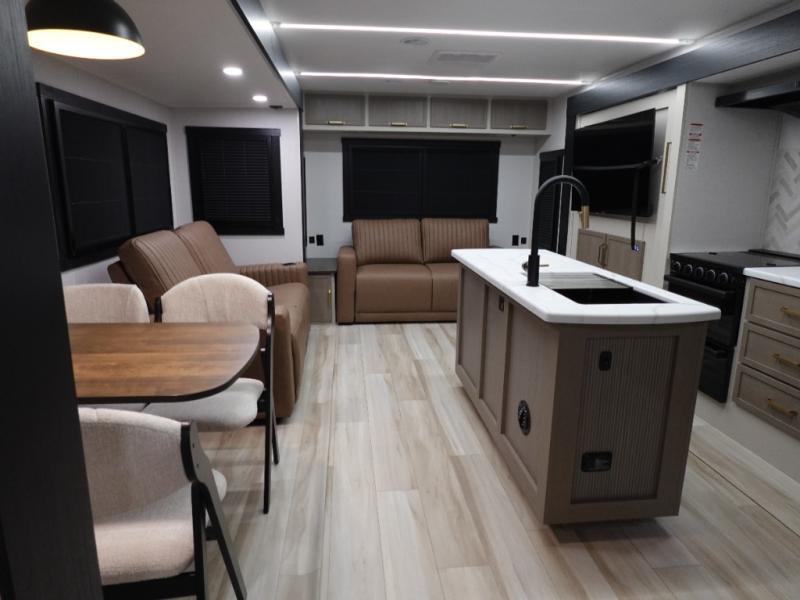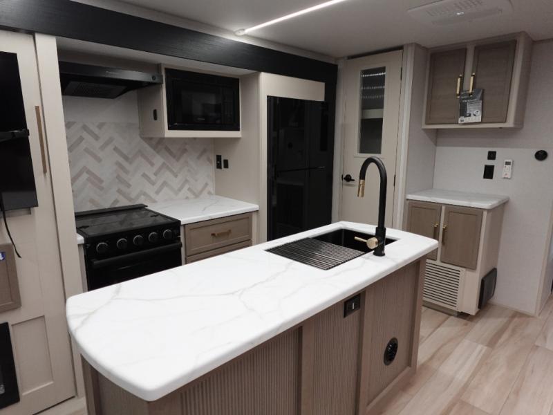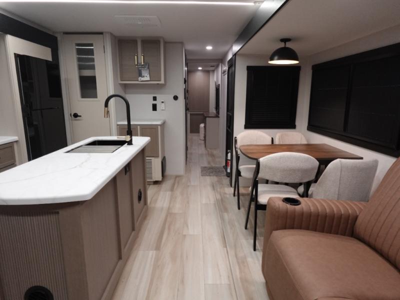 This travel trailer is decked out in features you will love like the front walk-in wardrobe with washer/dryer prep inside the front private bedroom! The full bathroom has everything you will need to get squeaky clean each morning including a residential walk-in shower with a skylight to let in some natural lighting. There is a hutch for you to store your dishes and a kitchen island to make meal prepping even easier. Once you have created a delicious meal, you can head to the dinette and enjoy eating it there comfortably while enjoying your view out of the panoramic window!