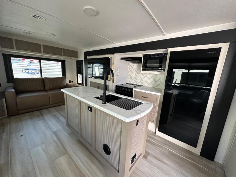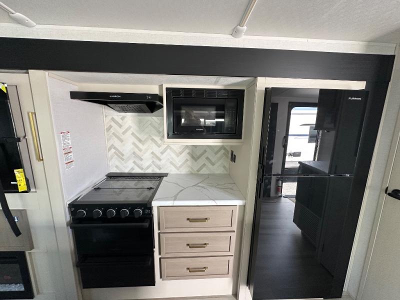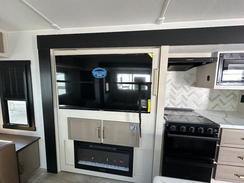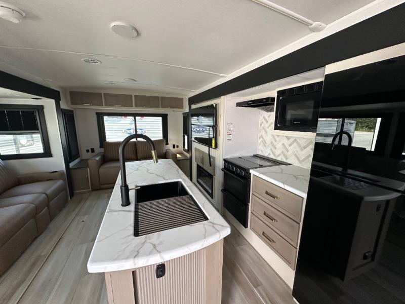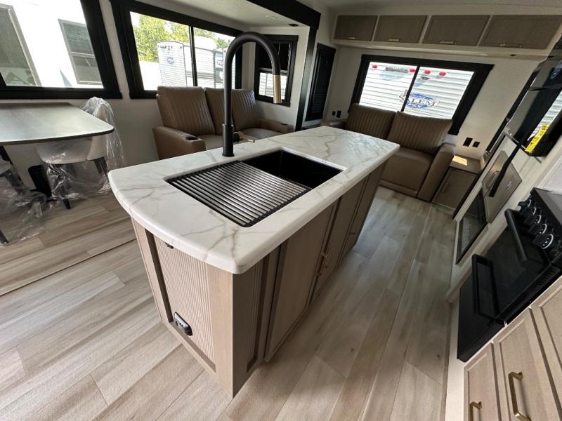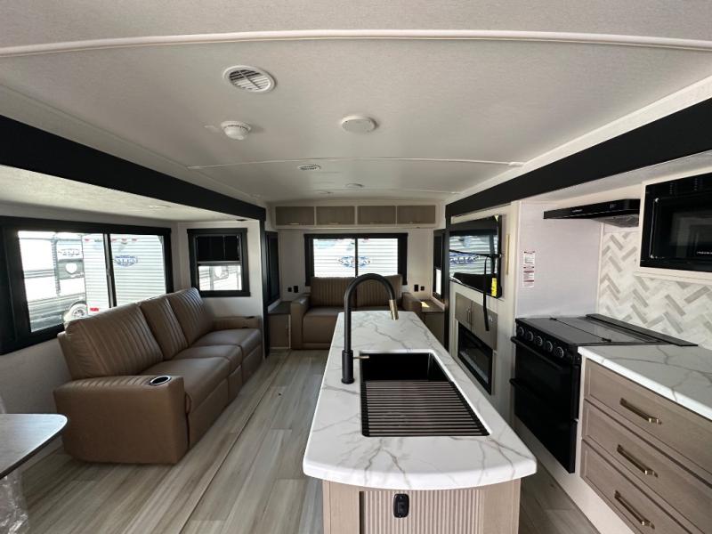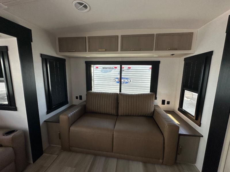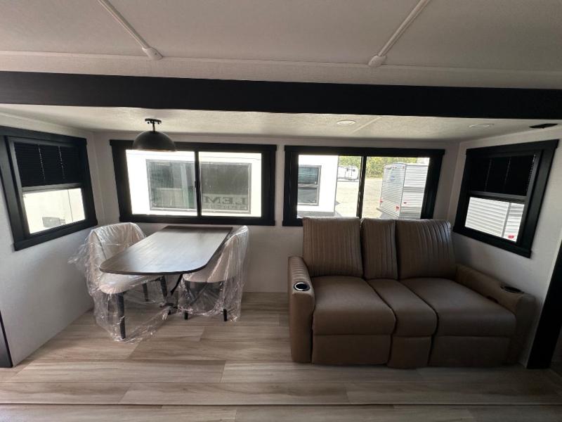 This travel trailer is decked out in features you will love like the front walk-in wardrobe with washer/dryer prep inside the front private bedroom! The full bathroom has everything you will need to get squeaky clean each morning including a residential walk-in shower with a skylight to let in some natural lighting. There is a hutch for you to store your dishes and a kitchen island to make meal prepping even easier. Once you have created a delicious meal, you can head to the booth dinette and enjoy eating it there comfortably while enjoying your view out of the panoramic window!