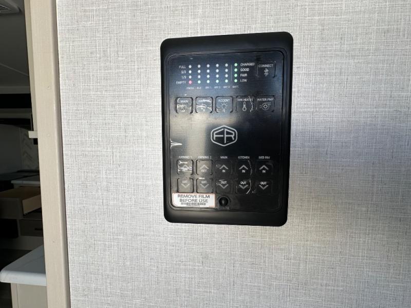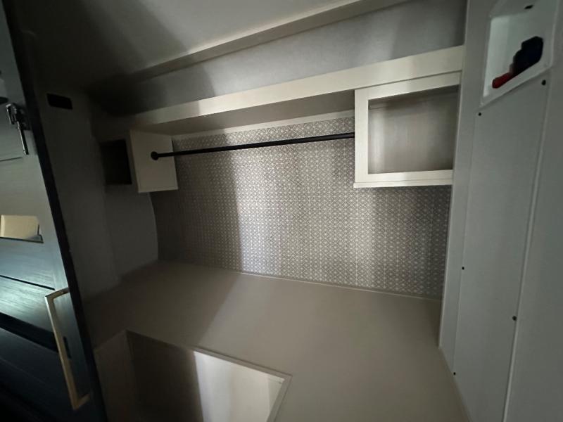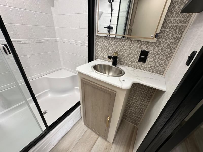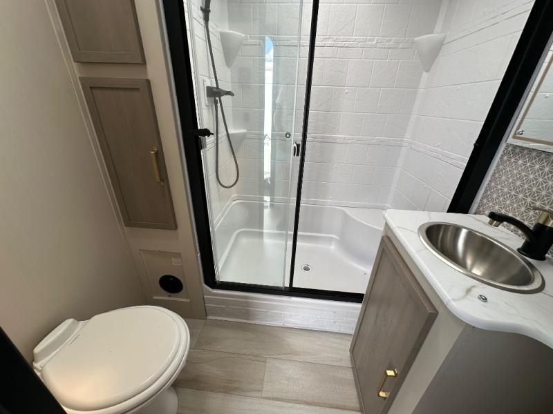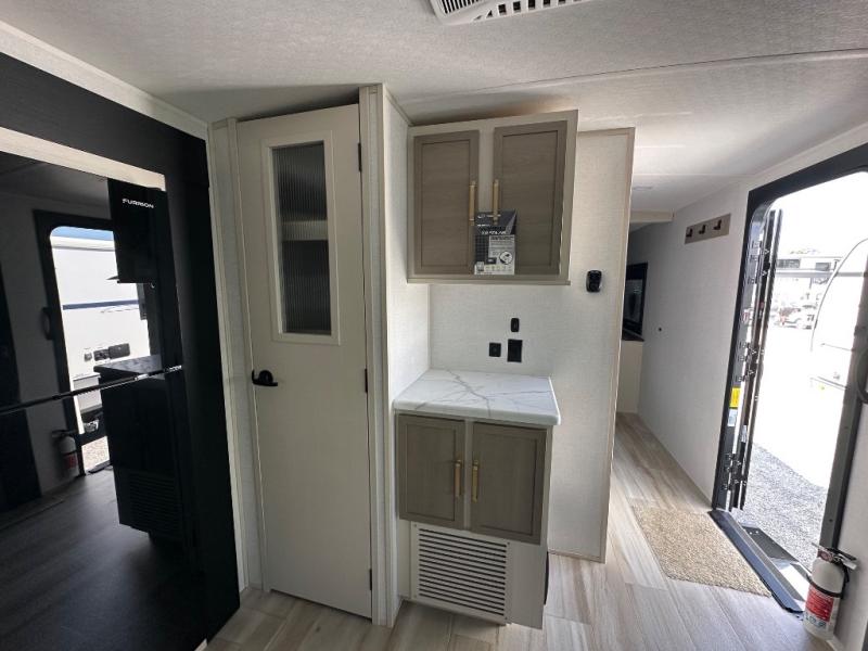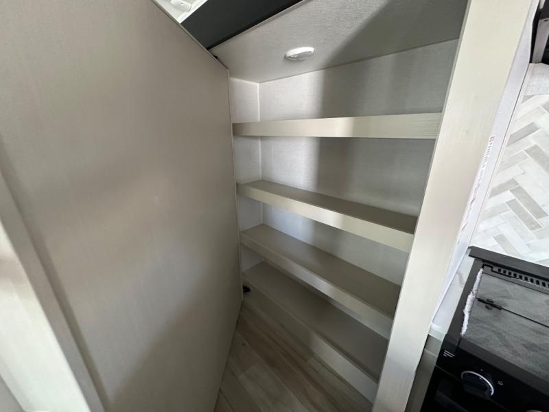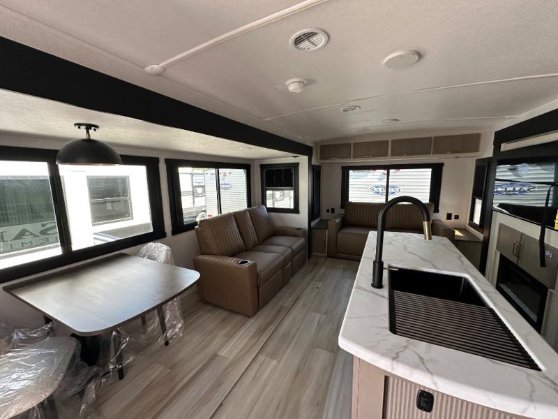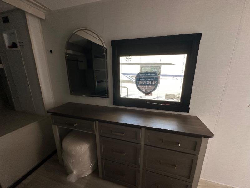 This travel trailer is decked out in features you will love like the front walk-in wardrobe with washer/dryer prep inside the front private bedroom! The full bathroom has everything you will need to get squeaky clean each morning including a residential walk-in shower with a skylight to let in some natural lighting. There is a hutch for you to store your dishes and a kitchen island to make meal prepping even easier. Once you have created a delicious meal, you can head to the booth dinette and enjoy eating it there comfortably while enjoying your view out of the panoramic window!