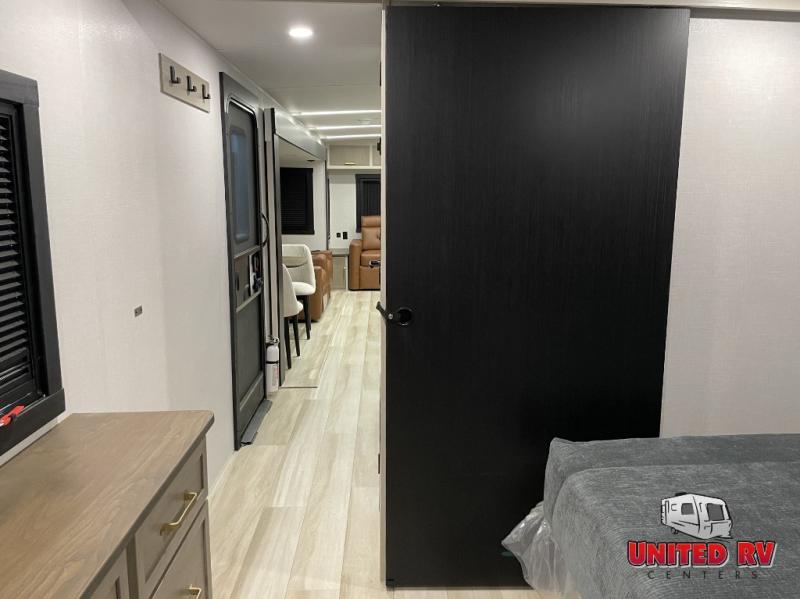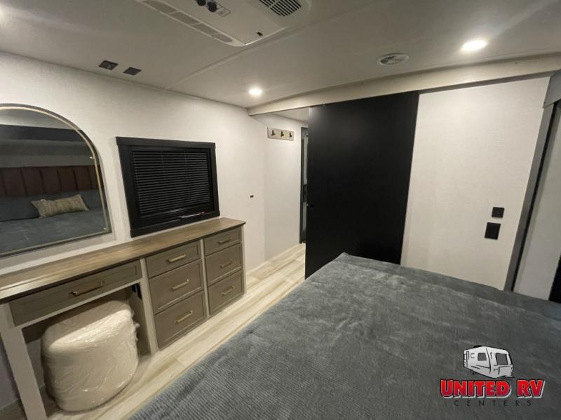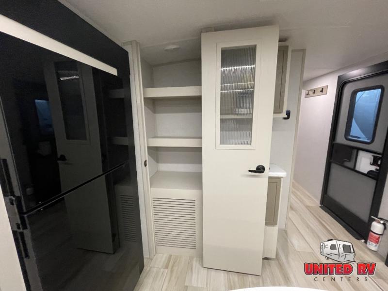 This travel trailer is decked out in features you will love like the front walk-in wardrobe with washer/dryer prep inside the front private bedroom! The full bathroom has everything you will need to get squeaky clean each morning including a residential walk-in shower with a skylight to let in some natural lighting. There is a hutch for you to store your dishes and a kitchen island to make meal prepping even easier. Once you have created a delicious meal, you can head to the booth dinette and enjoy eating it there comfortably while enjoying your view out of the panoramic window!