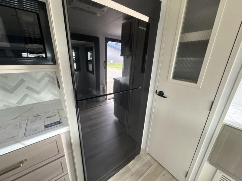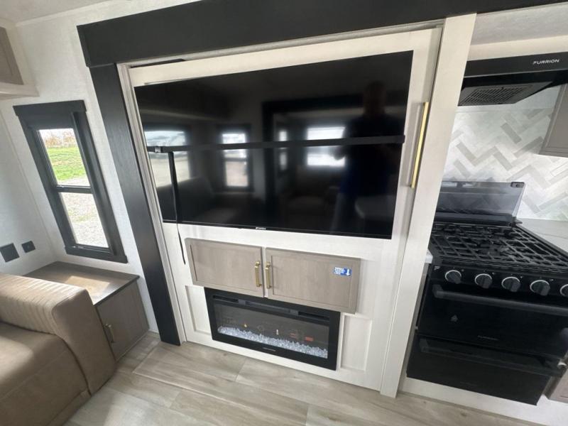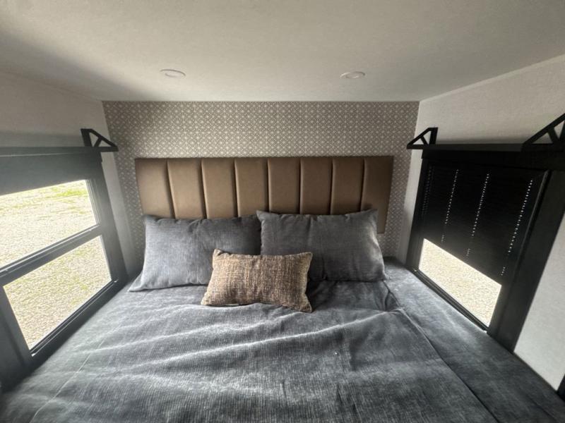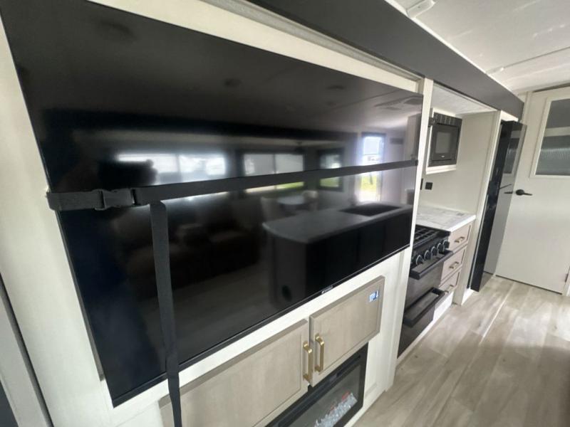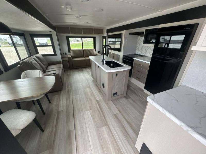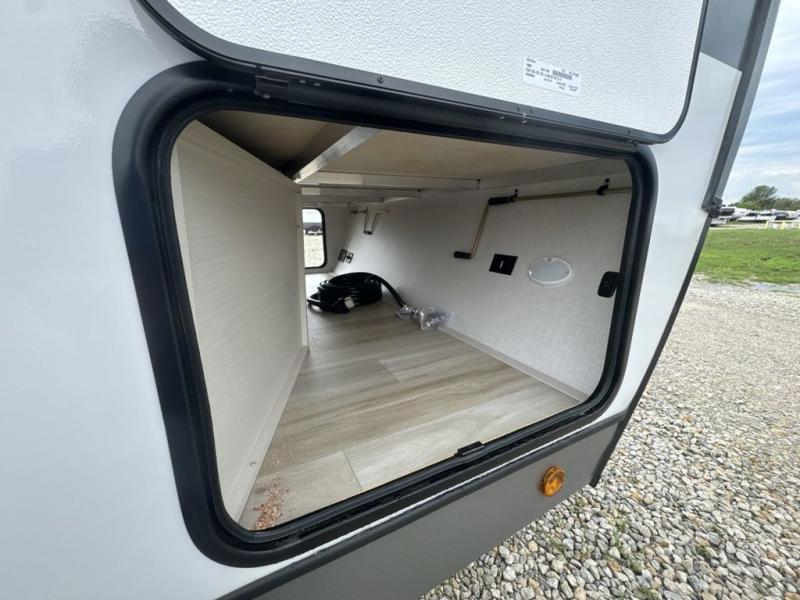 This travel trailer is decked out in features you will love like the front walk-in wardrobe with washer/dryer prep inside the front private bedroom! The full bathroom has everything you will need to get squeaky clean each morning including a residential walk-in shower with a skylight to let in some natural lighting. There is a hutch for you to store your dishes and a kitchen island to make meal prepping even easier. Once you have created a delicious meal, you can head to the booth dinette and enjoy eating it there comfortably while enjoying your view out of the panoramic window!