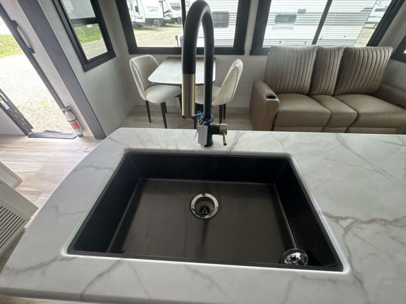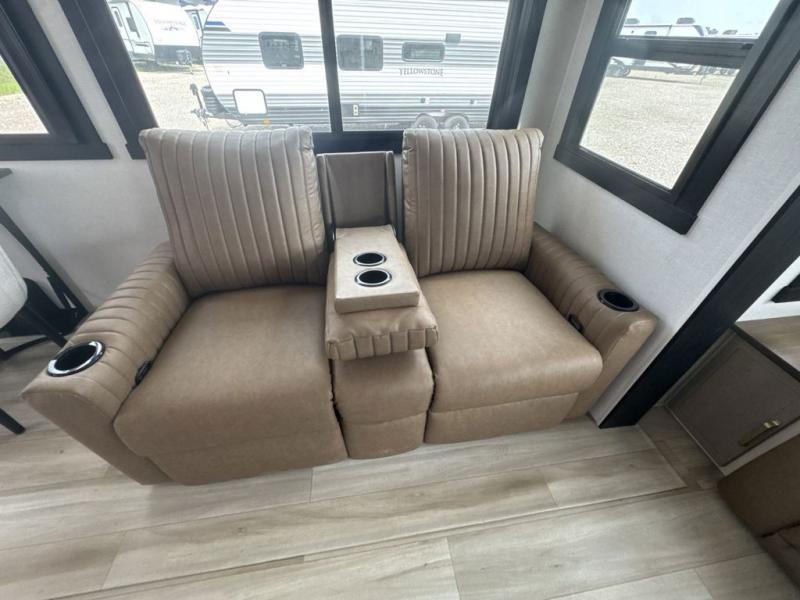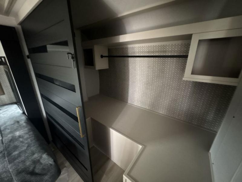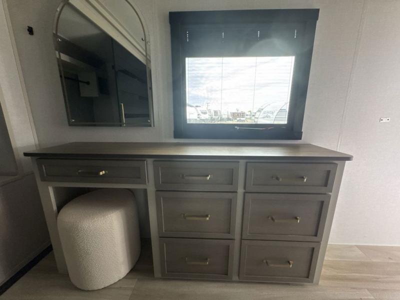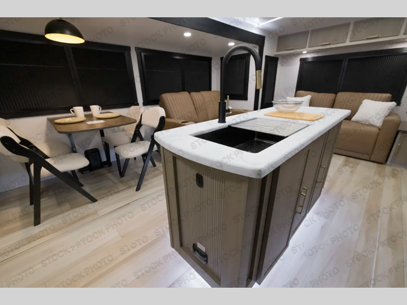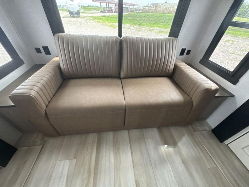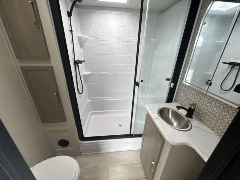 This travel trailer is decked out in features you will love like the front walk-in wardrobe with washer/dryer prep inside the front private bedroom! The full bathroom has everything you will need to get squeaky clean each morning including a residential walk-in shower with a skylight to let in some natural lighting. There is a hutch for you to store your dishes and a kitchen island to make meal prepping even easier. Once you have created a delicious meal, you can head to the booth dinette and enjoy eating it there comfortably while enjoying your view out of the panoramic window!