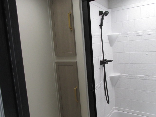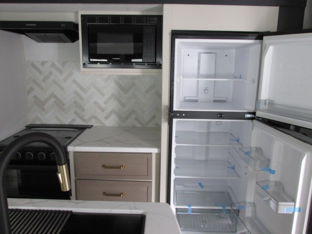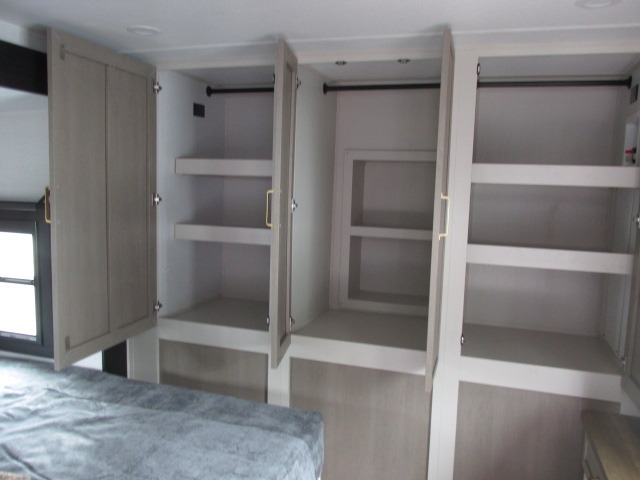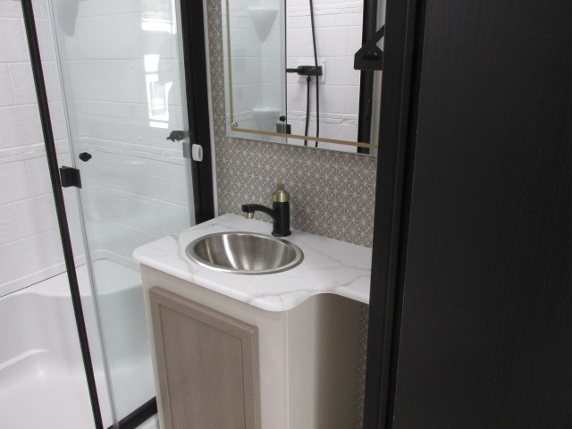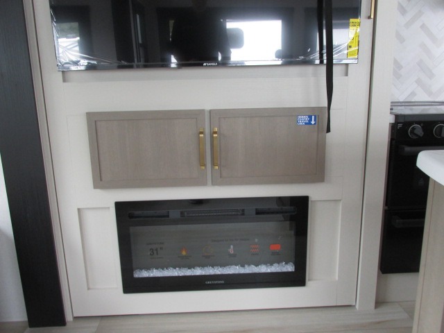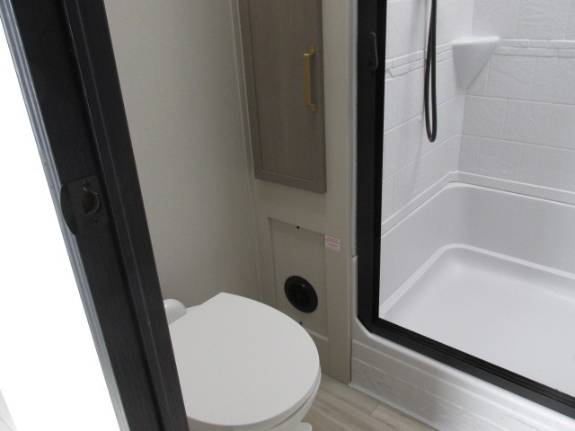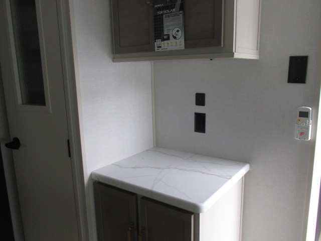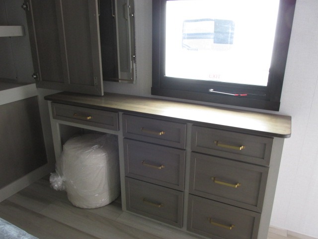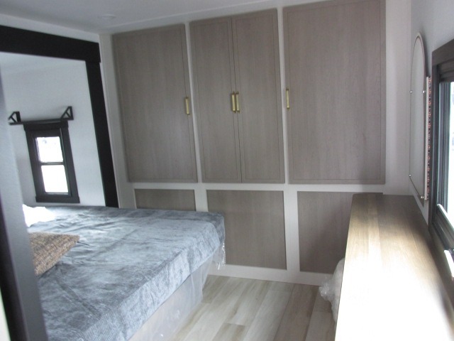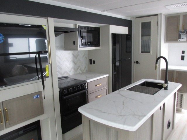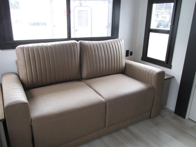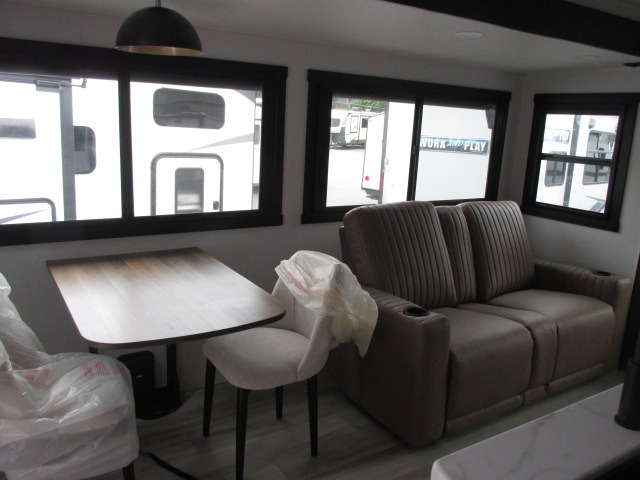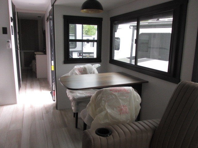 This travel trailer is decked out in features you will love like the front walk-in wardrobe with washer/dryer prep inside the front private bedroom! The full bathroom has everything you will need to get squeaky clean each morning including a residential walk-in shower with a skylight to let in some natural lighting. There is a hutch for you to store your dishes and a kitchen island to make meal prepping even easier. Once you have created a delicious meal, you can head to the booth dinette and enjoy eating it there comfortably while enjoying your view out of the panoramic window!