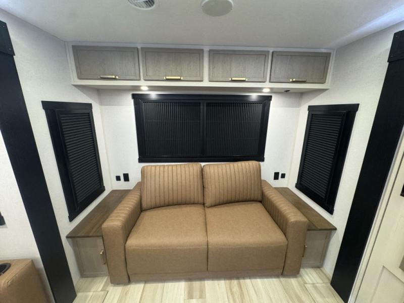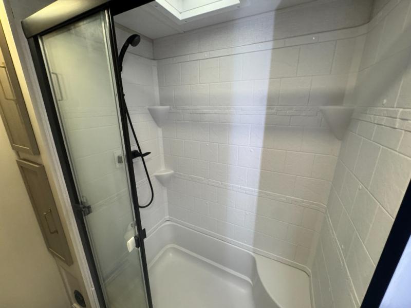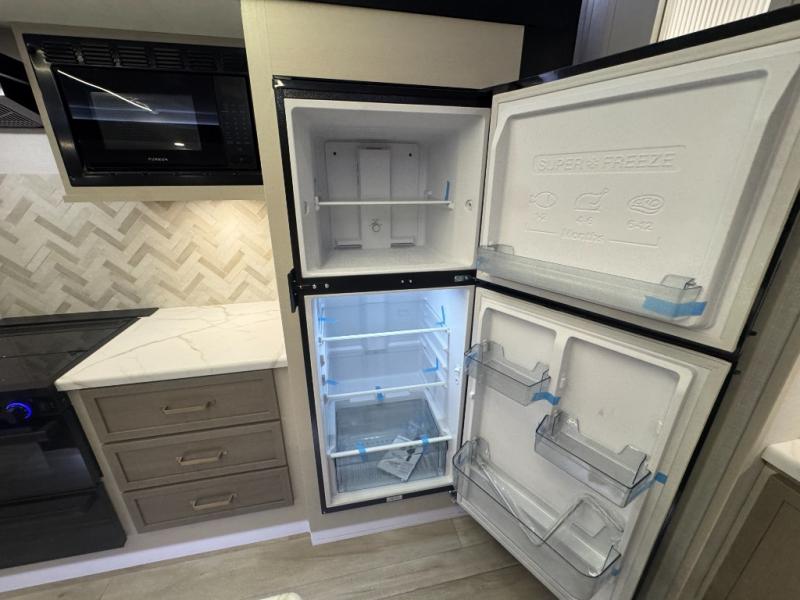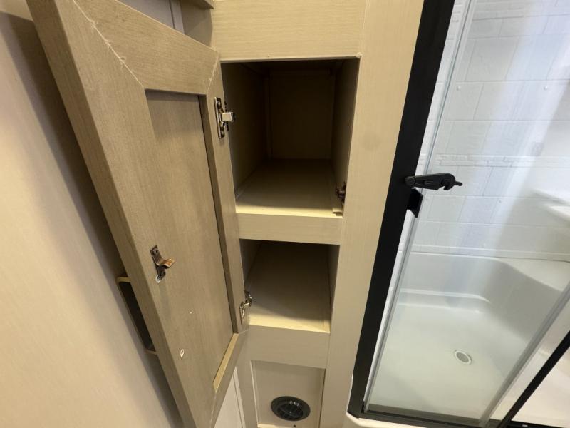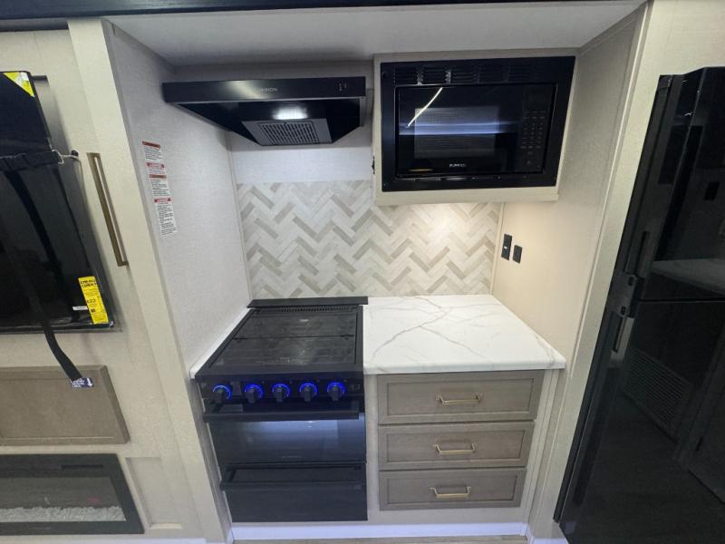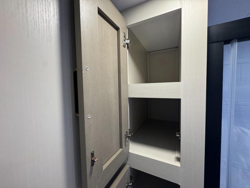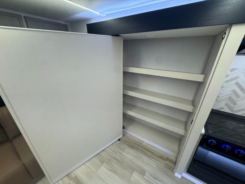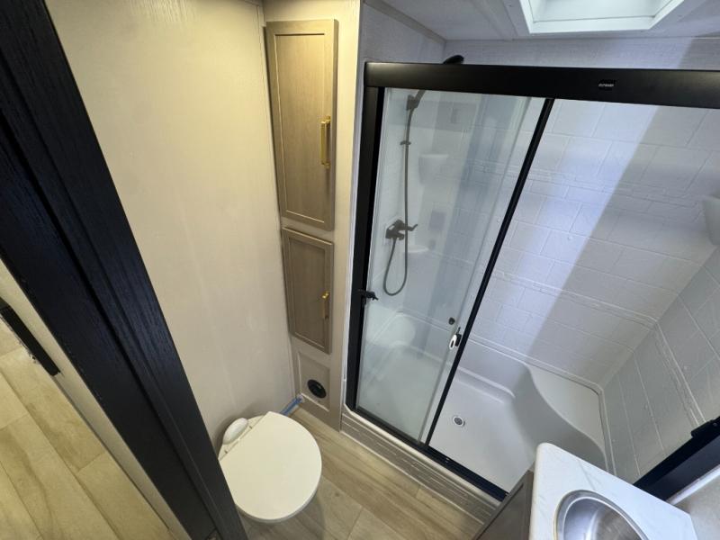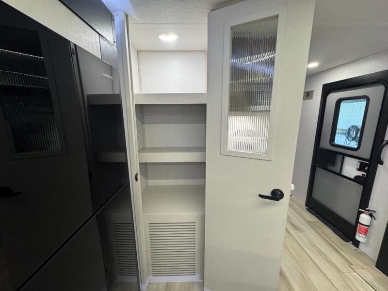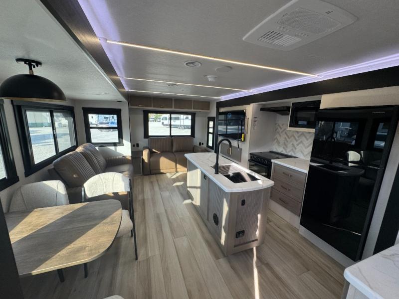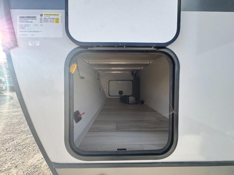 This travel trailer is decked out in features you will love like the front walk-in wardrobe with washer/dryer prep inside the front private bedroom! The full bathroom has everything you will need to get squeaky clean each morning including a residential walk-in shower with a skylight to let in some natural lighting. There is a hutch for you to store your dishes and a kitchen island to make meal prepping even easier. Once you have created a delicious meal, you can head to the booth dinette and enjoy eating it there comfortably while enjoying your view out of the panoramic window!