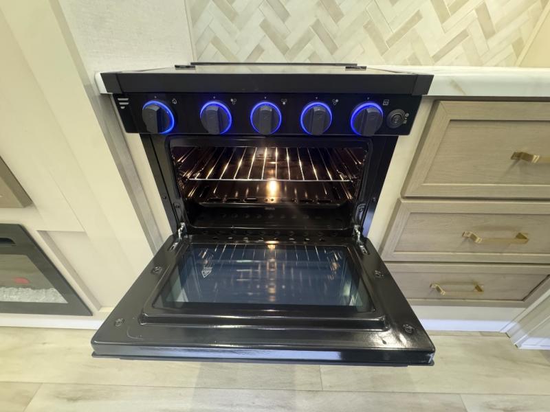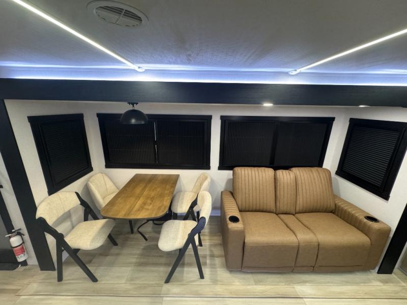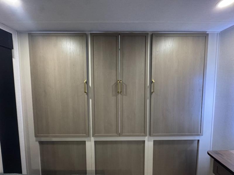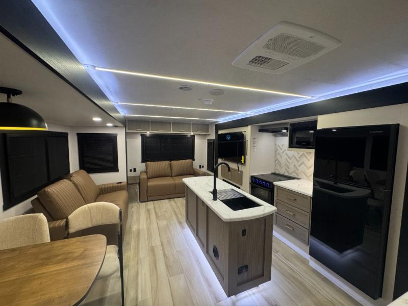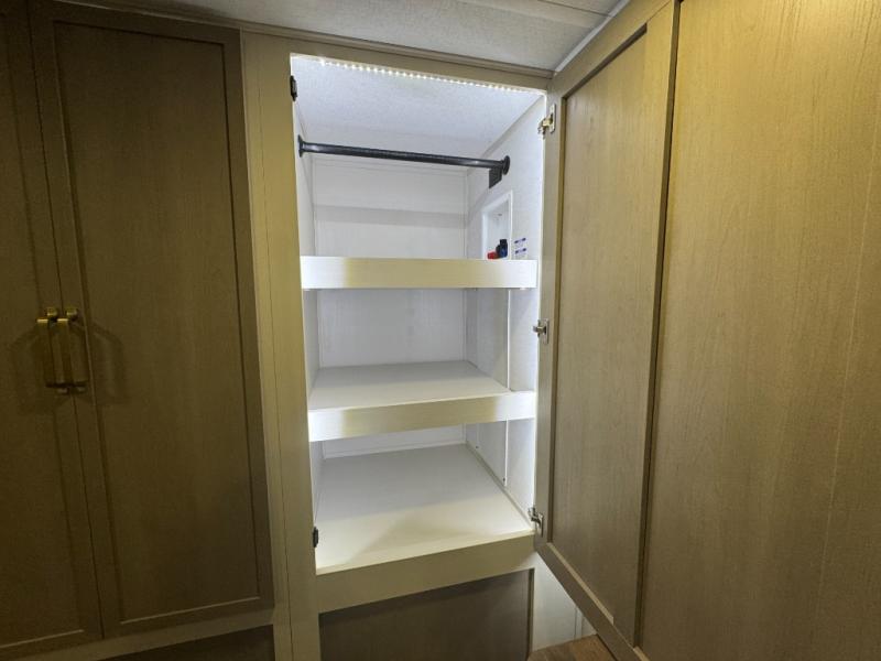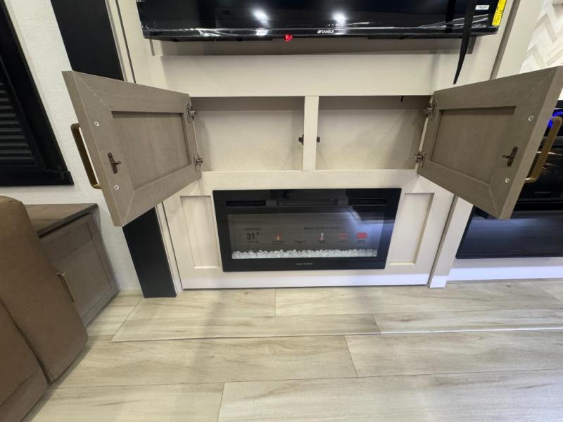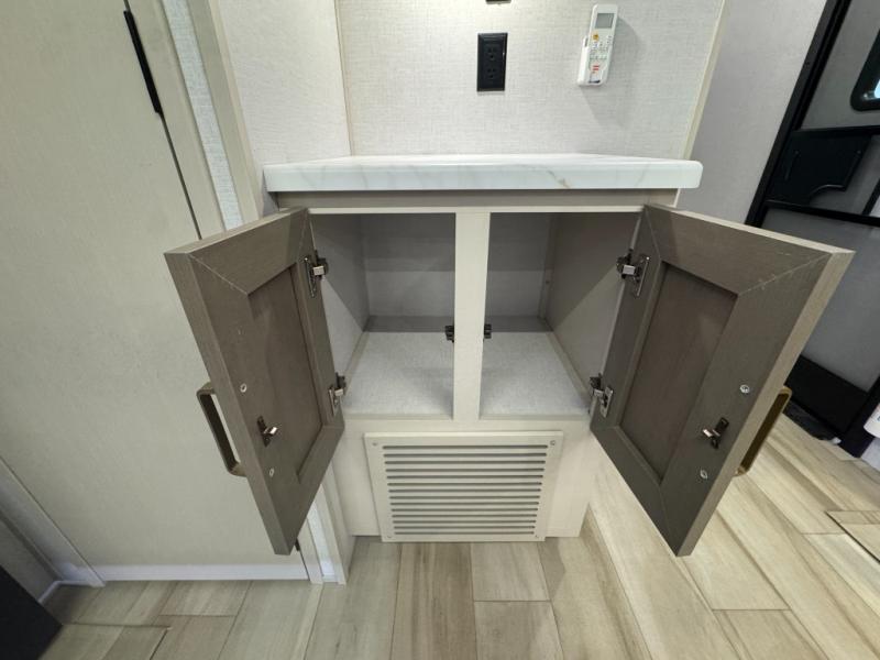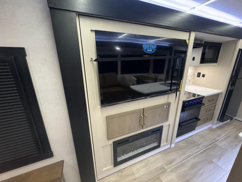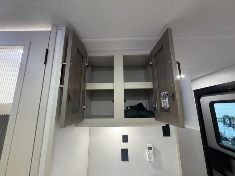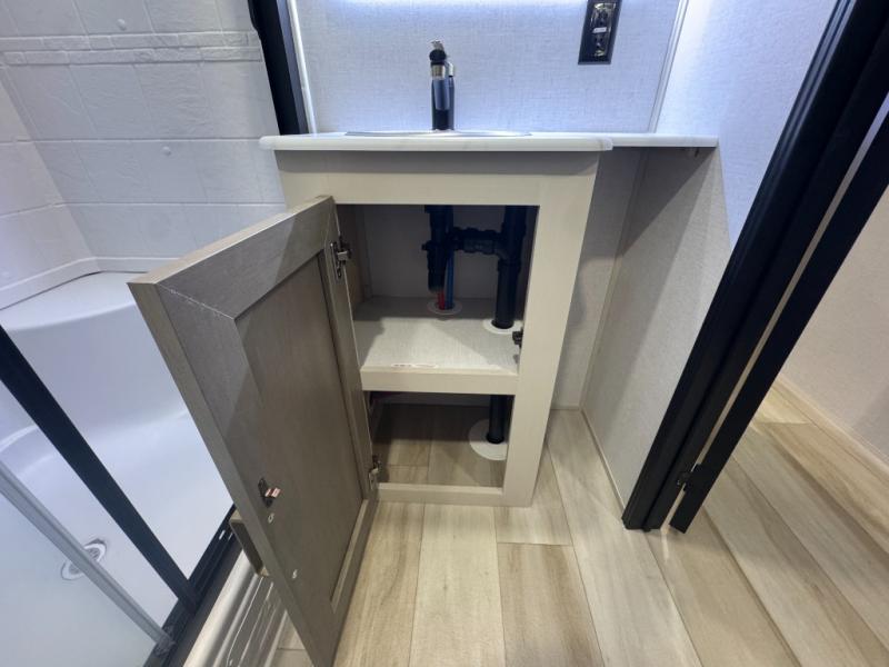This travel trailer is decked out in features you will love like the front walk-in wardrobe with washer/dryer prep inside the front private bedroom! The full bathroom has everything you will need to get squeaky clean each morning including a residential walk-in shower with a skylight to let in some natural lighting. There is a hutch for you to store your dishes and a kitchen island to make meal prepping even easier. Once you have created a delicious meal, you can head to the booth dinette and enjoy eating it there comfortably while enjoying your view out of the panoramic window!
