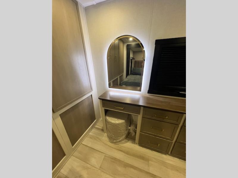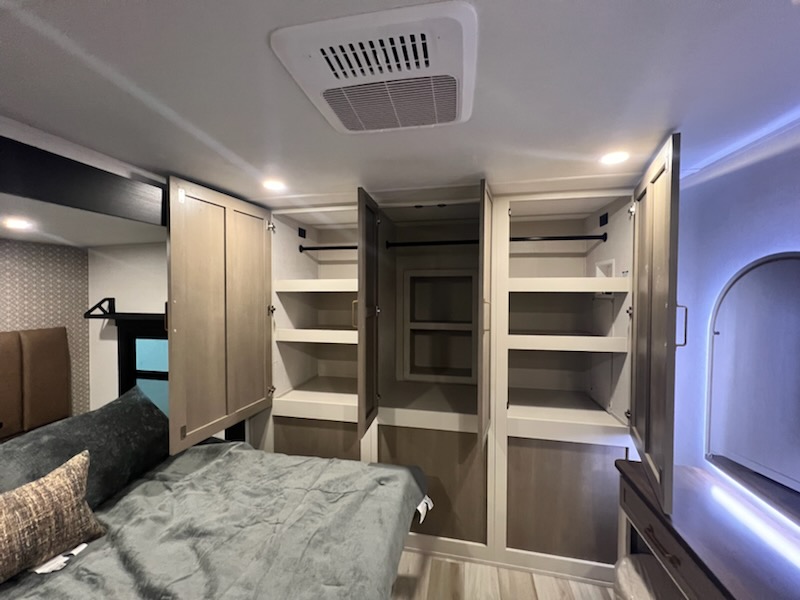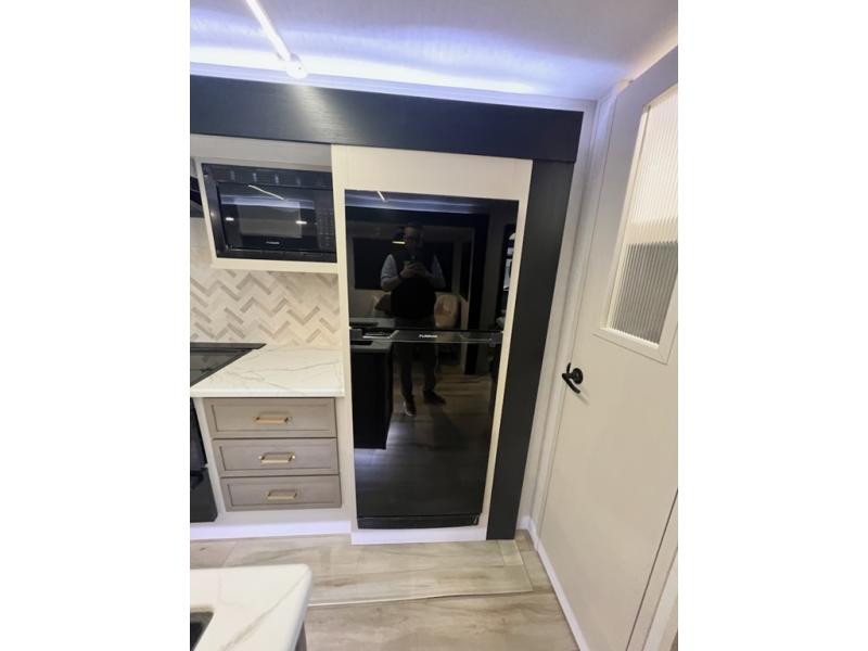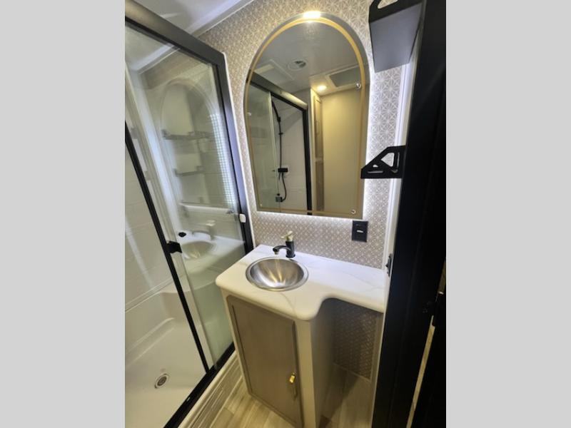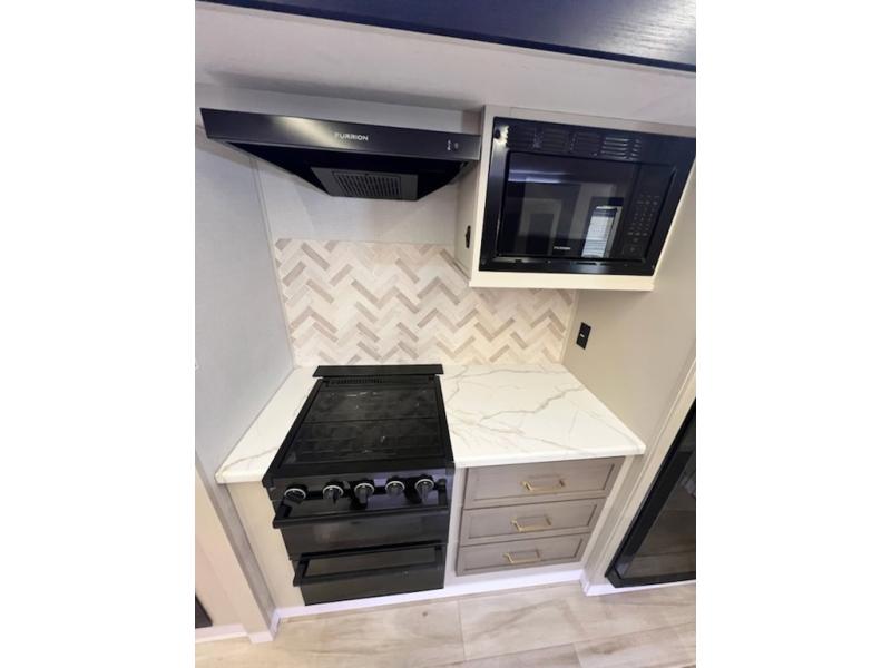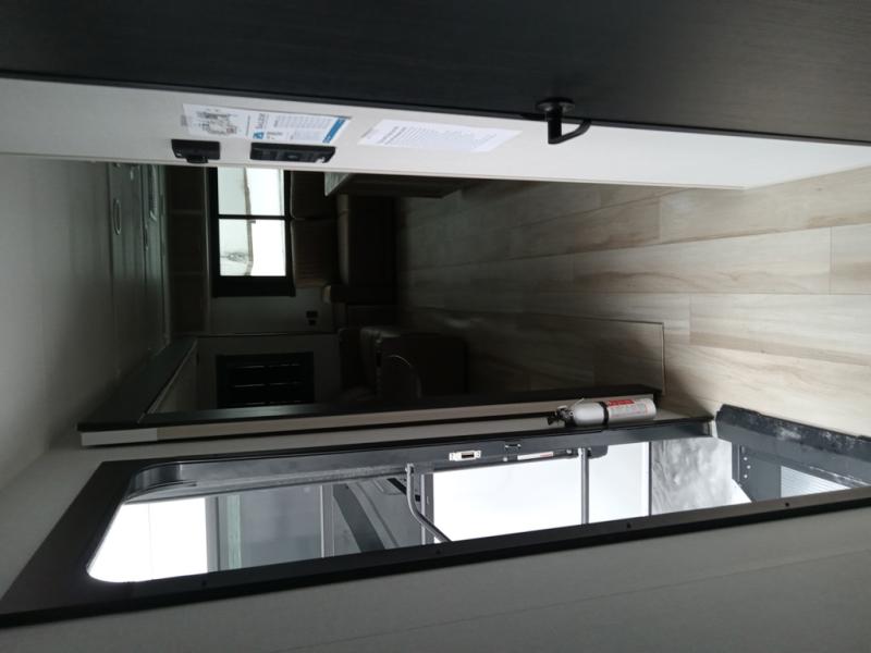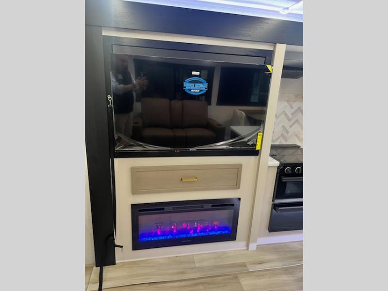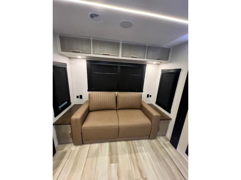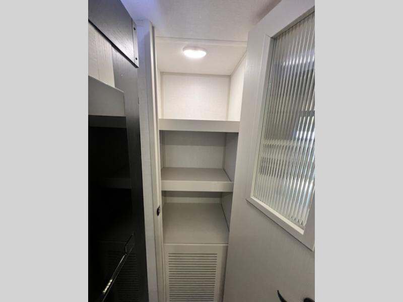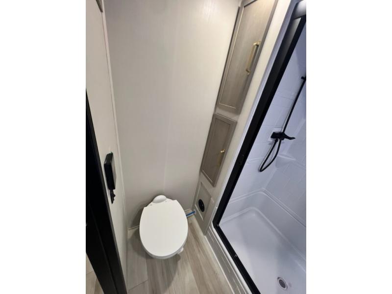 This travel trailer is decked out in features you will love like the front walk-in wardrobe with washer/dryer prep inside the front private bedroom! The full bathroom has everything you will need to get squeaky clean each morning including a residential walk-in shower with a skylight to let in some natural lighting. There is a hutch for you to store your dishes and a kitchen island to make meal prepping even easier. Once you have created a delicious meal, you can head to the booth dinette and enjoy eating it there comfortably while enjoying your view out of the panoramic window!
