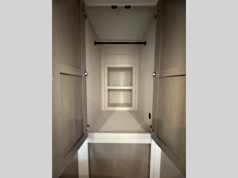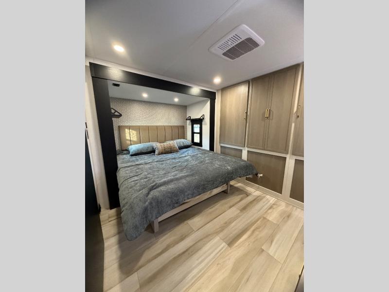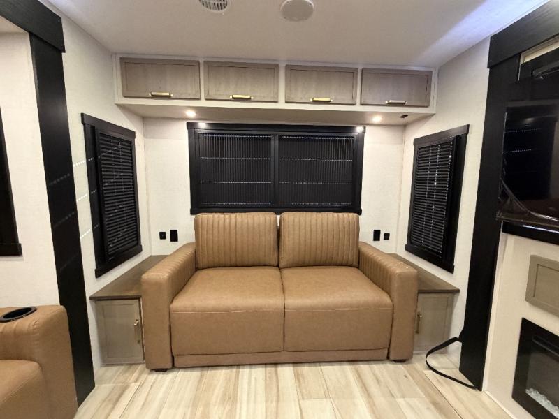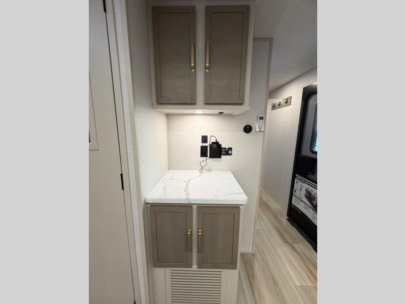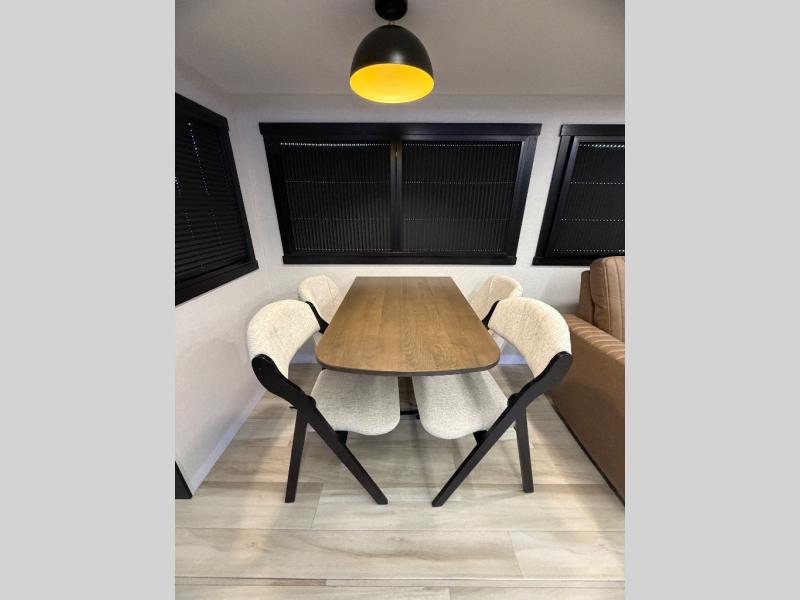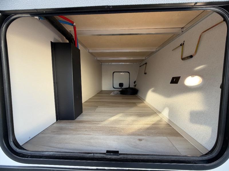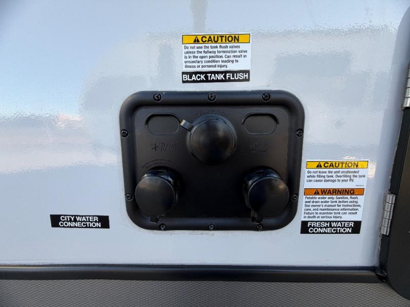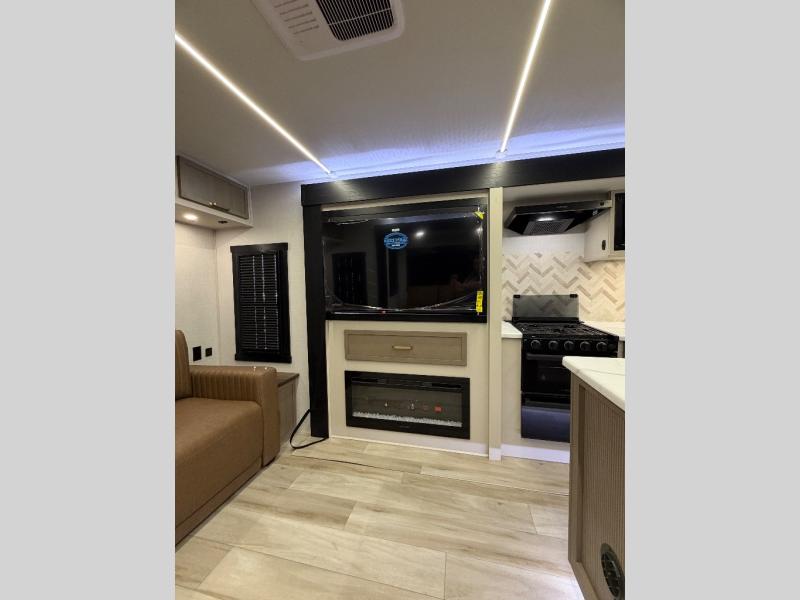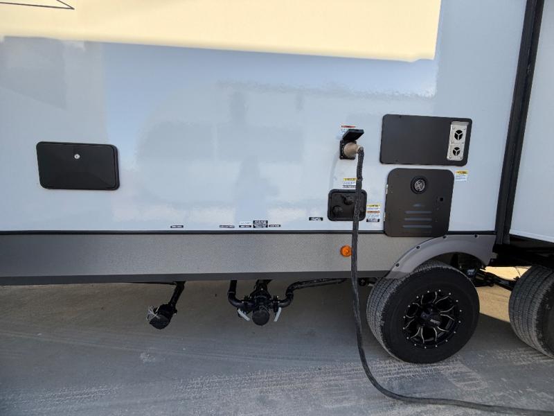This travel trailer is decked out in features you will love like the front walk-in wardrobe with washer/dryer prep inside the front private bedroom! The full bathroom has everything you will need to get squeaky clean each morning including a residential walk-in shower with a skylight to let in some natural lighting. There is a hutch for you to store your dishes and a kitchen island to make meal prepping even easier. Once you have created a delicious meal, you can head to the booth dinette and enjoy eating it there comfortably while enjoying your view out of the panoramic window!