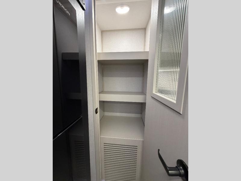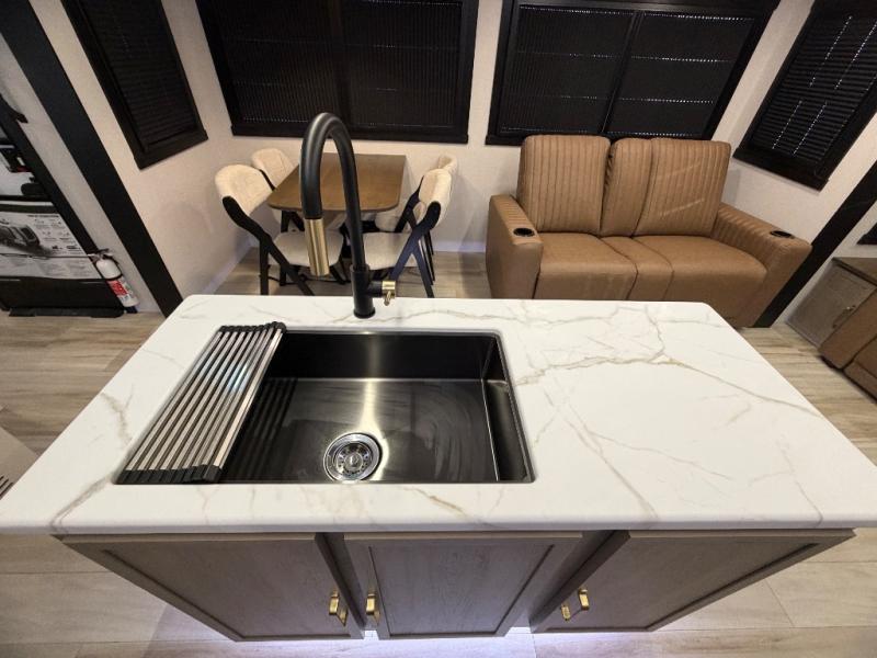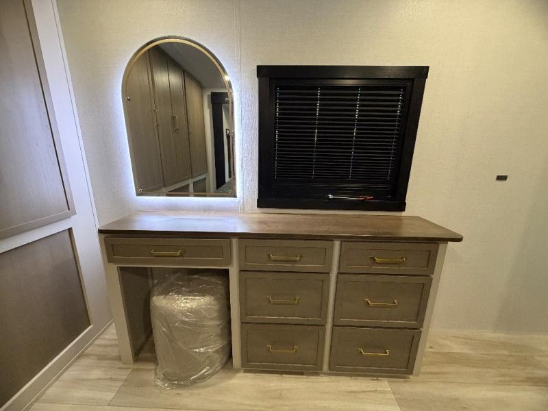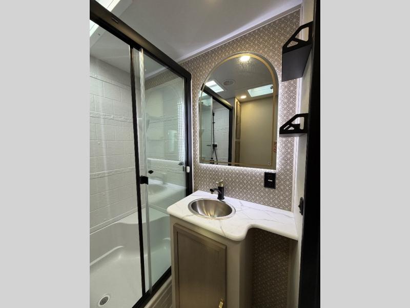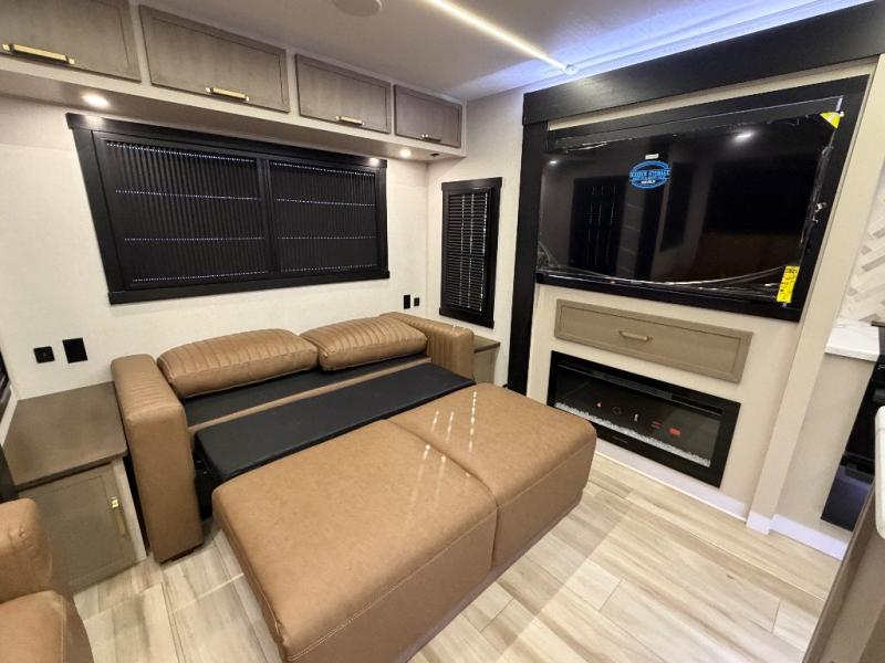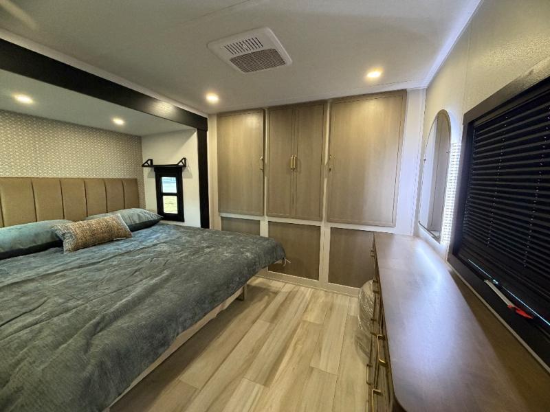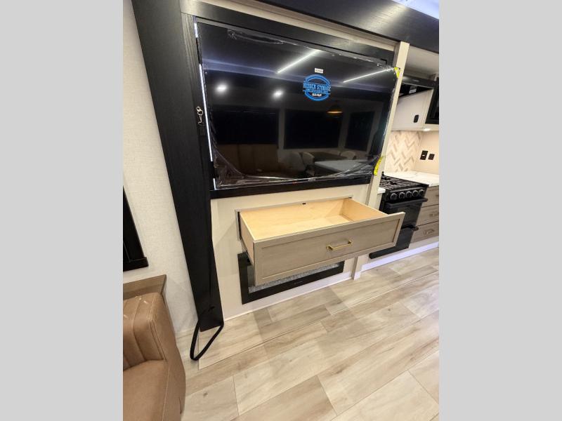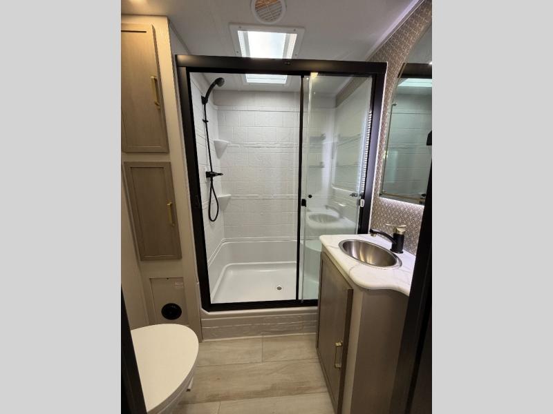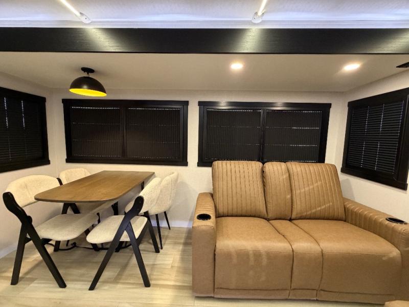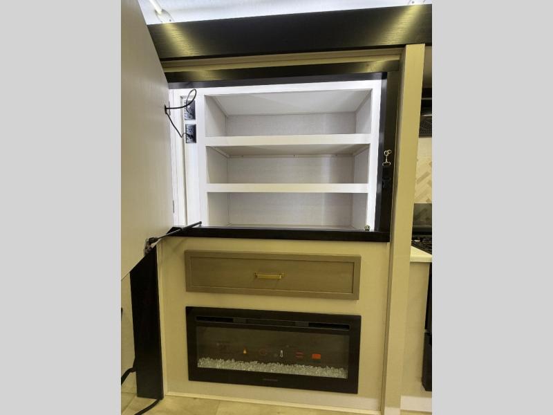 This travel trailer is decked out in features you will love like the front walk-in wardrobe with washer/dryer prep inside the front private bedroom! The full bathroom has everything you will need to get squeaky clean each morning including a residential walk-in shower with a skylight to let in some natural lighting. There is a hutch for you to store your dishes and a kitchen island to make meal prepping even easier. Once you have created a delicious meal, you can head to the booth dinette and enjoy eating it there comfortably while enjoying your view out of the panoramic window!