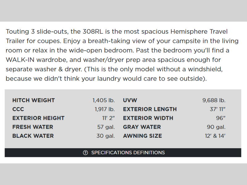 | Awning Info | 12' and 14' with LED Lights |