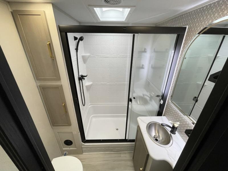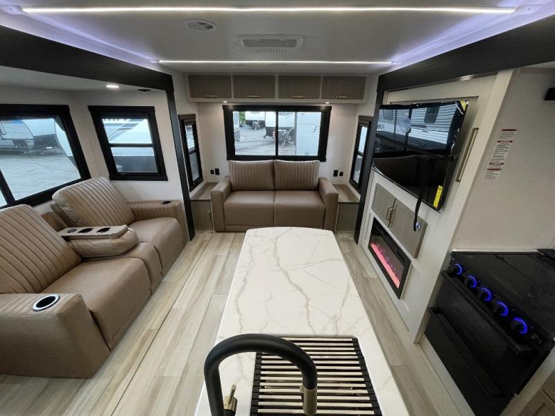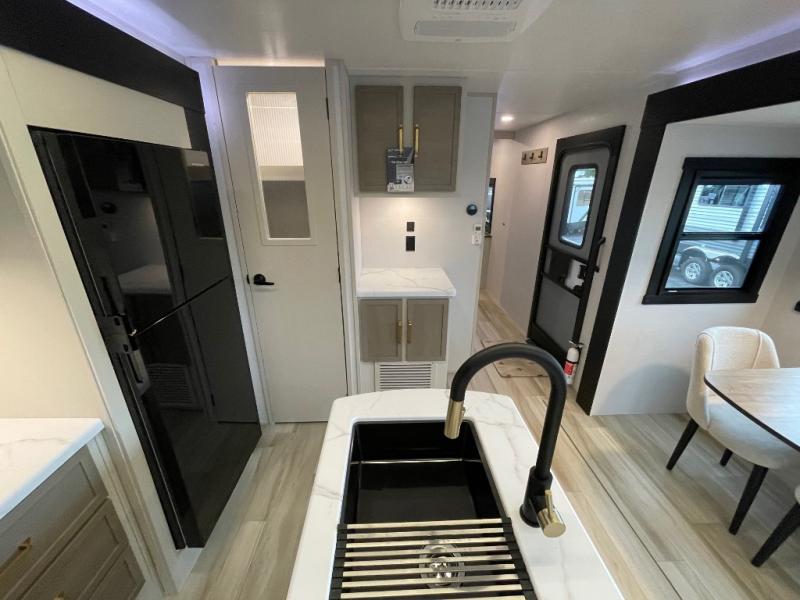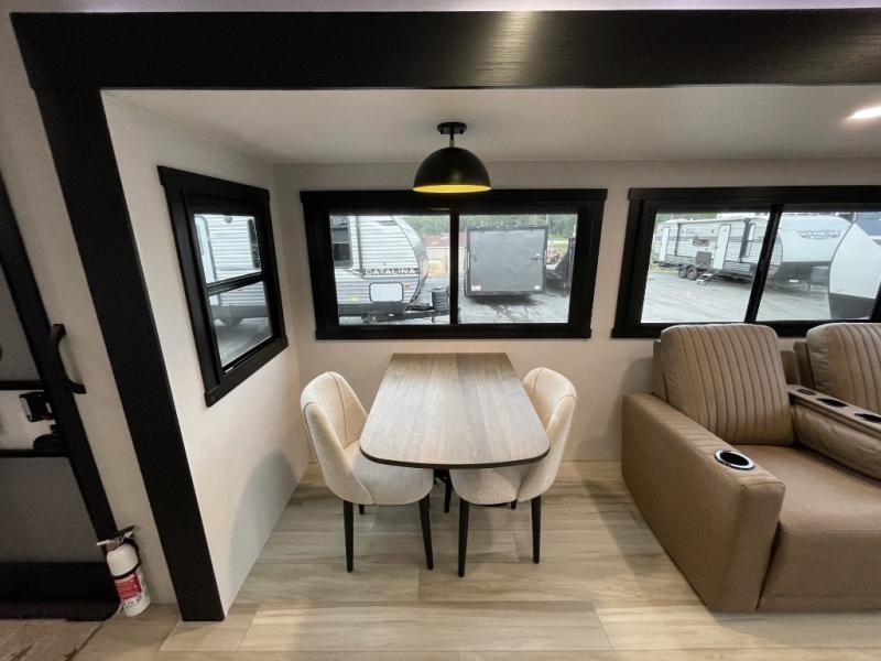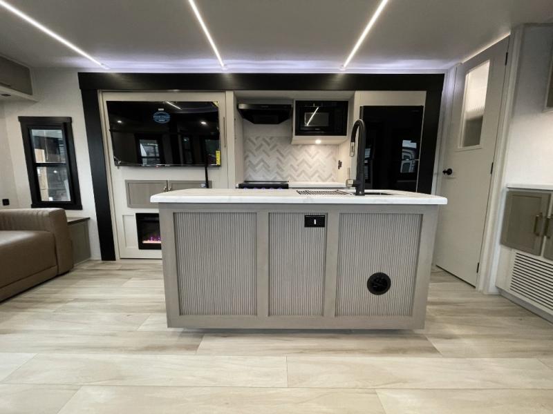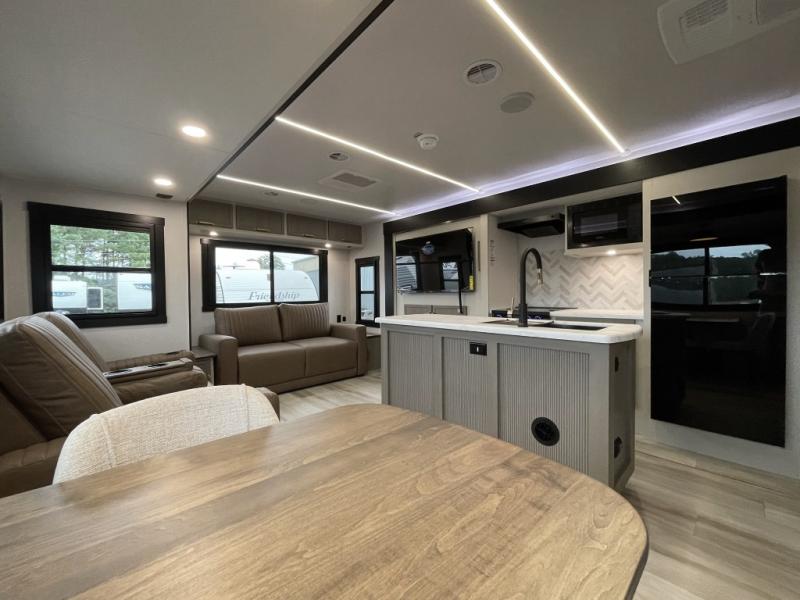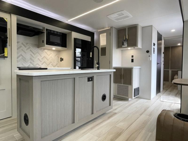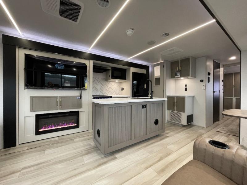 This travel trailer is decked out in features you will love like the front walk-in wardrobe with washer/dryer prep inside the front private bedroom! The full bathroom has everything you will need to get squeaky clean each morning including a residential walk-in shower with a skylight to let in some natural lighting. There is a hutch for you to store your dishes and a kitchen island to make meal prepping even easier. Once you have created a delicious meal, you can head to the booth dinette and enjoy eating it there comfortably while enjoying your view out of the panoramic window!
