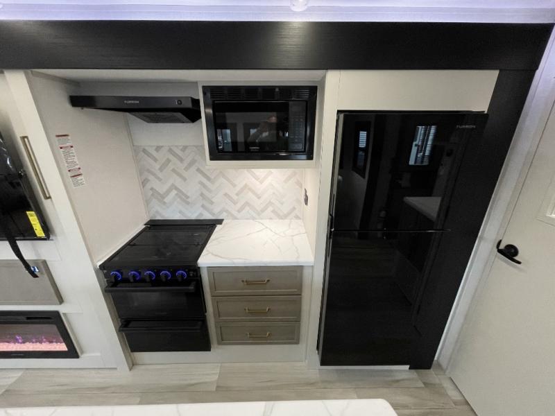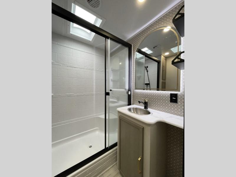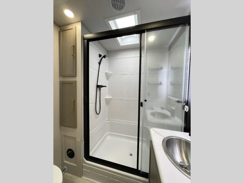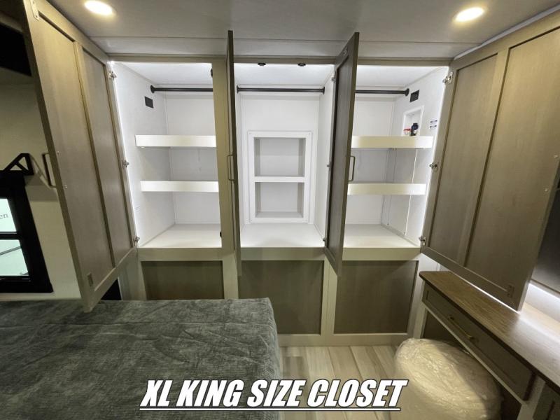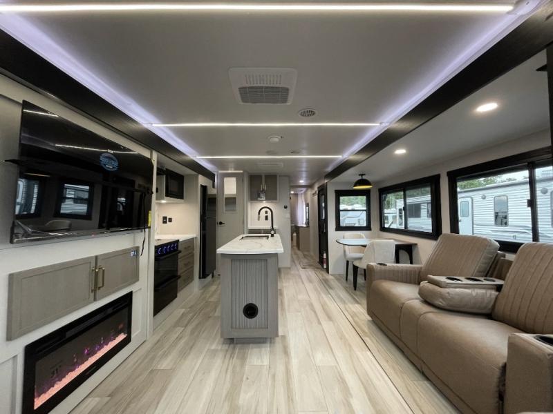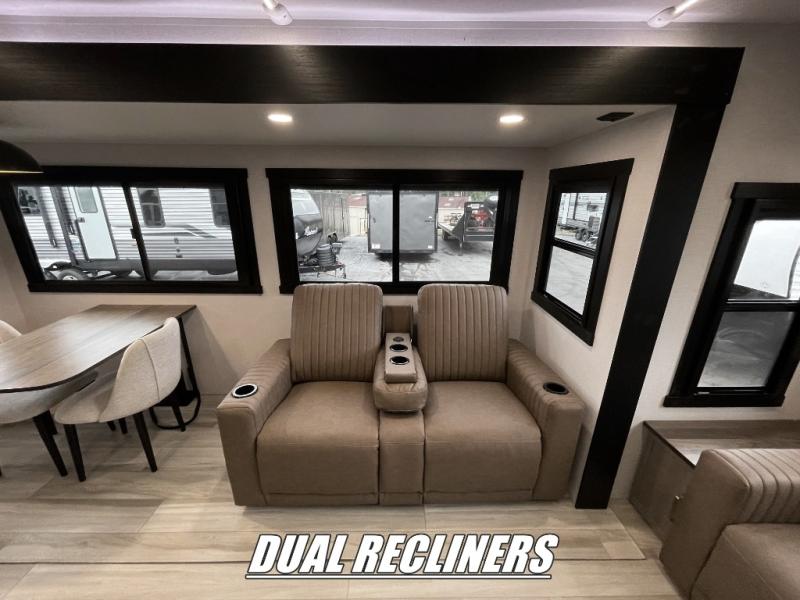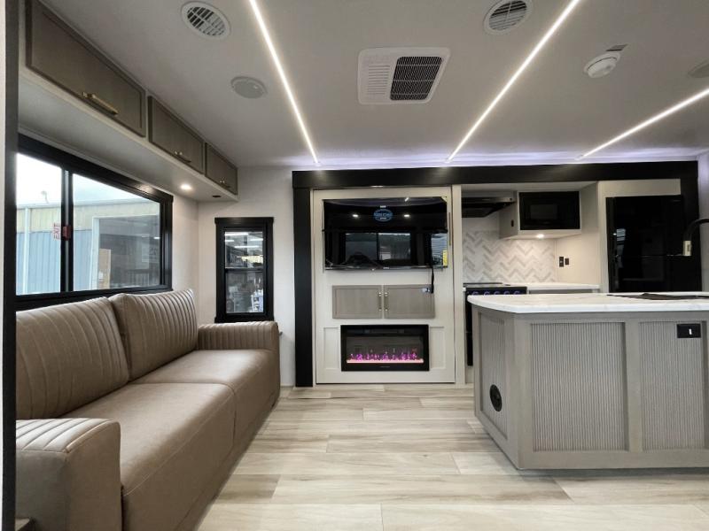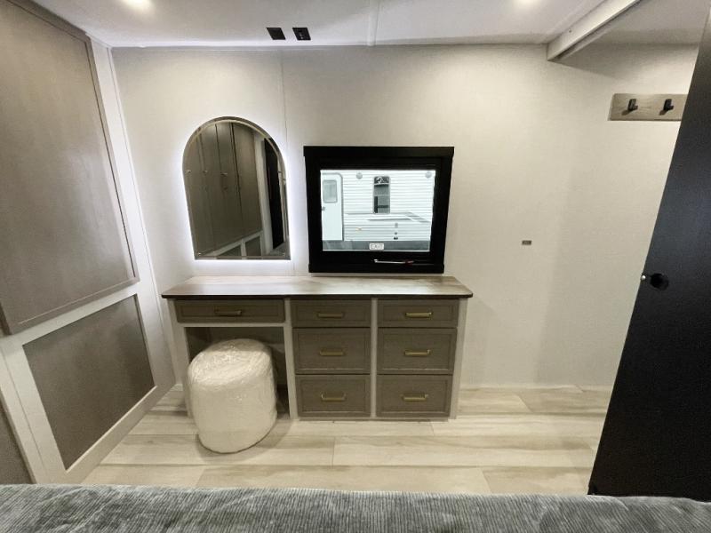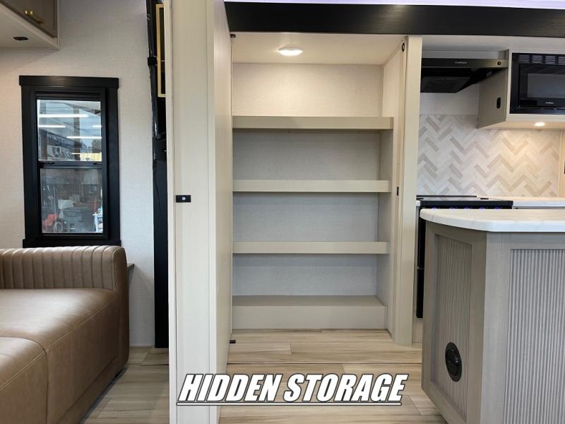 This travel trailer is decked out in features you will love like the front walk-in wardrobe with washer/dryer prep inside the front private bedroom! The full bathroom has everything you will need to get squeaky clean each morning including a residential walk-in shower with a skylight to let in some natural lighting. There is a hutch for you to store your dishes and a kitchen island to make meal prepping even easier. Once you have created a delicious meal, you can head to the booth dinette and enjoy eating it there comfortably while enjoying your view out of the panoramic window!