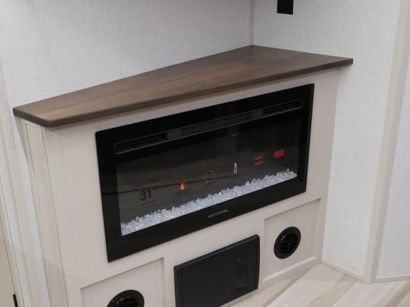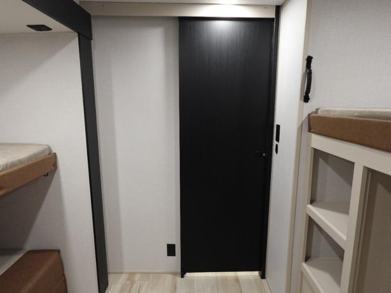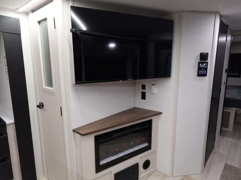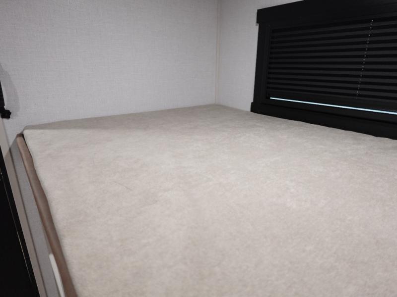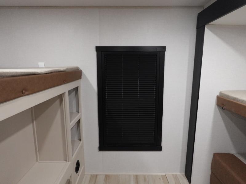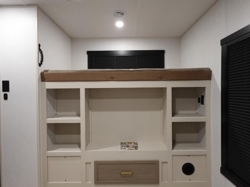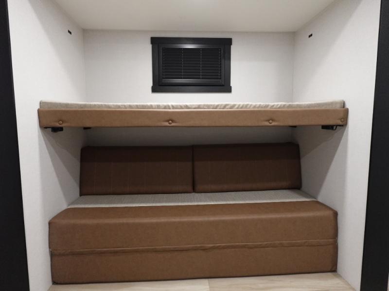 Your kids or friends are going to love camping in this travel trailer! It features a rear private bunkhouse with a bunk above a Versa queen convertible bed/sofa plus an additional bunk above an entertainment center with storage below. Just outside the bunkhouse is the kitchen with a 10 cu. ft. 12V black refrigerator, a microwave, a kitchen island, and a chef-sized walk-in pantry big enough to store everyone's favorite snacks. The booth dinette and the theatre seating are right next to panoramic windows so you can enjoy looking out at your beautiful scenery. You will also love taking a hot, steamy shower in the 30" x 36" shower with skylights and get a good night's rest on the queen bed with Versa Tilt in the front private bedroom!
