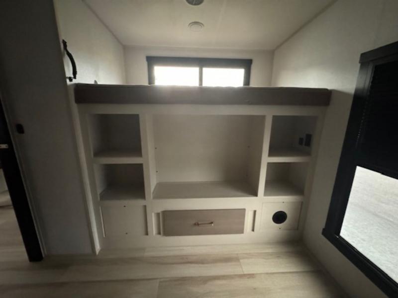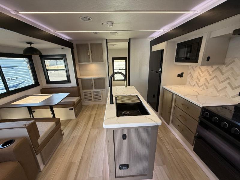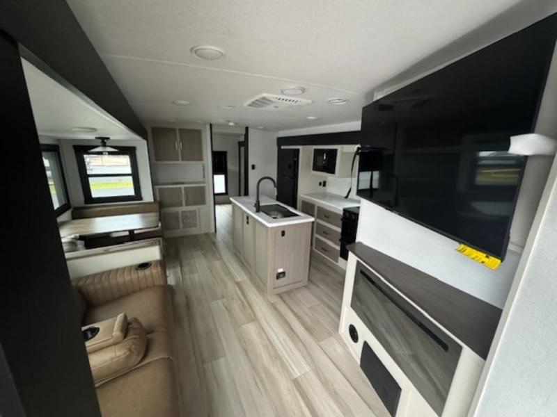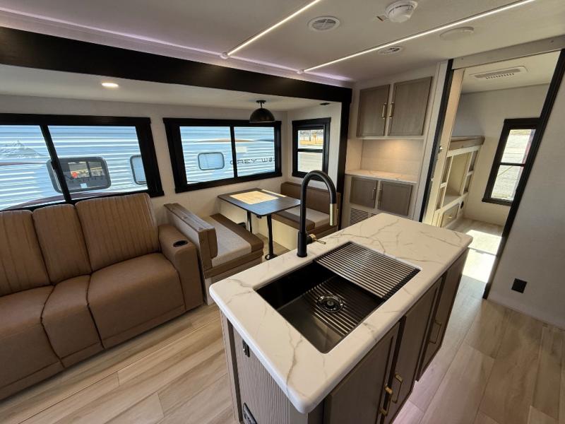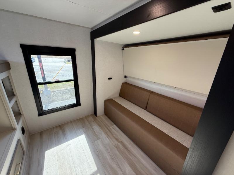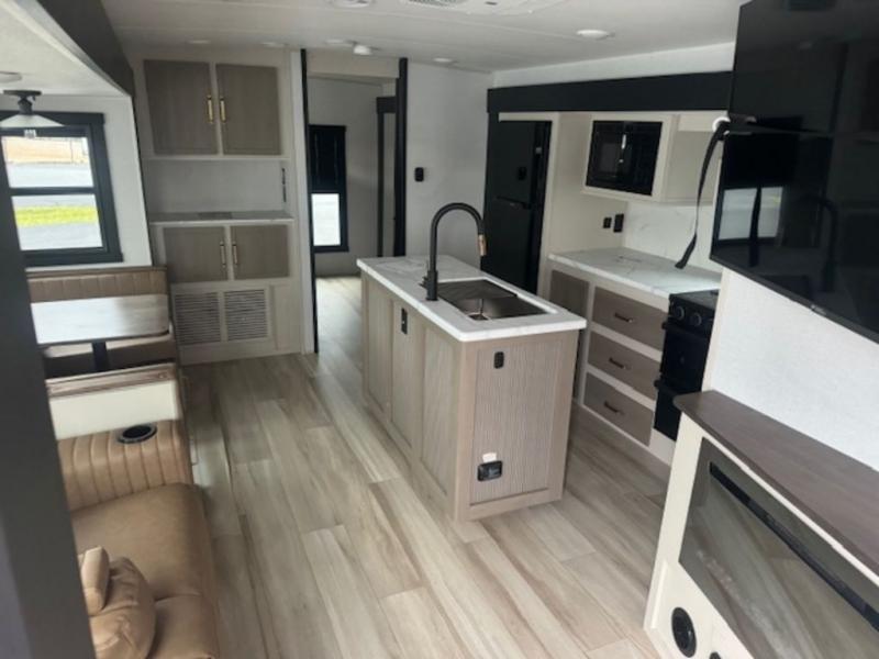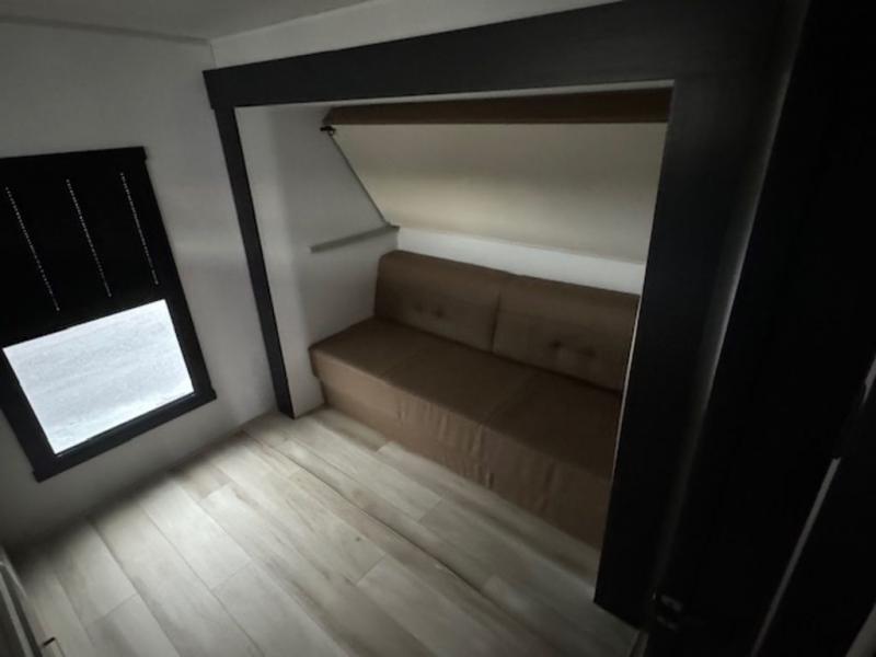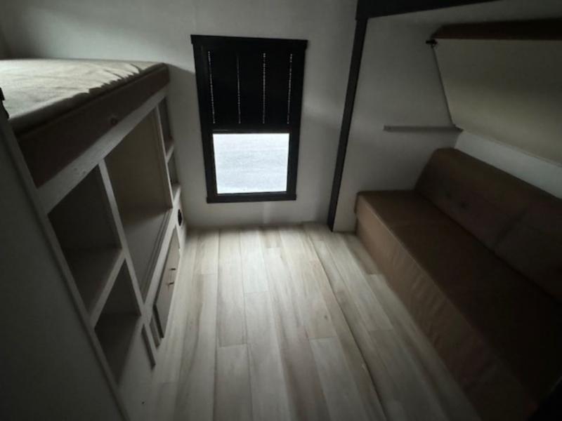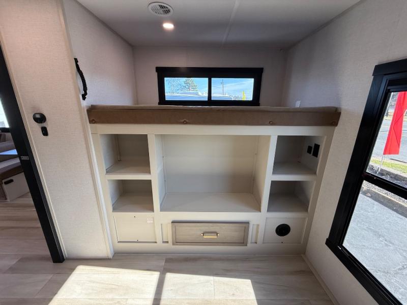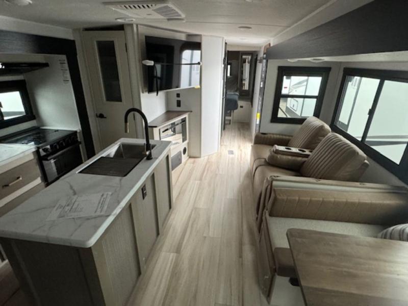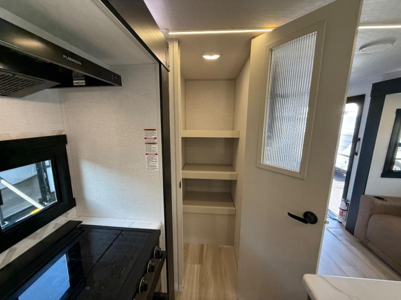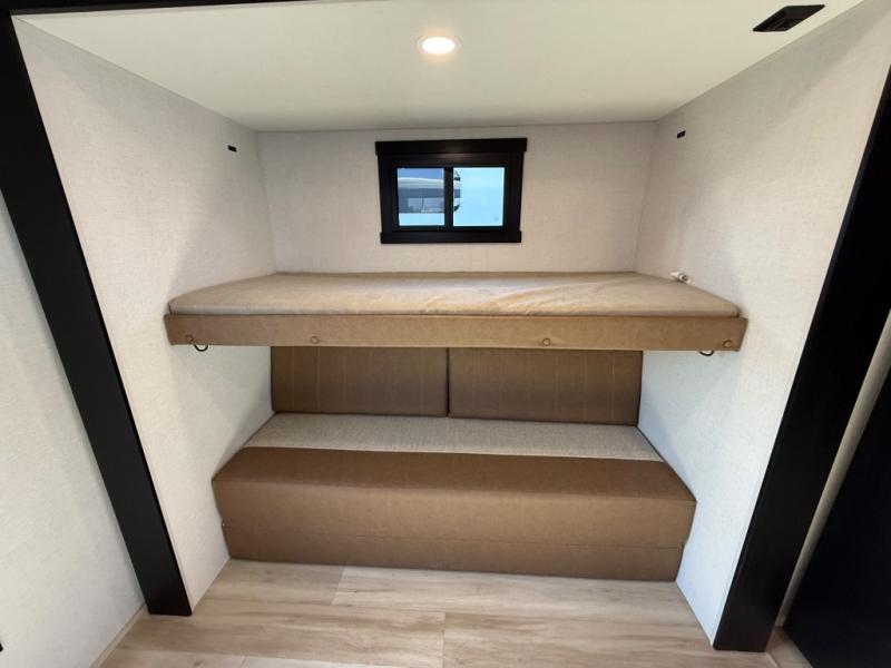 Your kids or friends are going to love camping in this travel trailer! It features a rear private bunkhouse with a bunk above a Versa queen convertible bed/sofa plus an additional bunk above an entertainment center with storage below. Just outside the bunkhouse is the kitchen with a 10 cu. ft. 12V black refrigerator, a microwave, a kitchen island, and a chef-sized walk-in pantry big enough to store everyone's favorite snacks. The booth dinette and the theatre seating are right next to panoramic windows so you can enjoy looking out at your beautiful scenery. You will also love taking a hot, steamy shower in the 30" x 36" shower with skylights and get a good night's rest on the queen bed in the front private bedroom!