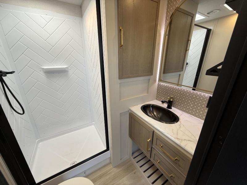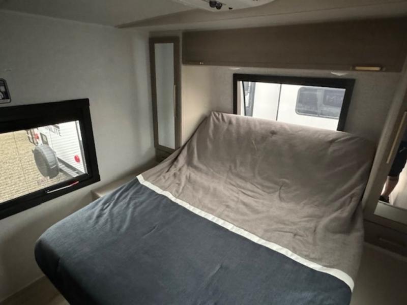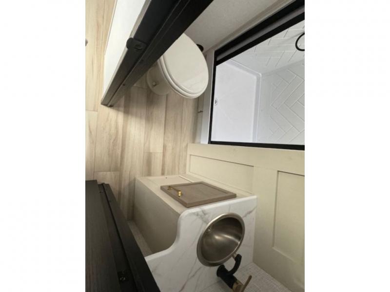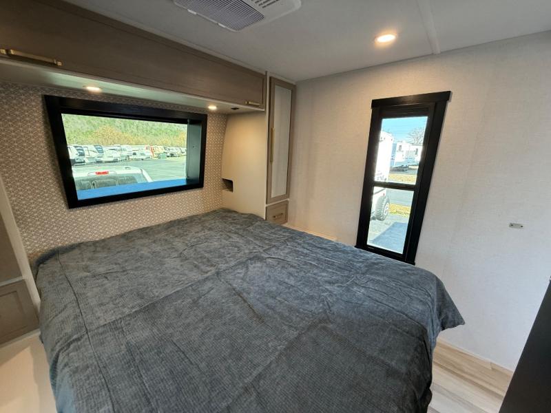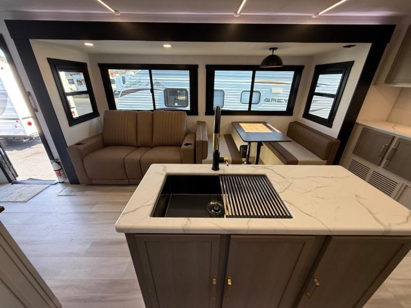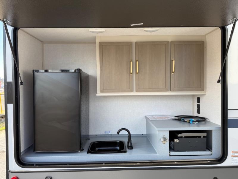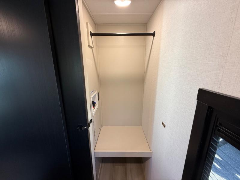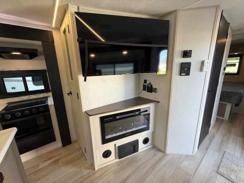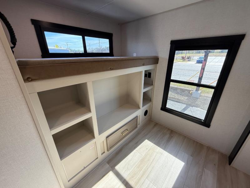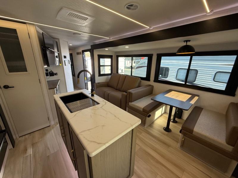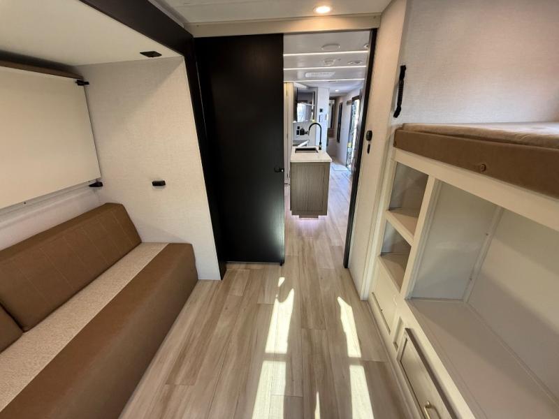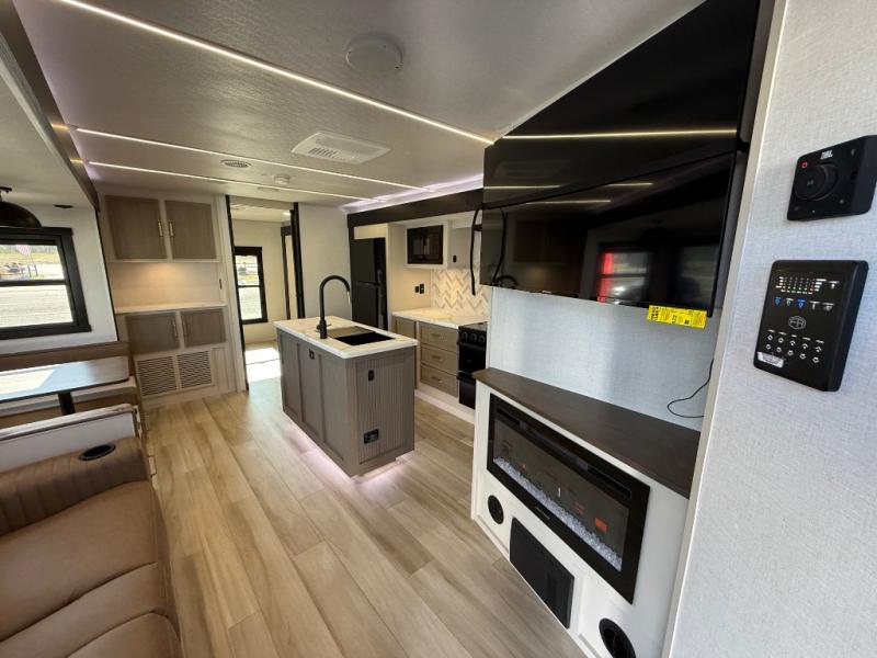 Your kids or friends are going to love camping in this travel trailer! It features a rear private bunkhouse with a bunk above a Versa queen convertible bed/sofa plus an additional bunk above an entertainment center with storage below. Just outside the bunkhouse is the kitchen with a 10 cu. ft. 12V black refrigerator, a microwave, a kitchen island, and a chef-sized walk-in pantry big enough to store everyone's favorite snacks. The booth dinette and the theatre seating are right next to panoramic windows so you can enjoy looking out at your beautiful scenery. You will also love taking a hot, steamy shower in the 30" x 36" shower with skylights and get a good night's rest on the queen bed in the front private bedroom!