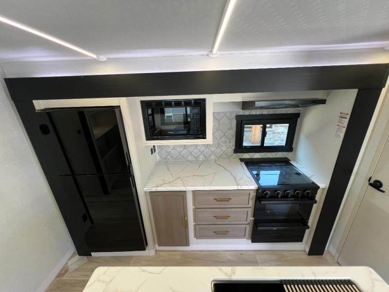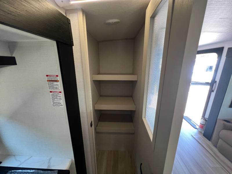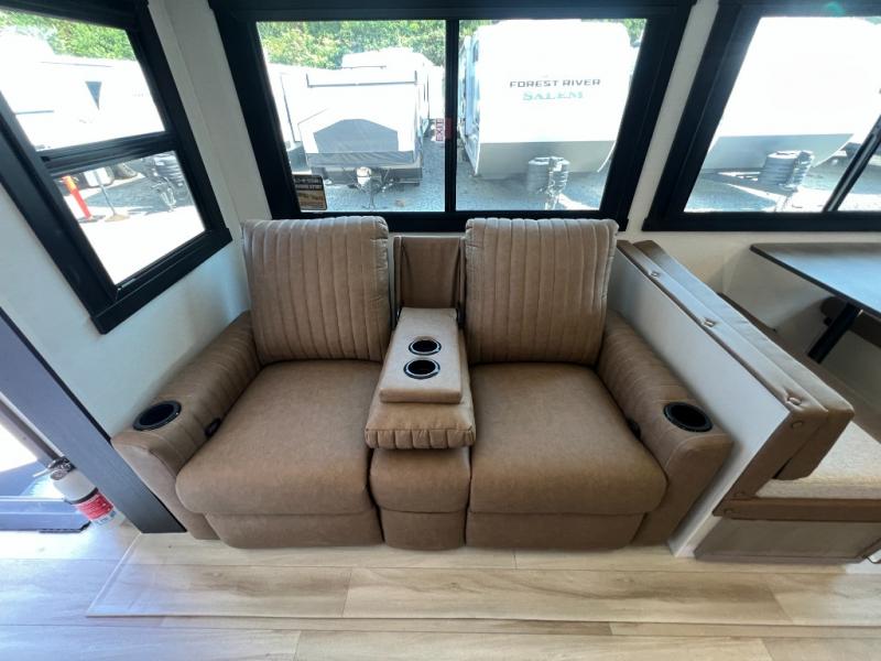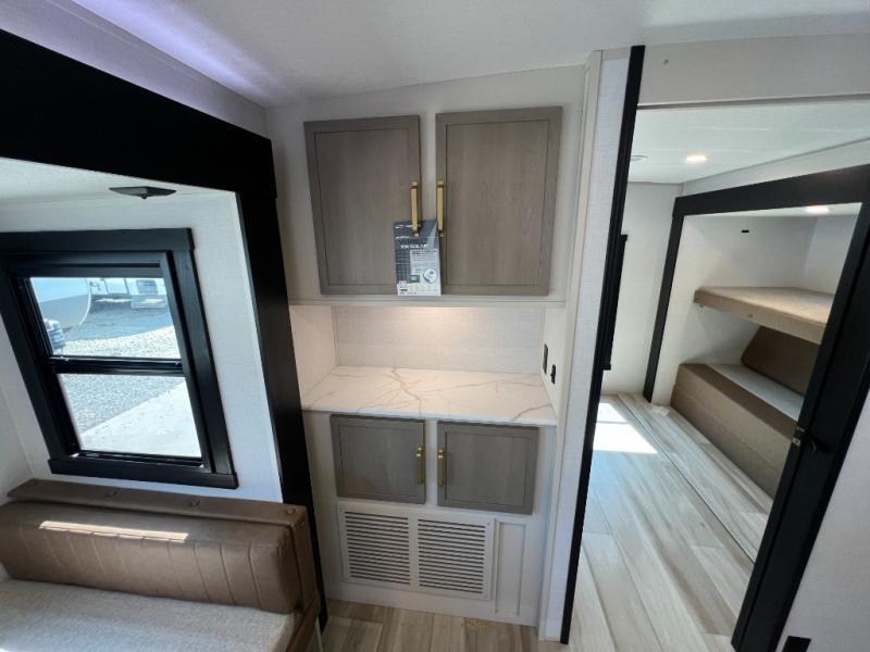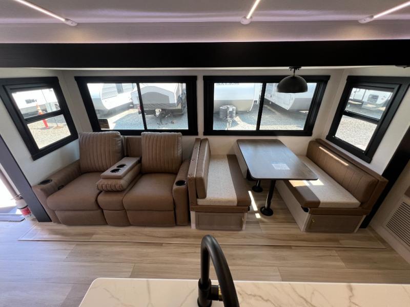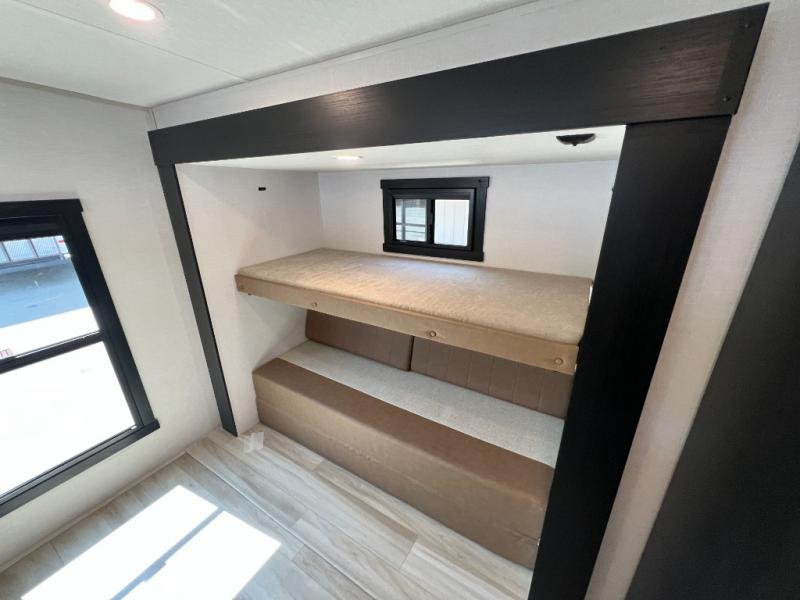 Your kids or friends are going to love camping in this travel trailer! It features a rear private bunkhouse with a bunk above a Versa queen convertible bed/sofa plus an additional bunk above an entertainment center with storage below. Just outside the bunkhouse is the kitchen with a 10 cu. ft. 12V black refrigerator, a microwave, a kitchen island, and a chef-sized walk-in pantry big enough to store everyone's favorite snacks. The booth dinette and the theatre seating are right next to panoramic windows so you can enjoy looking out at your beautiful scenery. You will also love taking a hot, steamy shower in the 30" x 36" shower with skylights and get a good night's rest on the queen bed with Versa Tilt in the front private bedroom!