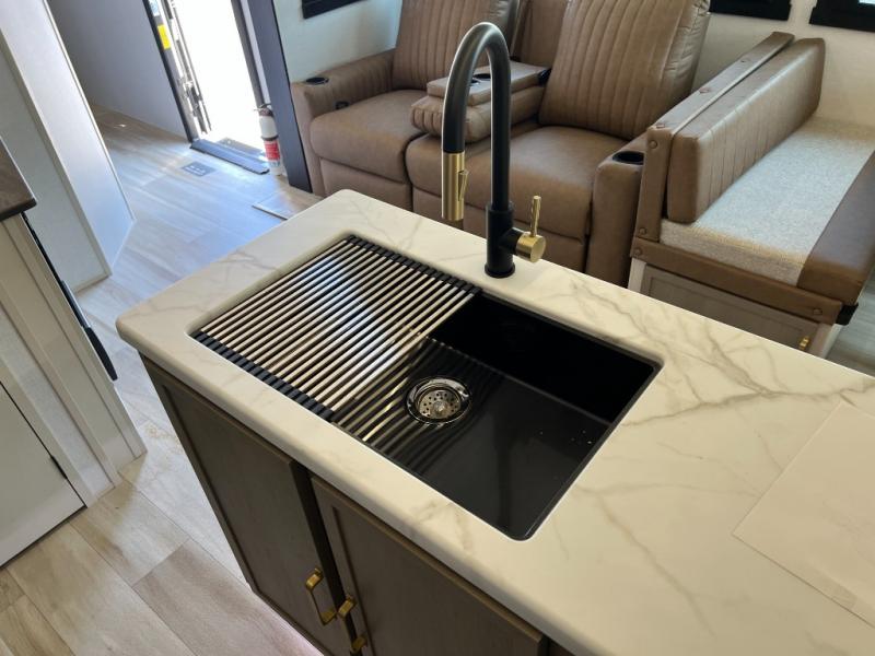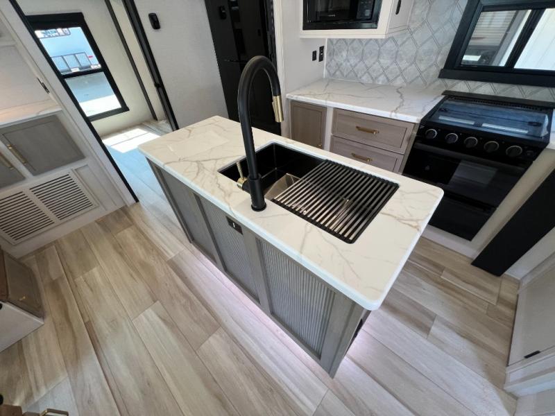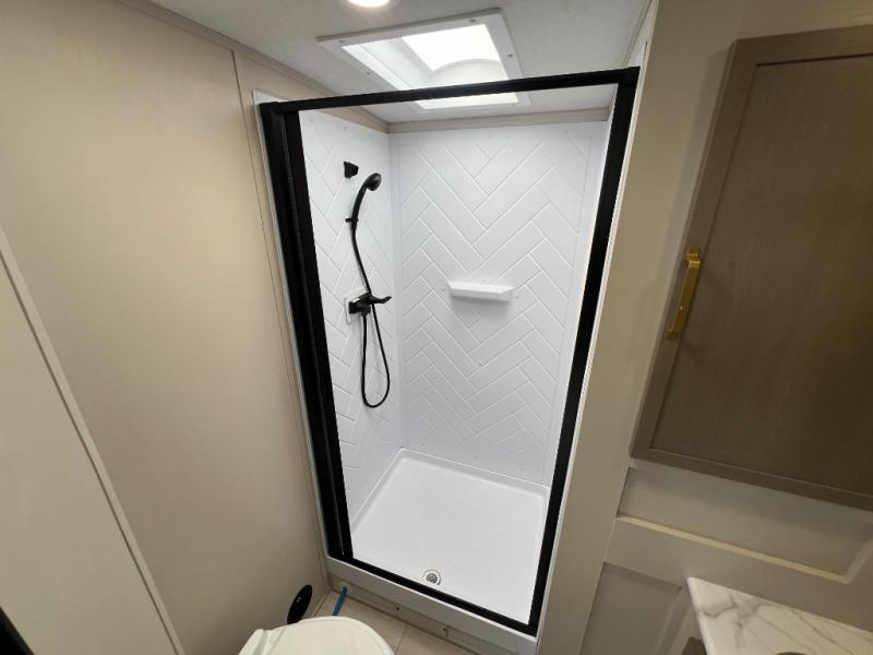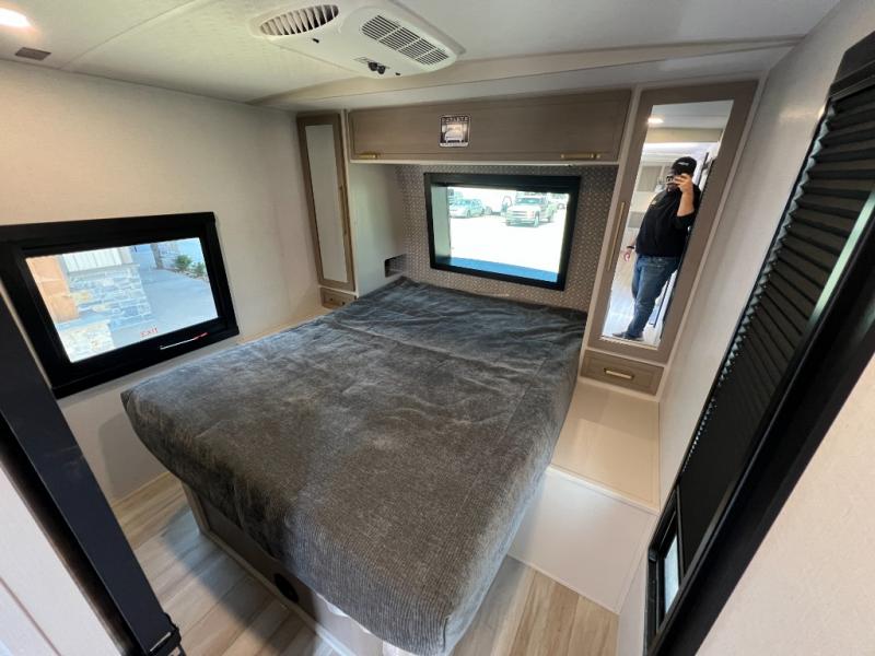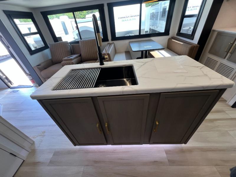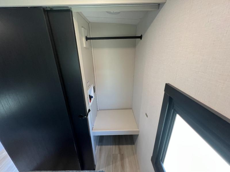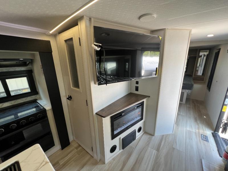 Your kids or friends are going to love camping in this travel trailer! It features a rear private bunkhouse with a bunk above a Versa queen convertible bed/sofa plus an additional bunk above an entertainment center with storage below. Just outside the bunkhouse is the kitchen with a 10 cu. ft. 12V black refrigerator, a microwave, a kitchen island, and a chef-sized walk-in pantry big enough to store everyone's favorite snacks. The booth dinette and the theatre seating are right next to panoramic windows so you can enjoy looking out at your beautiful scenery. You will also love taking a hot, steamy shower in the 30" x 36" shower with skylights and get a good night's rest on the queen bed with Versa Tilt in the front private bedroom!
