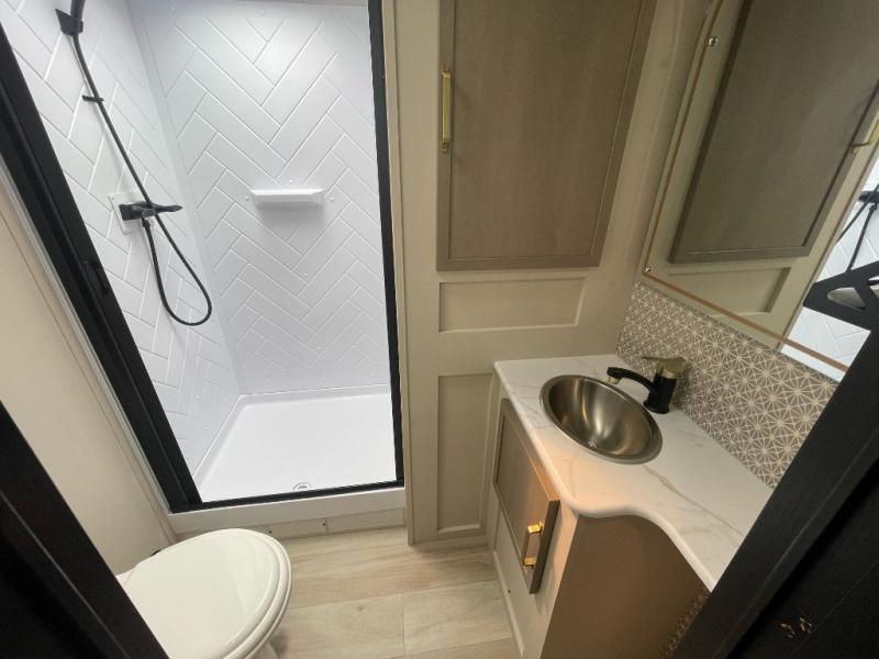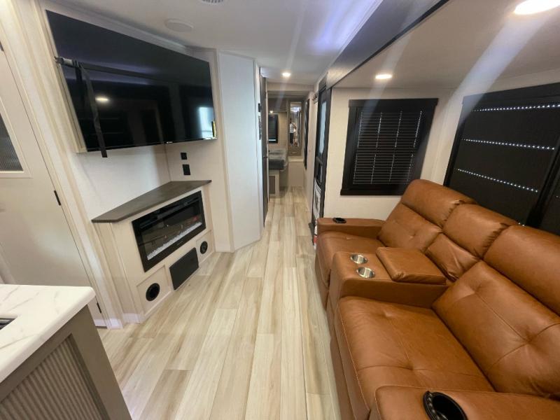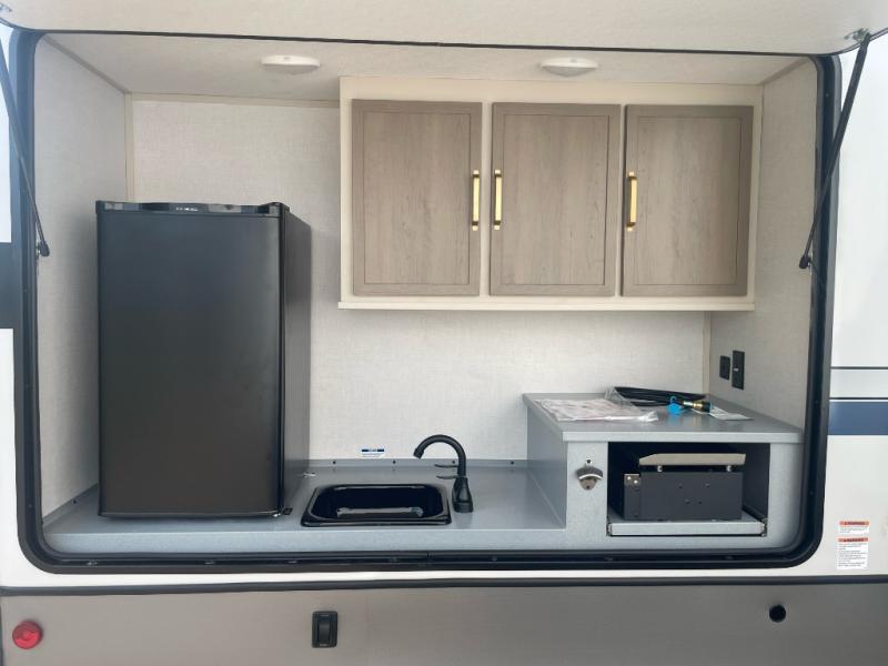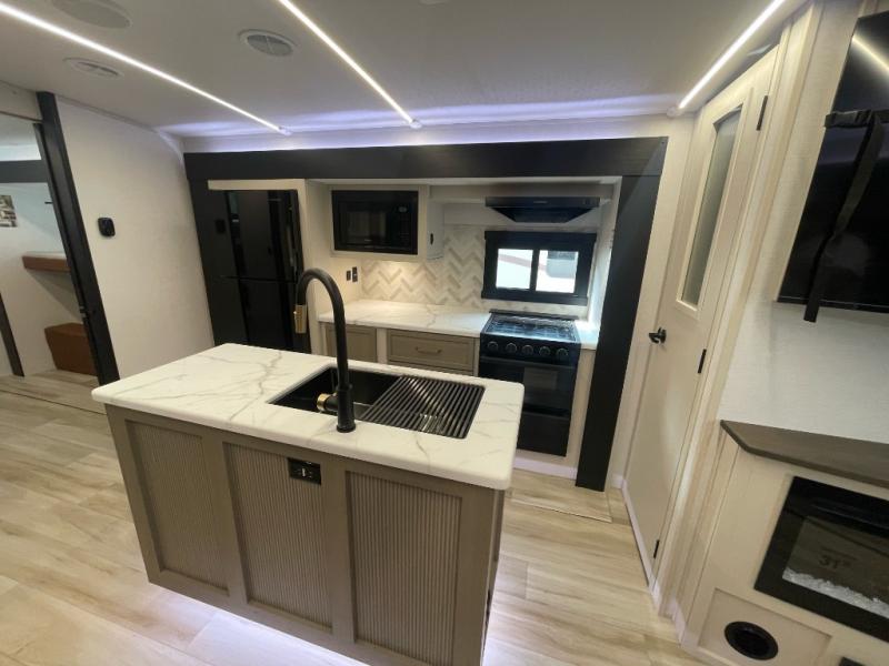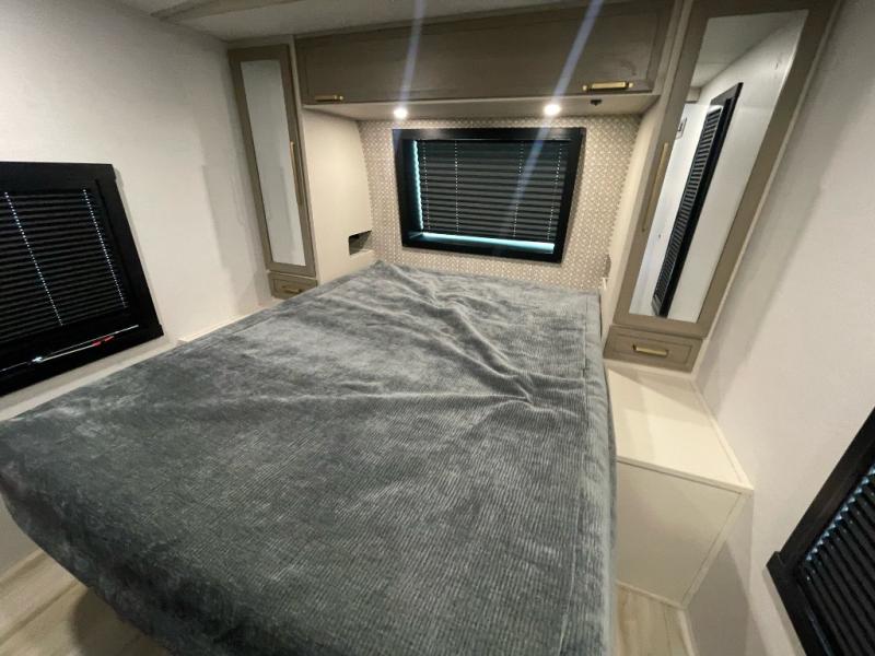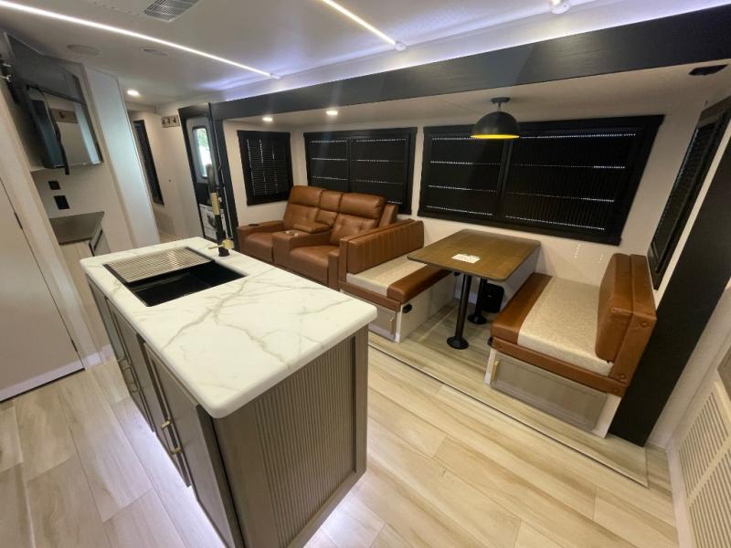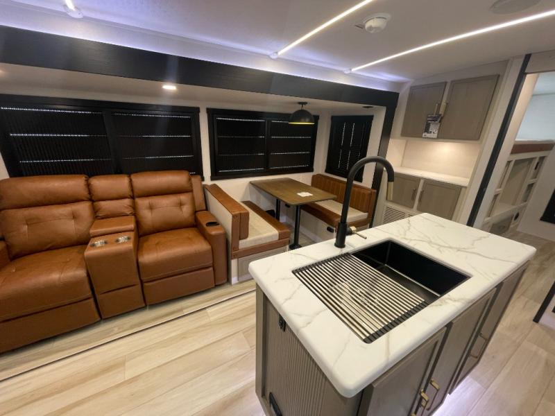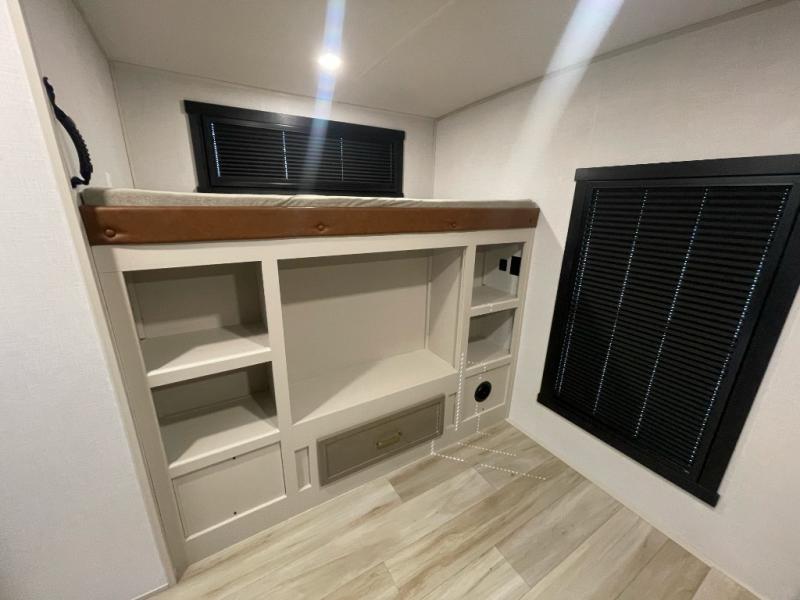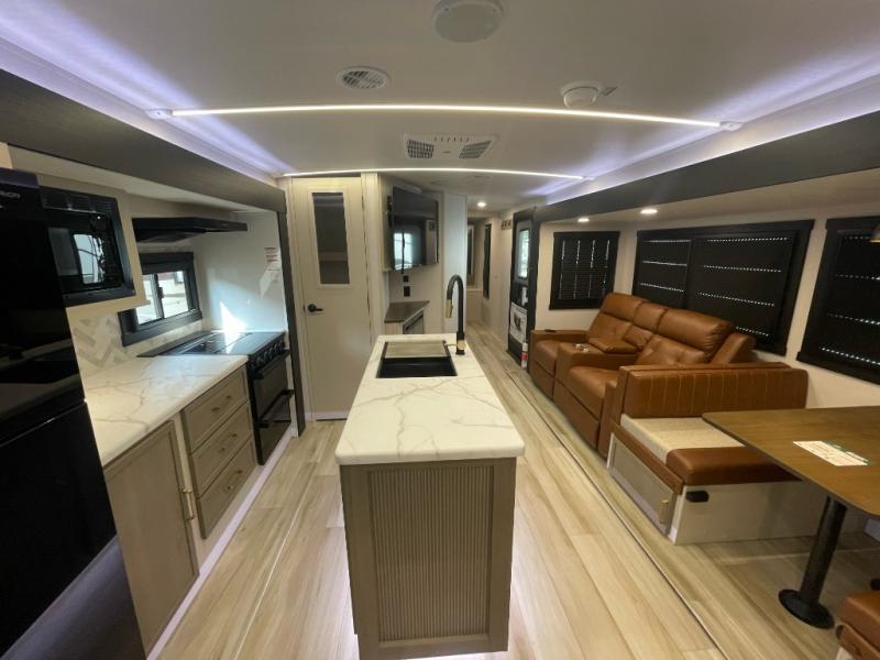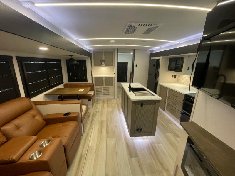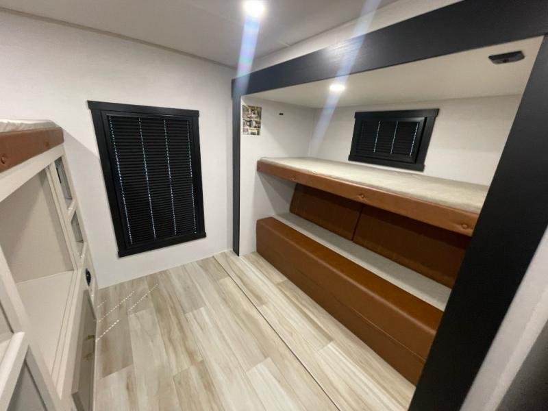 Your kids or friends are going to love camping in this travel trailer! It features a rear private bunkhouse with a bunk above a Versa queen convertible bed/sofa plus an additional bunk above an entertainment center with storage below. Just outside the bunkhouse is the kitchen with a 10 cu. ft. 12V black refrigerator, a microwave, a kitchen island, and a chef-sized walk-in pantry big enough to store everyone's favorite snacks. The booth dinette and the theatre seating are right next to panoramic windows so you can enjoy looking out at your beautiful scenery. You will also love taking a hot, steamy shower in the 30" x 36" shower with skylights and get a good night's rest on the queen bed with Versa Tilt in the front private bedroom!