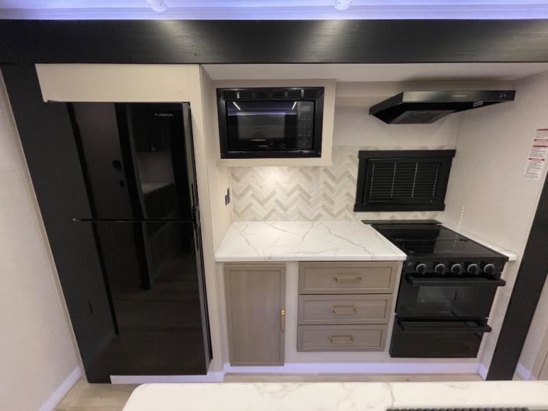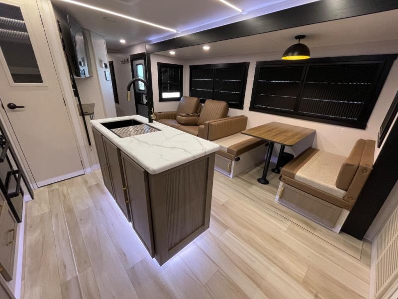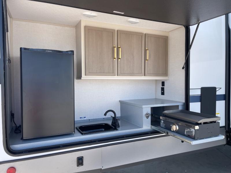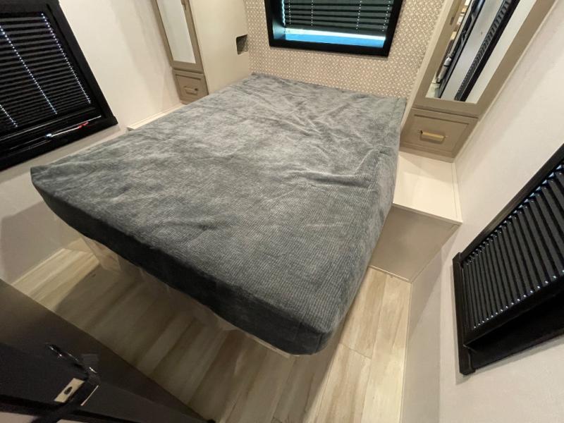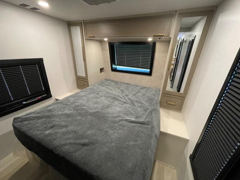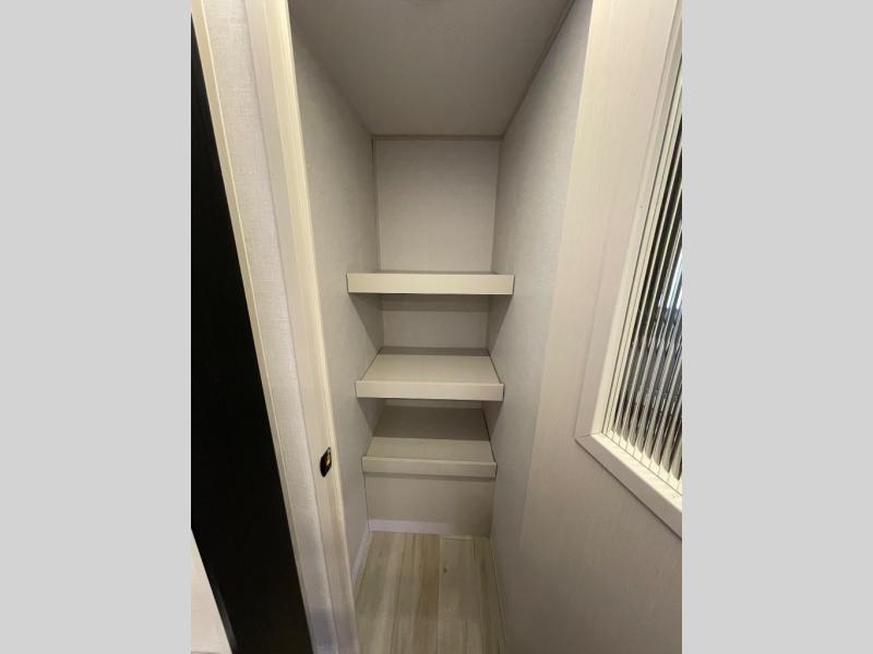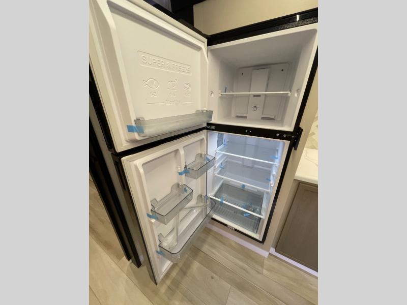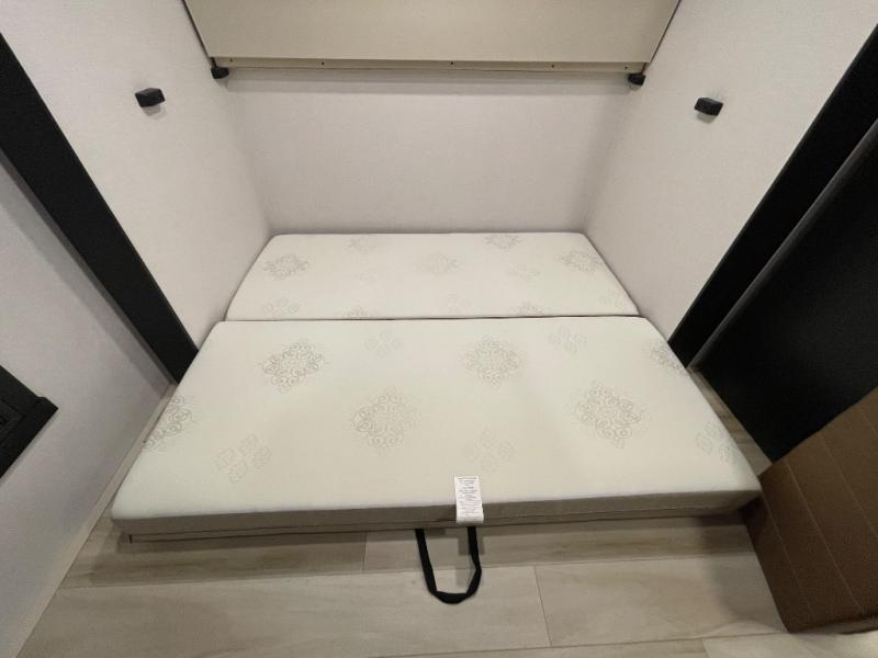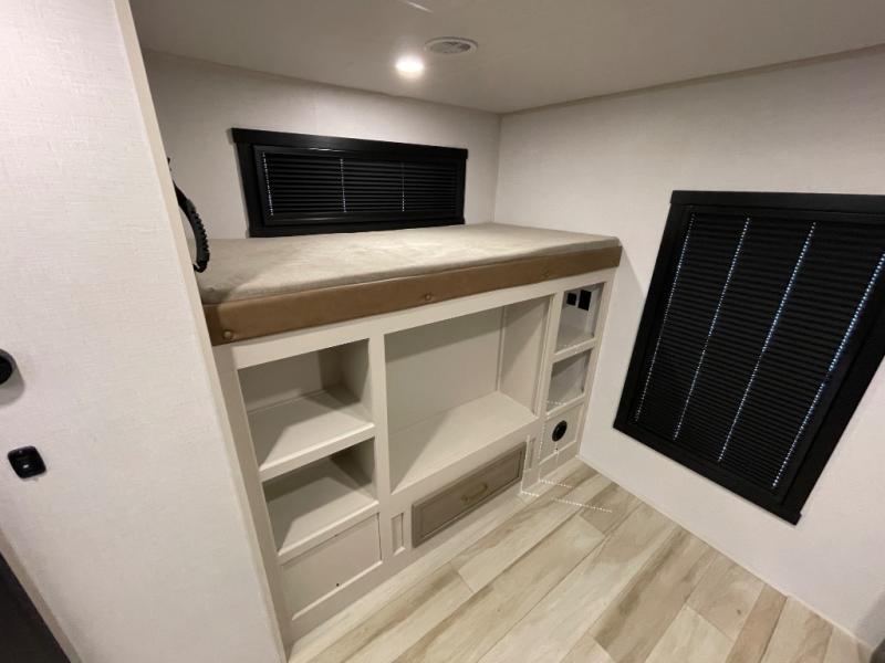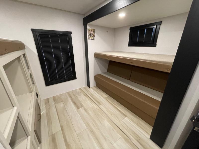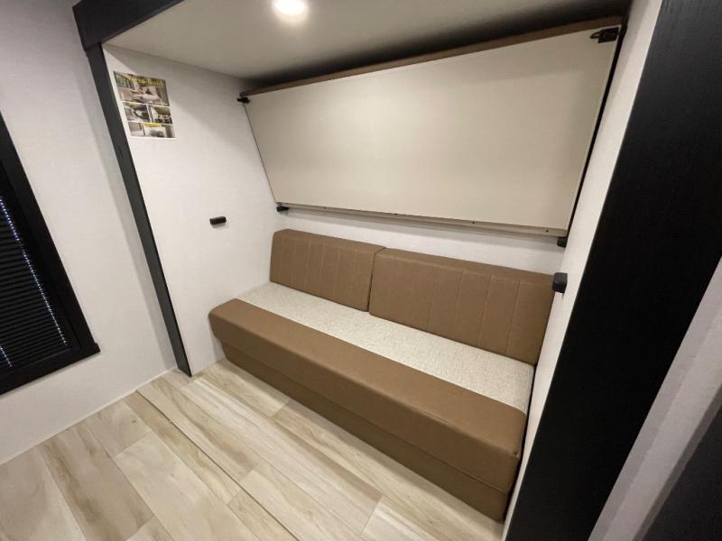 Your kids or friends are going to love camping in this travel trailer! It features a rear private bunkhouse with a bunk above a Versa queen convertible bed/sofa plus an additional bunk above an entertainment center with storage below. Just outside the bunkhouse is the kitchen with a 10 cu. ft. 12V black refrigerator, a microwave, a kitchen island, and a chef-sized walk-in pantry big enough to store everyone's favorite snacks. The booth dinette and the theatre seating are right next to panoramic windows so you can enjoy looking out at your beautiful scenery. You will also love taking a hot, steamy shower in the 30" x 36" shower with skylights and get a good night's rest on the queen bed with Versa Tilt in the front private bedroom!
