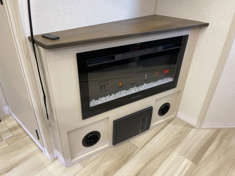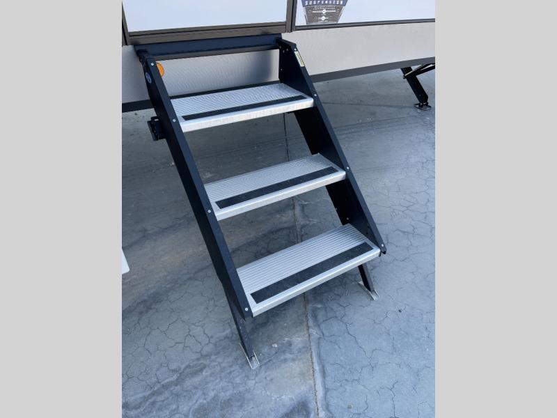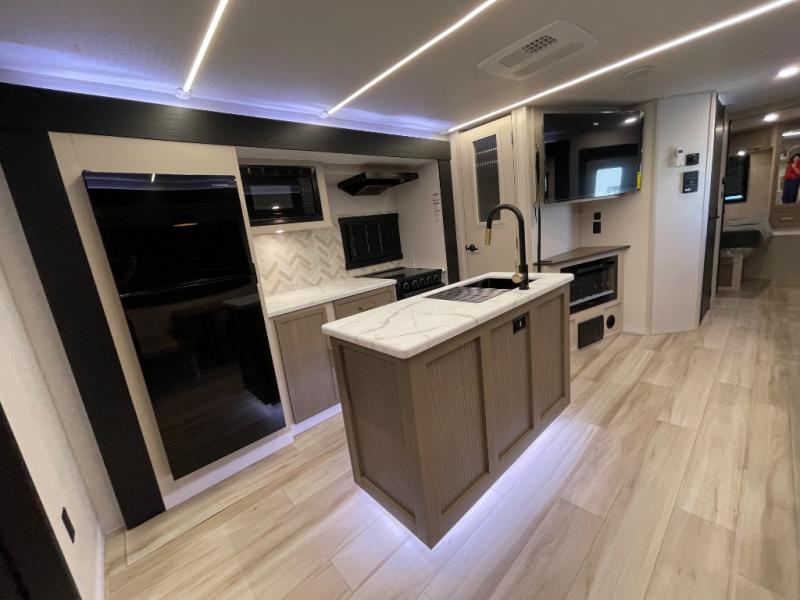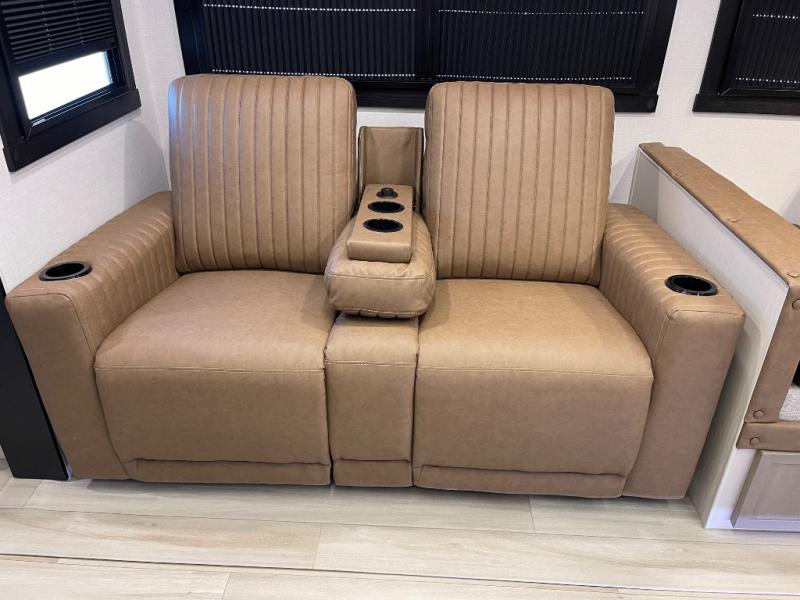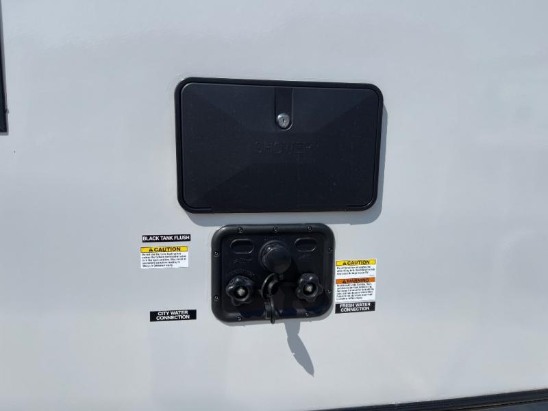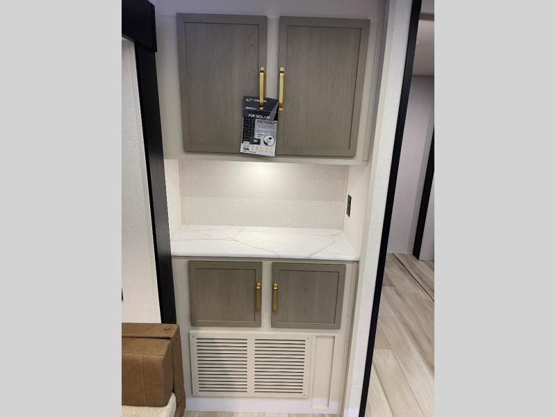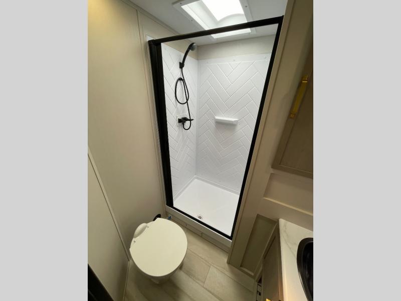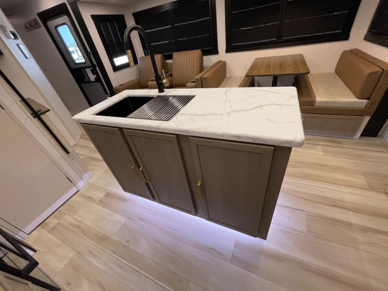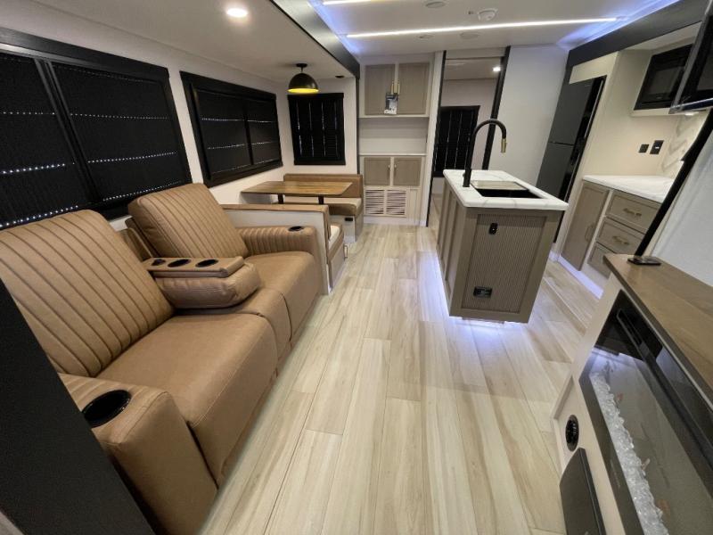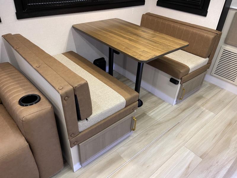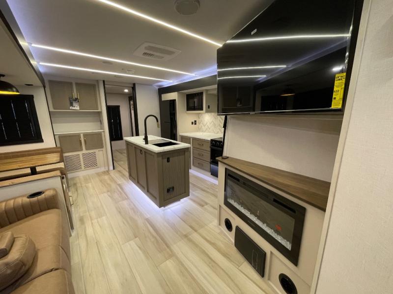 Your kids or friends are going to love camping in this travel trailer! It features a rear private bunkhouse with a bunk above a Versa queen convertible bed/sofa plus an additional bunk above an entertainment center with storage below. Just outside the bunkhouse is the kitchen with a 10 cu. ft. 12V black refrigerator, a microwave, a kitchen island, and a chef-sized walk-in pantry big enough to store everyone's favorite snacks. The booth dinette and the theatre seating are right next to panoramic windows so you can enjoy looking out at your beautiful scenery. You will also love taking a hot, steamy shower in the 30" x 36" shower with skylights and get a good night's rest on the queen bed with Versa Tilt in the front private bedroom!