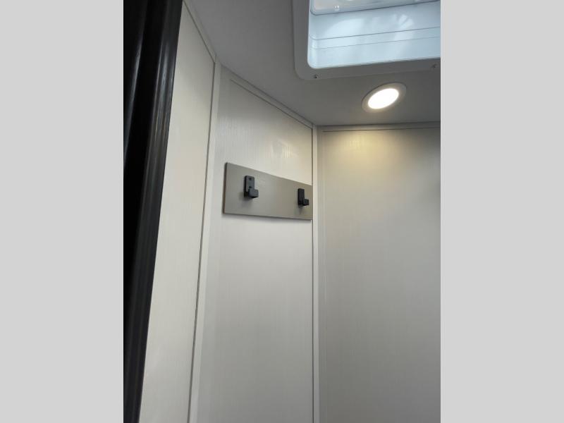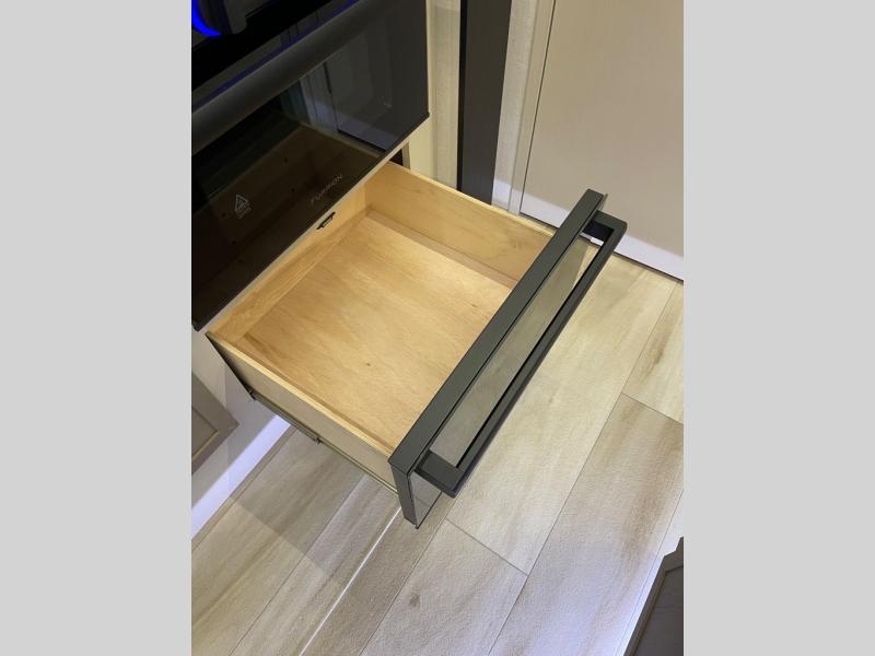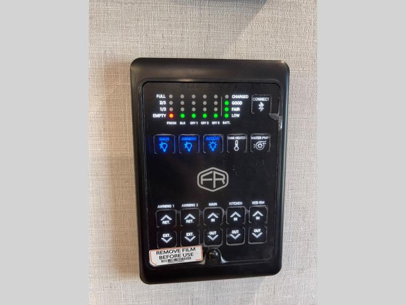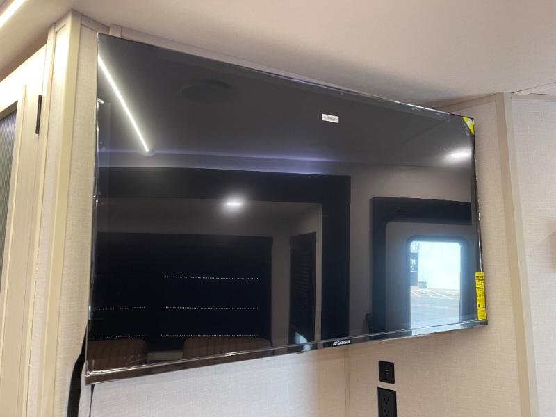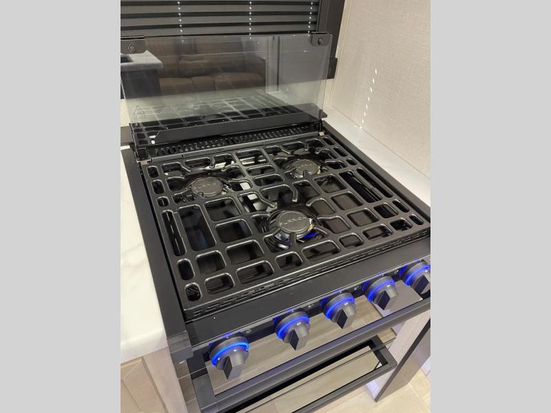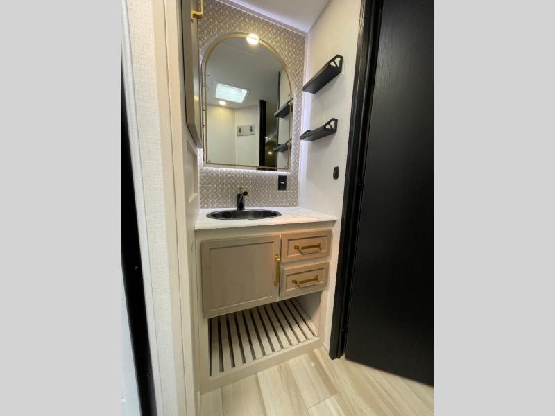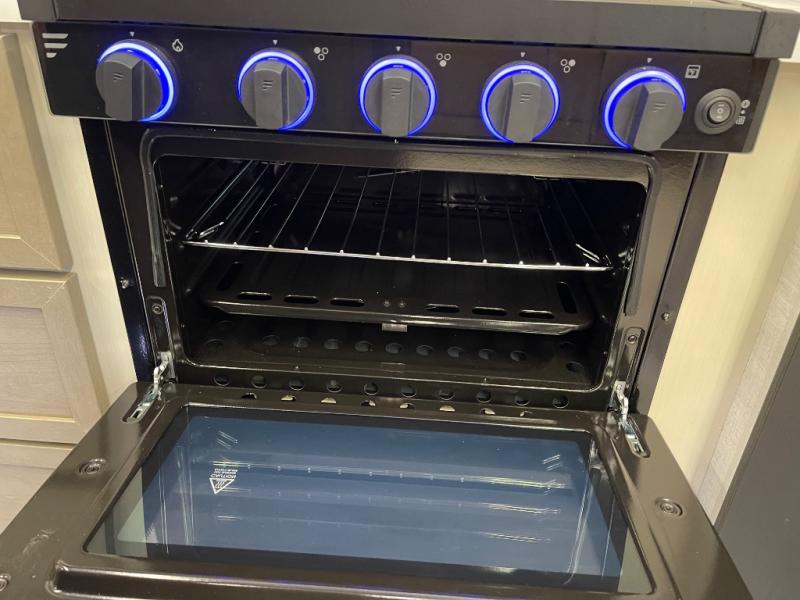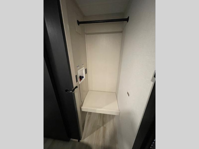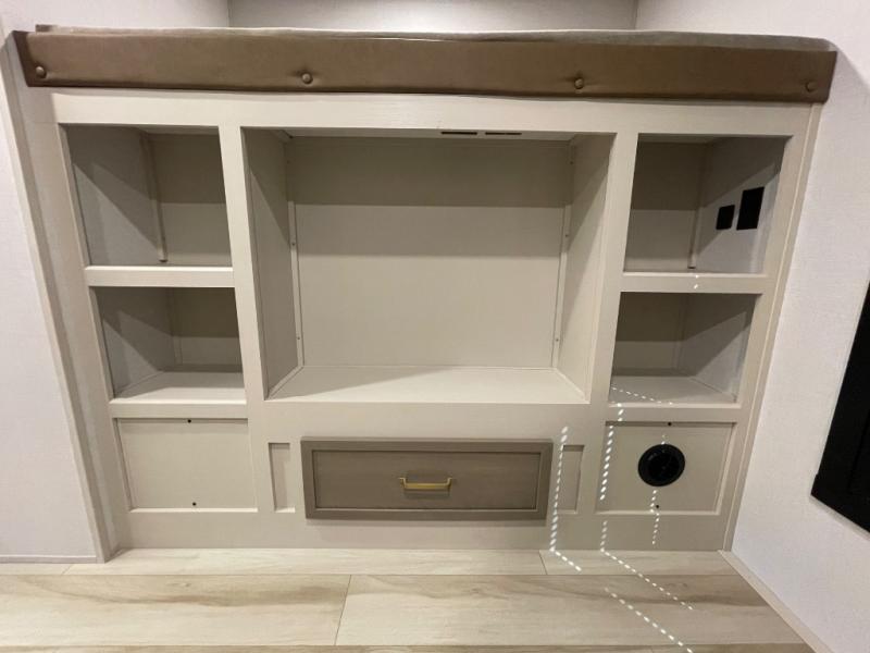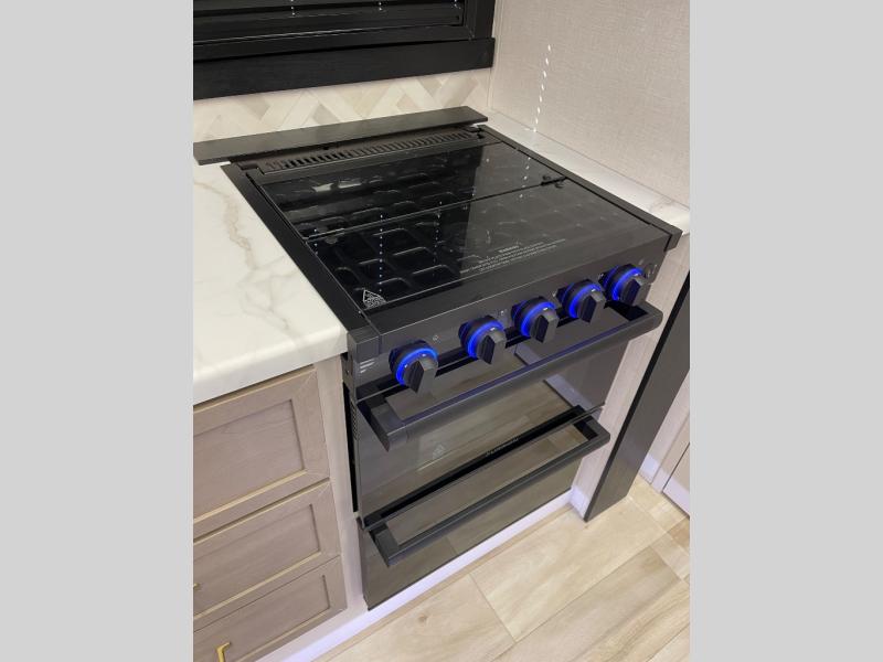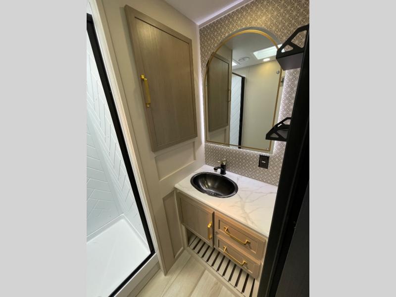Your kids or friends are going to love camping in this travel trailer! It features a rear private bunkhouse with a bunk above a Versa queen convertible bed/sofa plus an additional bunk above an entertainment center with storage below. Just outside the bunkhouse is the kitchen with a 10 cu. ft. 12V black refrigerator, a microwave, a kitchen island, and a chef-sized walk-in pantry big enough to store everyone's favorite snacks. The booth dinette and the theatre seating are right next to panoramic windows so you can enjoy looking out at your beautiful scenery. You will also love taking a hot, steamy shower in the 30" x 36" shower with skylights and get a good night's rest on the queen bed with Versa Tilt in the front private bedroom!