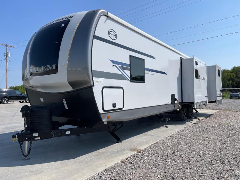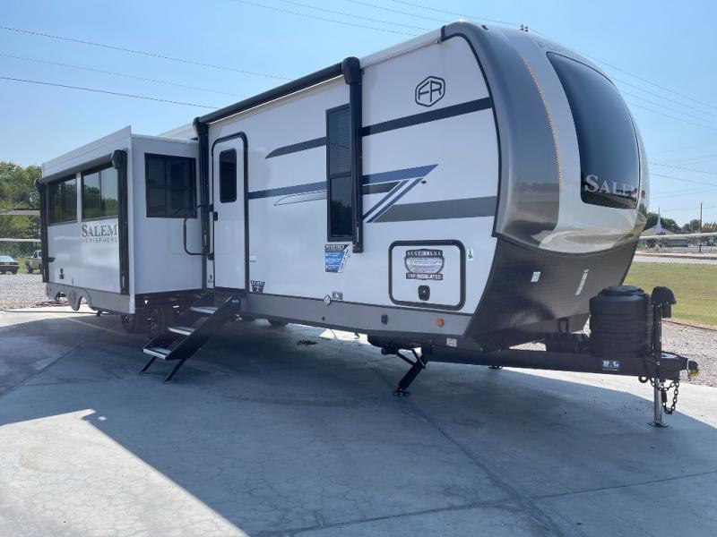 The Salem Hemisphere fifth wheels and travel trailers by Forest River are packed with features, while still being value-minded! Each model is constructed with laminated "Aluma Frame" sidewalls and floor with block foam insulation plus full length barreled ceilings for added head space. There are LED awning, marker and tail lights outside, along with an extra large pass-thru storage with slam latch baggage doors, plus solar prep and Lippert On-The-Go ladder prep. The 60K on-demand tankless water heater will provide endless hot showers, and the JBL sound system includes a head unit plus interior and exterior speakers to keep the party going. There are also many interior comforts found throughout that will make you feel right at home!
