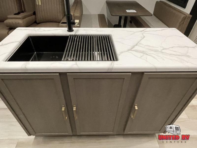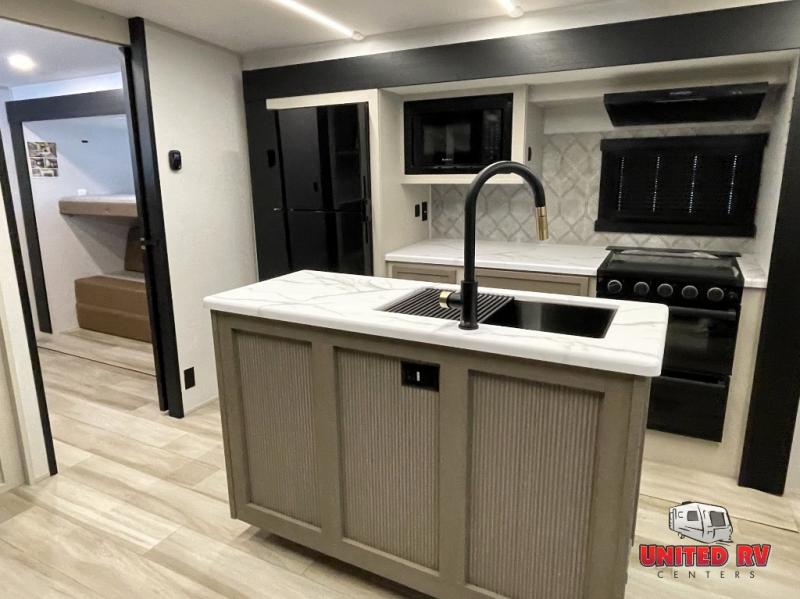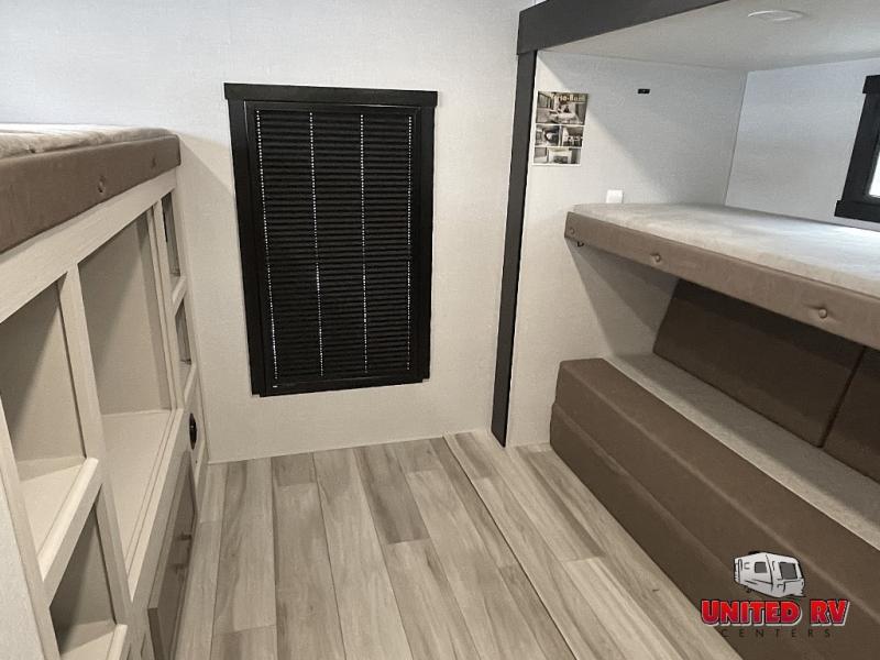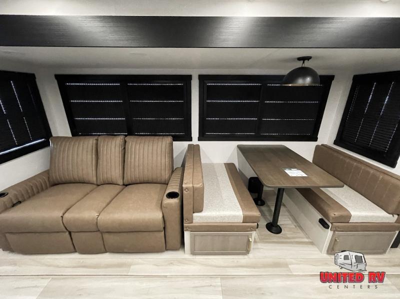 Your kids or friends are going to love camping in this travel trailer! It features a rear private bunkhouse with a bunk above a Versa queen convertible bed/sofa plus an additional bunk above an entertainment center with storage below. Just outside the bunkhouse is the kitchen with a 10 cu. ft. 12V black refrigerator, a microwave, a kitchen island, and a chef-sized walk-in pantry big enough to store everyone's favorite snacks. The booth dinette and the theatre seating are right next to panoramic windows so you can enjoy looking out at your beautiful scenery. You will also love taking a hot, steamy shower in the 30" x 36" shower with skylights and get a good night's rest on the queen bed with Versa Tilt in the front private bedroom!