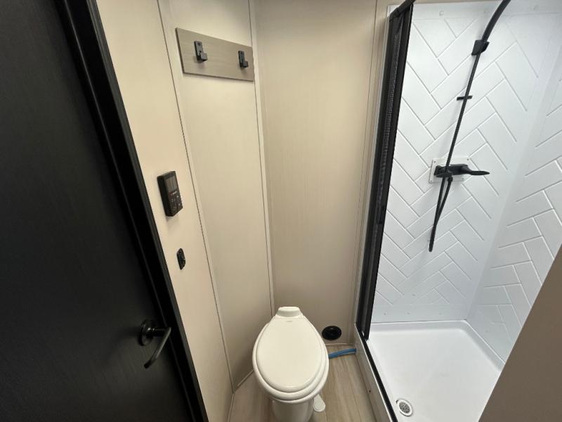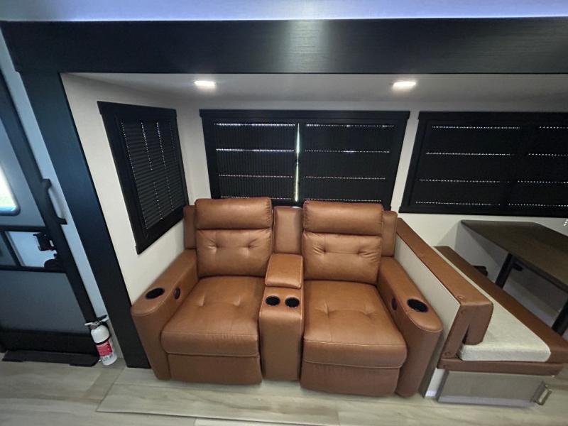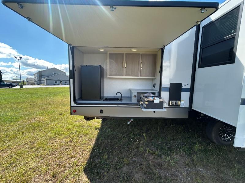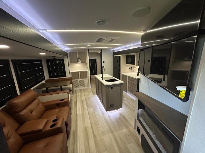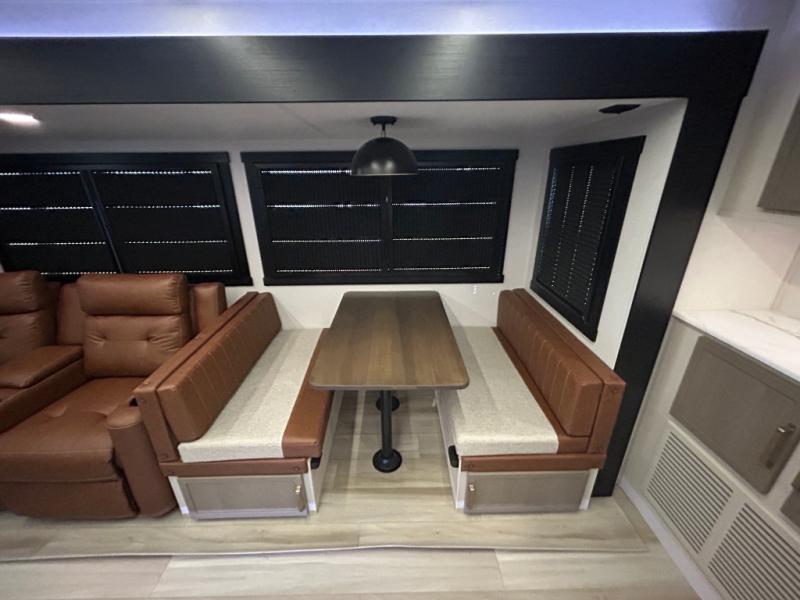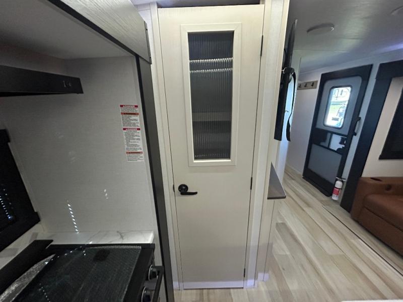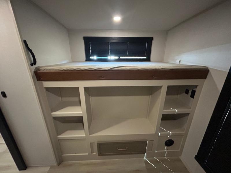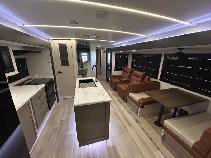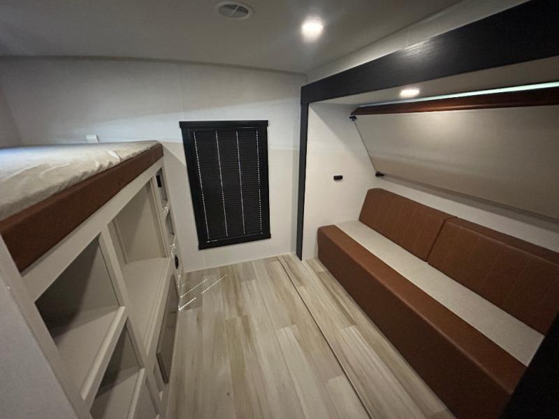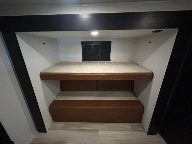 Your kids or friends are going to love camping in this travel trailer! It features a rear private bunkhouse with a bunk above a Versa queen convertible bed/sofa plus an additional bunk above an entertainment center with storage below. Just outside the bunkhouse is the kitchen with a 10 cu. ft. 12V black refrigerator, a microwave, a kitchen island, and a chef-sized walk-in pantry big enough to store everyone's favorite snacks. The booth dinette and the theatre seating are right next to panoramic windows so you can enjoy looking out at your beautiful scenery. You will also love taking a hot, steamy shower in the 30" x 36" shower with skylights and get a good night's rest on the queen bed with Versa Tilt in the front private bedroom!