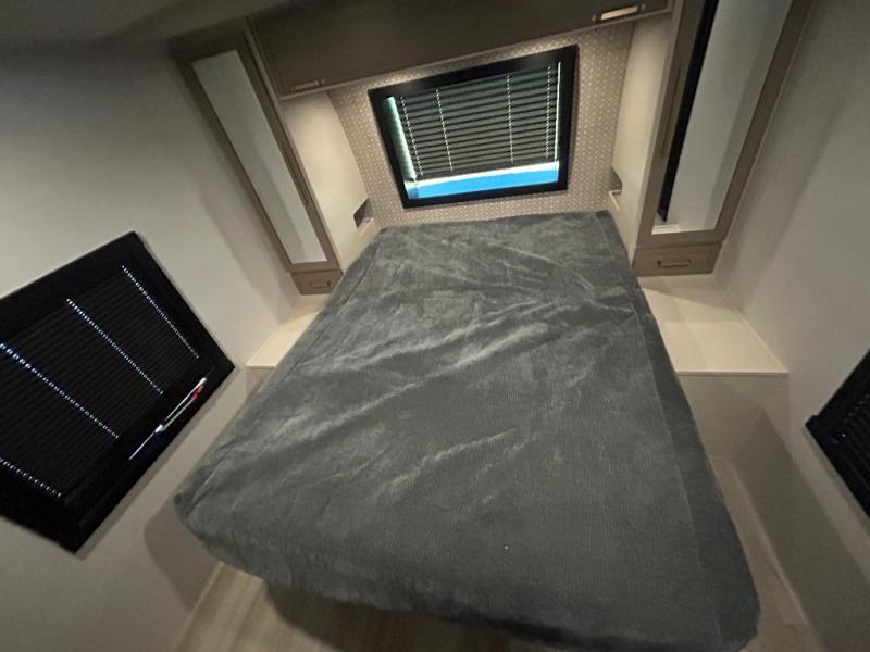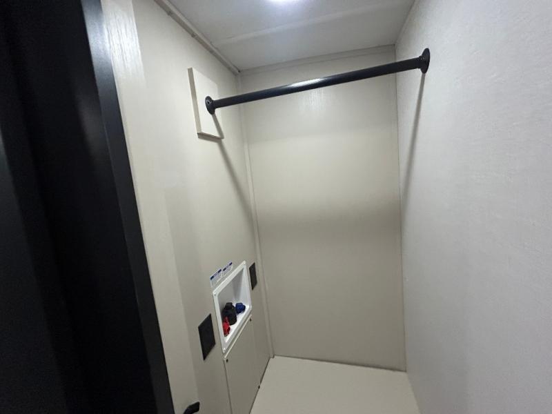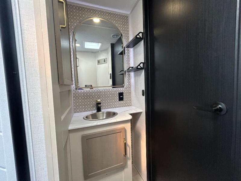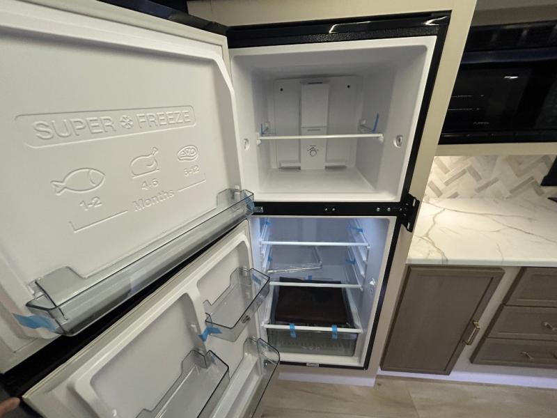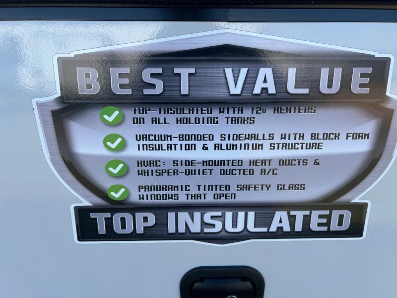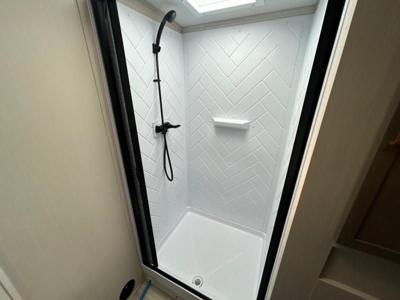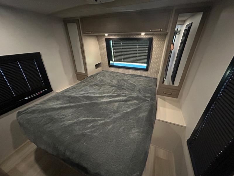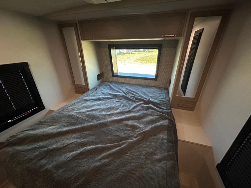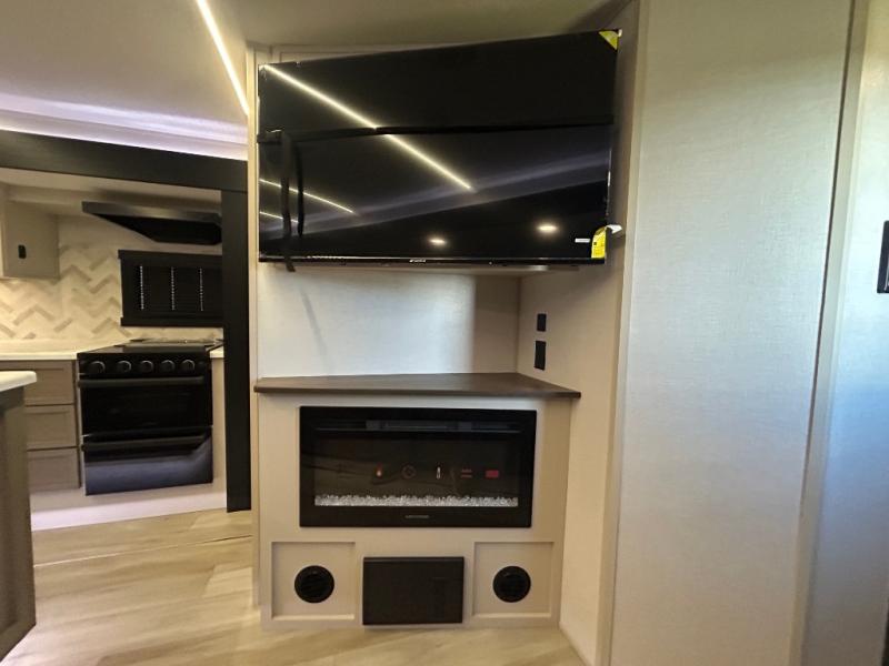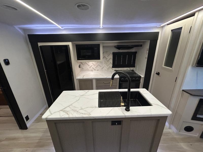 Your kids or friends are going to love camping in this travel trailer! It features a rear private bunkhouse with a bunk above a Versa queen convertible bed/sofa plus an additional bunk above an entertainment center with storage below. Just outside the bunkhouse is the kitchen with a 10 cu. ft. 12V black refrigerator, a microwave, a kitchen island, and a chef-sized walk-in pantry big enough to store everyone's favorite snacks. The booth dinette and the theatre seating are right next to panoramic windows so you can enjoy looking out at your beautiful scenery. You will also love taking a hot, steamy shower in the 30" x 36" shower with skylights and get a good night's rest on the queen bed with Versa Tilt in the front private bedroom!