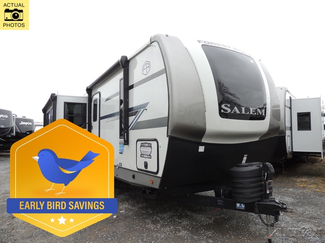 The Salem Hemisphere travel trailers by Forest River are packed with features, while still being value-minded! Each model is constructed with laminated "Aluma Frame" sidewalls and floor with block foam insulation plus an enclosed underbelly with 12V tank heaters on all holding tanks. There are LED awning, marker and taillights outside, along with an extra-large pass-thru storage with slam latch baggage doors, plus solar prep and Lippert On-The-Go ladder prep. The 60K on-demand tankless water heater will provide endless hot showers, and the JBL sound system includes a head unit plus interior and exterior speakers to keep the party going. There are also many interior comforts found throughout that will make you feel right at home!