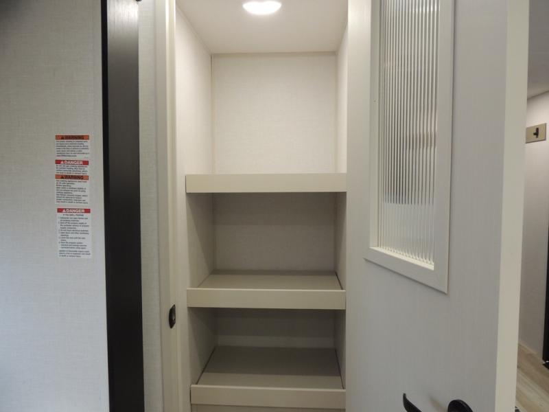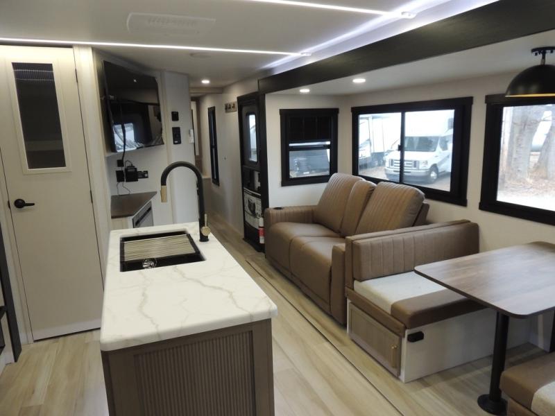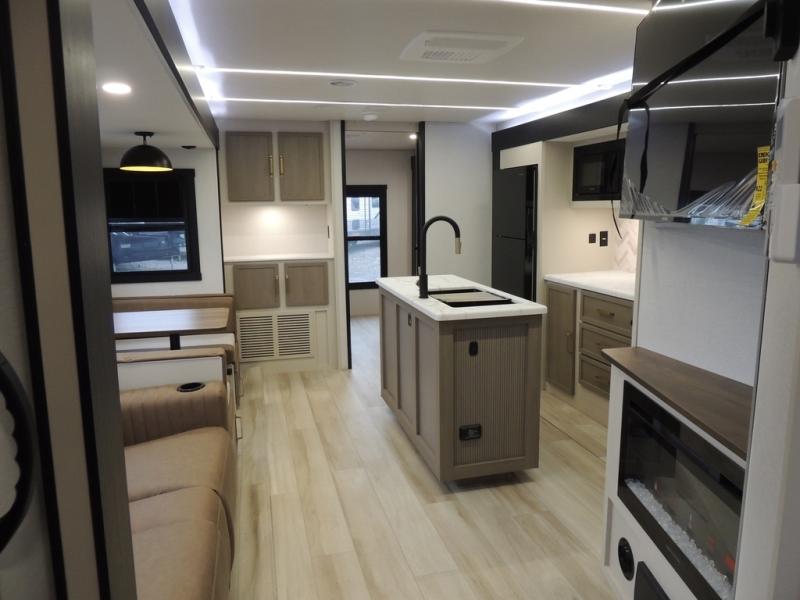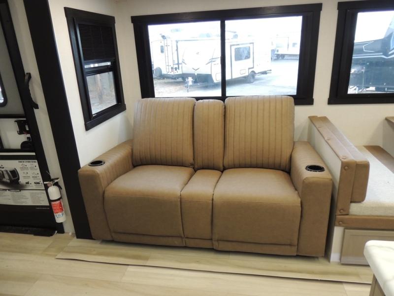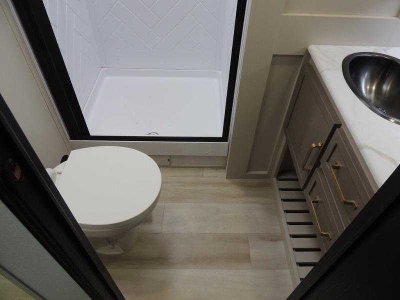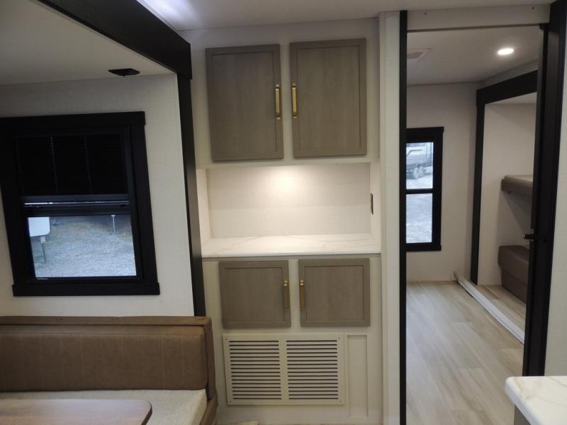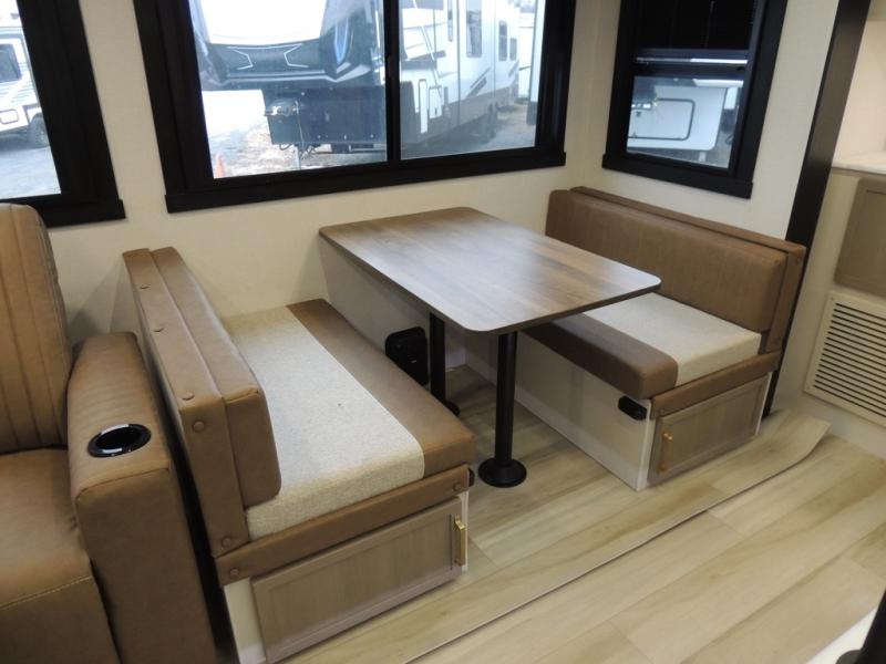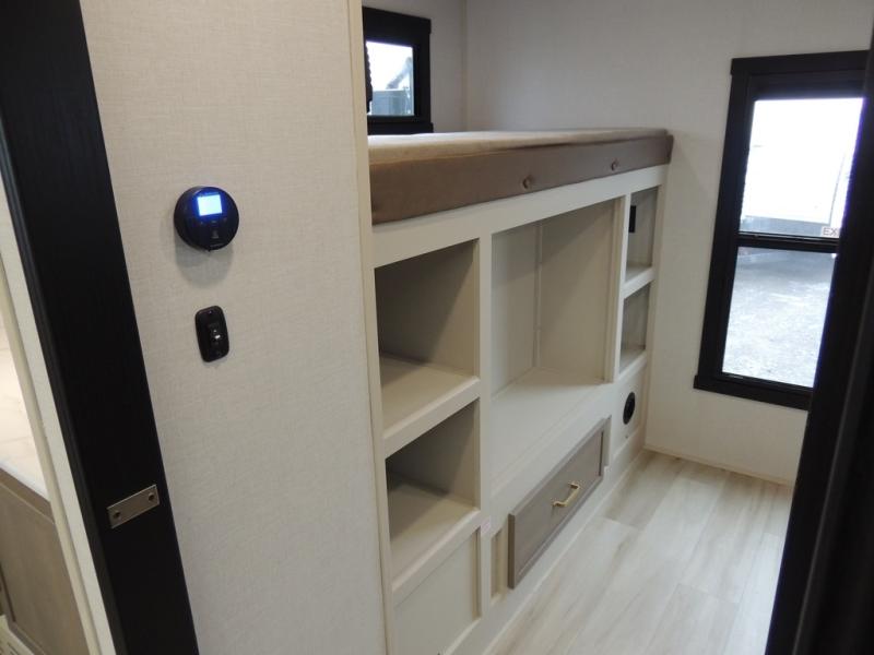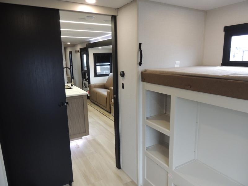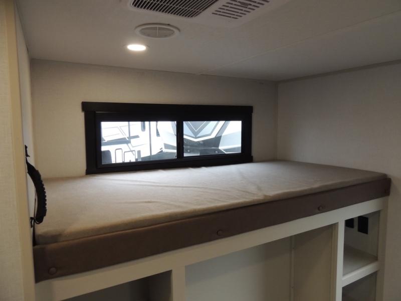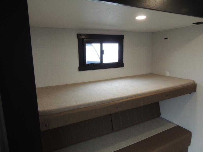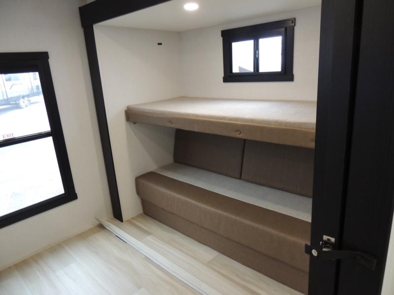 Your kids or friends are going to love camping in this travel trailer! It features a rear private bunkhouse with a bunk above a Versa queen convertible bed/sofa plus an additional bunk above an entertainment center with storage below. Just outside the bunkhouse is the kitchen with a 10 cu. ft. 12V black refrigerator, a microwave, a kitchen island, and a chef-sized walk-in pantry big enough to store everyone's favorite snacks. The booth dinette and the theatre seating are right next to panoramic windows so you can enjoy looking out at your beautiful scenery. You will also love taking a hot, steamy shower in the 30" x 36" shower with skylights and get a good night's rest on the queen bed in the front private bedroom!