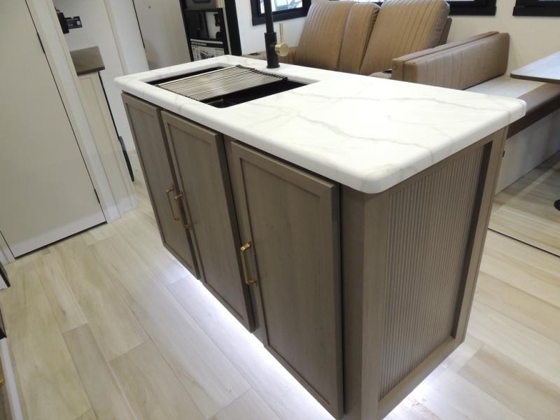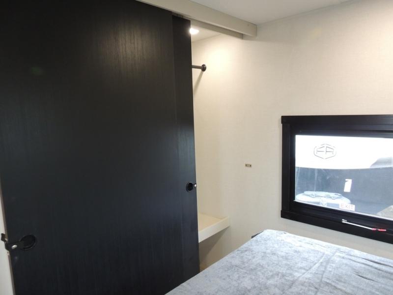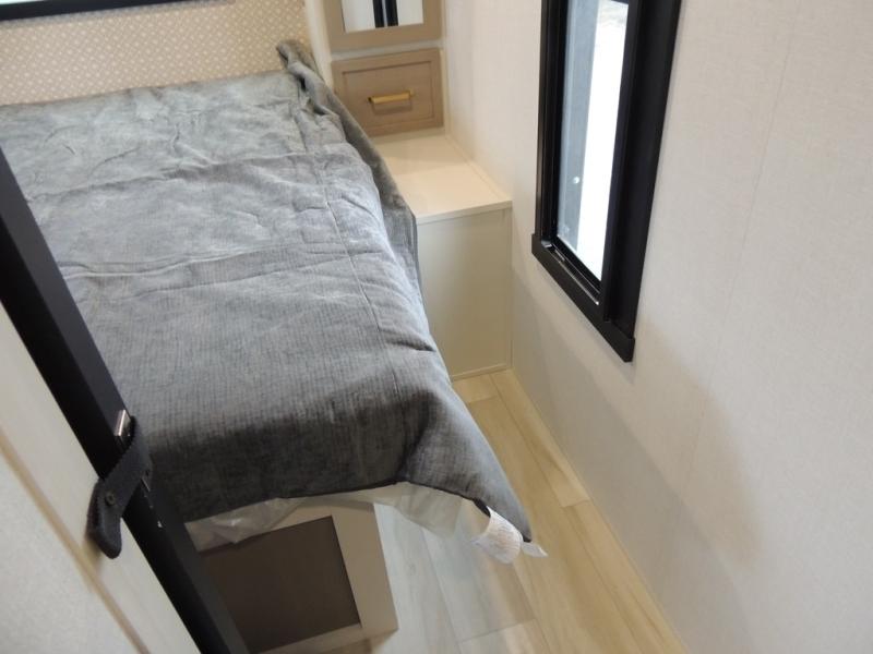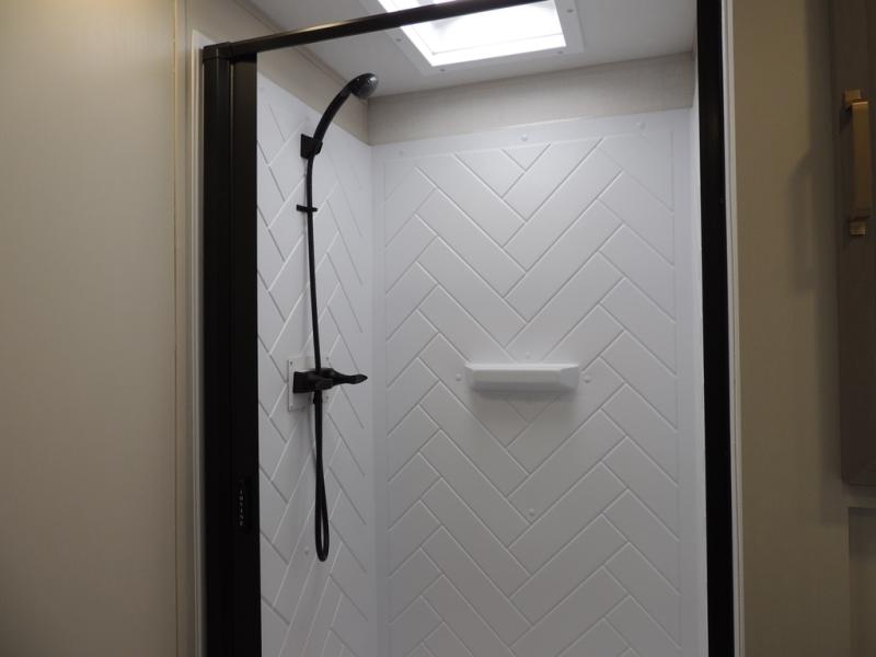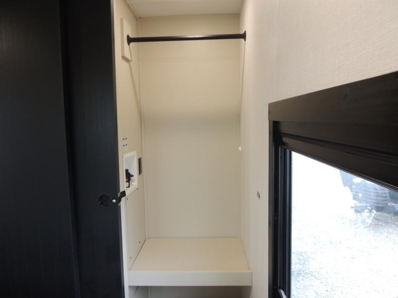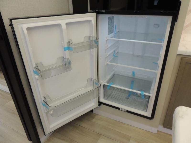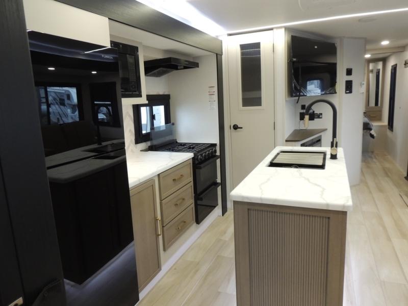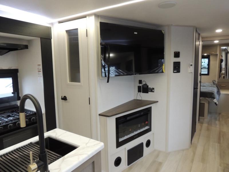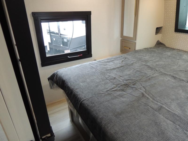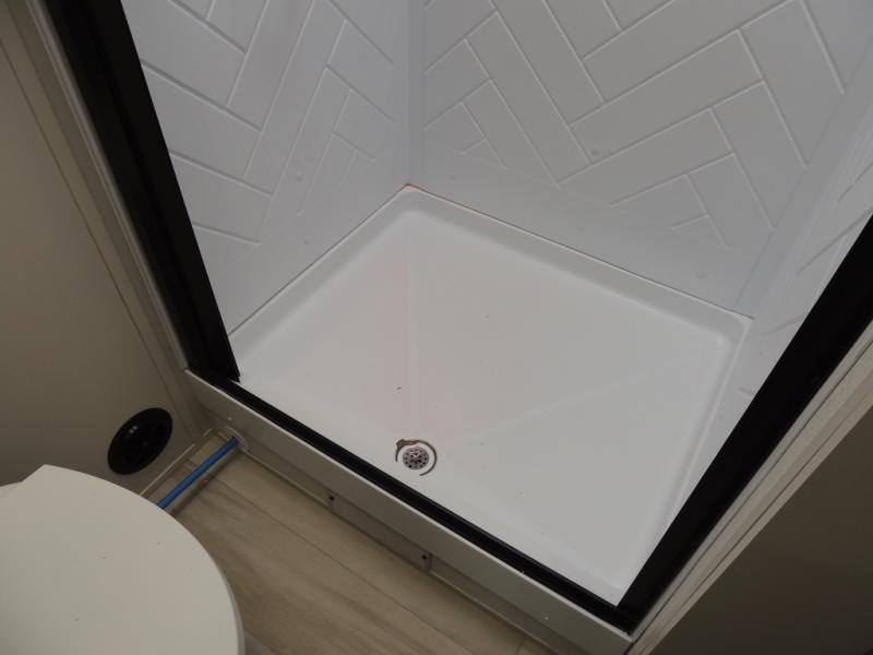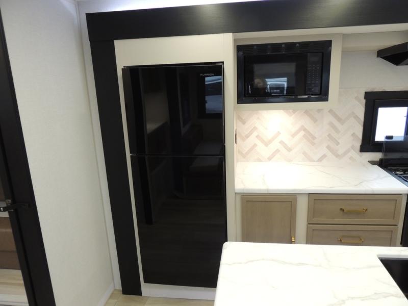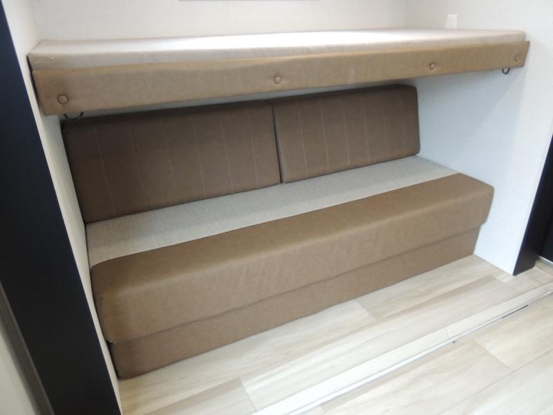 Your kids or friends are going to love camping in this travel trailer! It features a rear private bunkhouse with a bunk above a Versa queen convertible bed/sofa plus an additional bunk above an entertainment center with storage below. Just outside the bunkhouse is the kitchen with a 10 cu. ft. 12V black refrigerator, a microwave, a kitchen island, and a chef-sized walk-in pantry big enough to store everyone's favorite snacks. The booth dinette and the theatre seating are right next to panoramic windows so you can enjoy looking out at your beautiful scenery. You will also love taking a hot, steamy shower in the 30" x 36" shower with skylights and get a good night's rest on the queen bed in the front private bedroom!