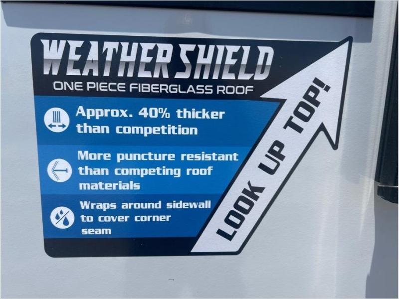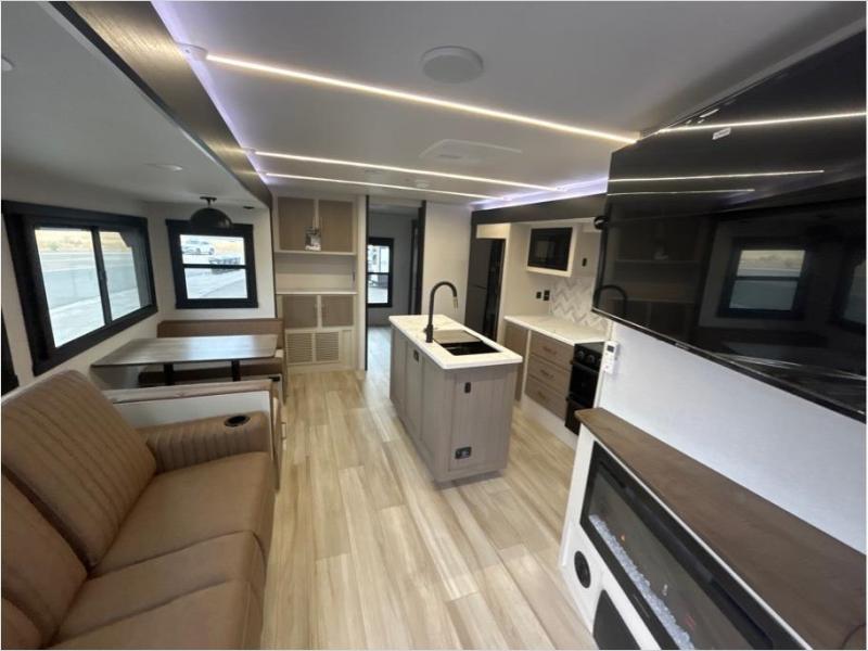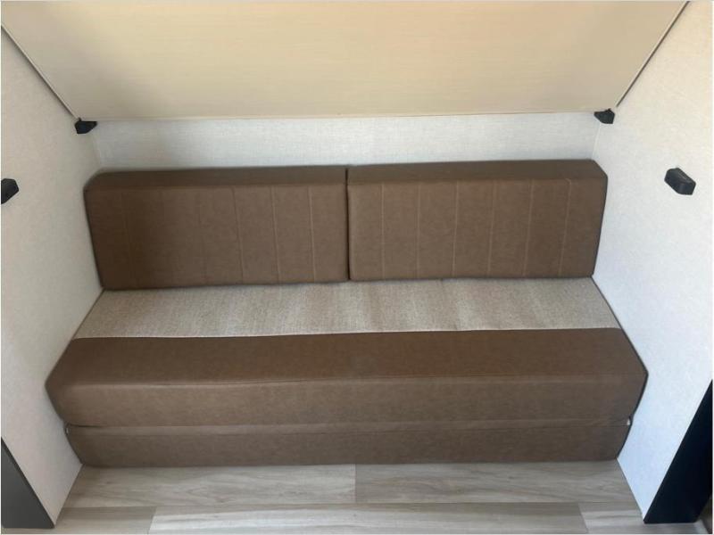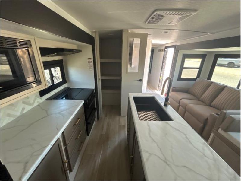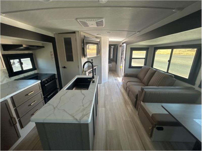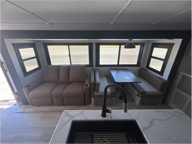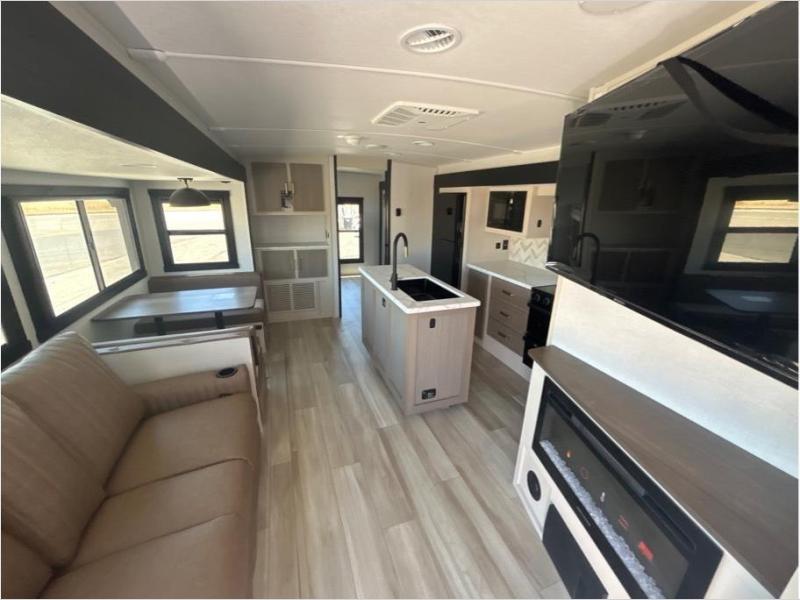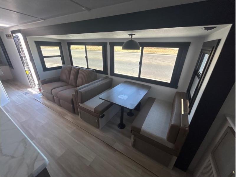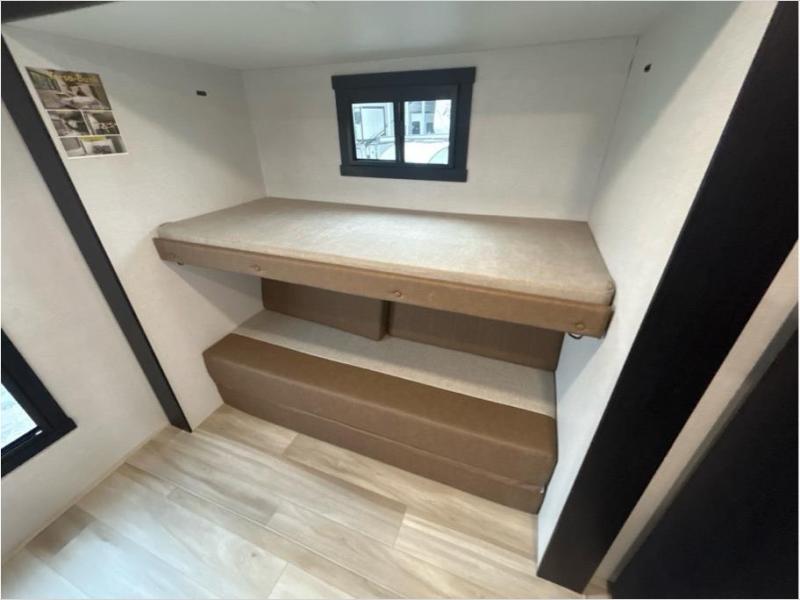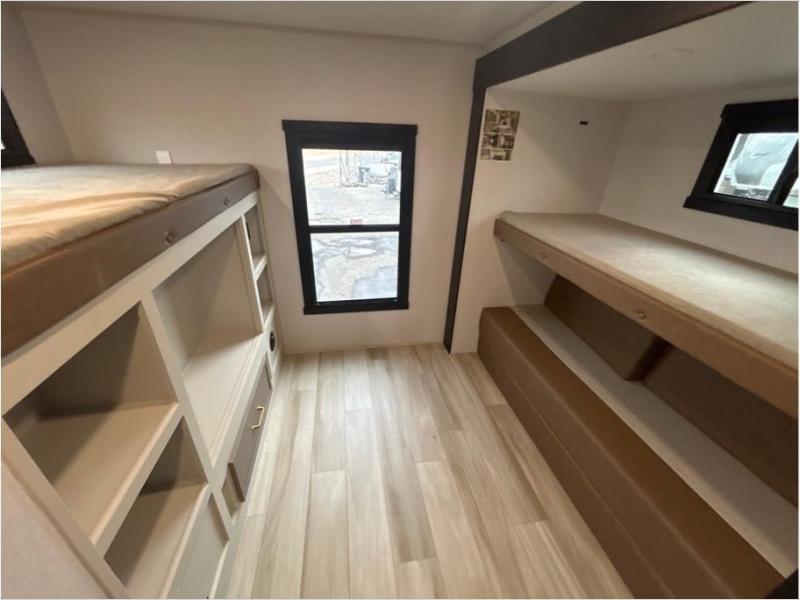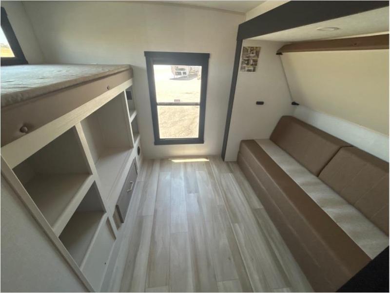 Your kids or friends are going to love camping in this travel trailer! It features a rear private bunkhouse with a bunk above a Versa queen convertible bed/sofa plus an additional bunk above an entertainment center with storage below. Just outside the bunkhouse is the kitchen with a 10 cu. ft. 12V black refrigerator, a microwave, a kitchen island, and a chef-sized walk-in pantry big enough to store everyone's favorite snacks. The booth dinette and the theatre seating are right next to panoramic windows so you can enjoy looking out at your beautiful scenery. You will also love taking a hot, steamy shower in the 30" x 36" shower with skylights and get a good night's rest on the queen bed in the front private bedroom!