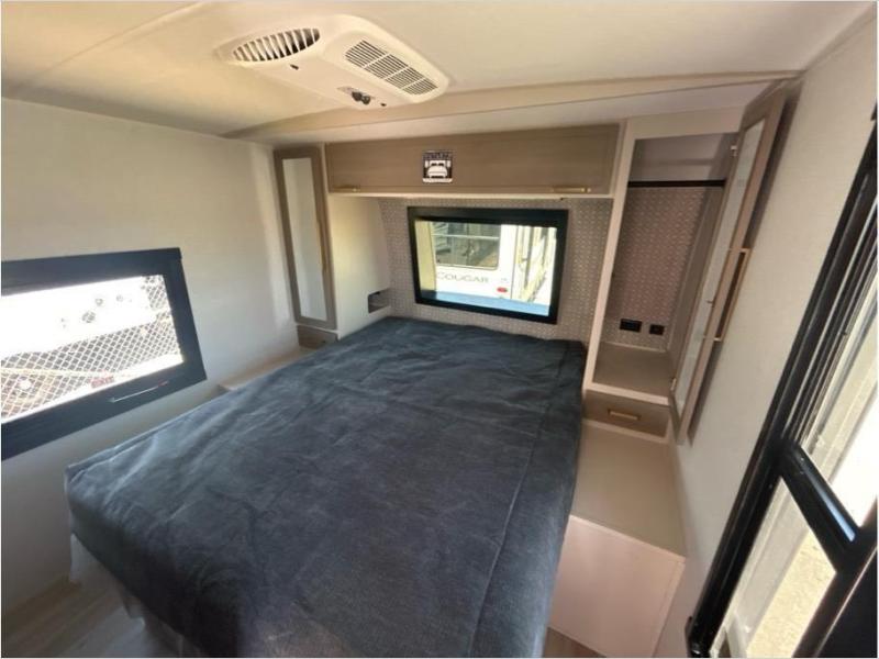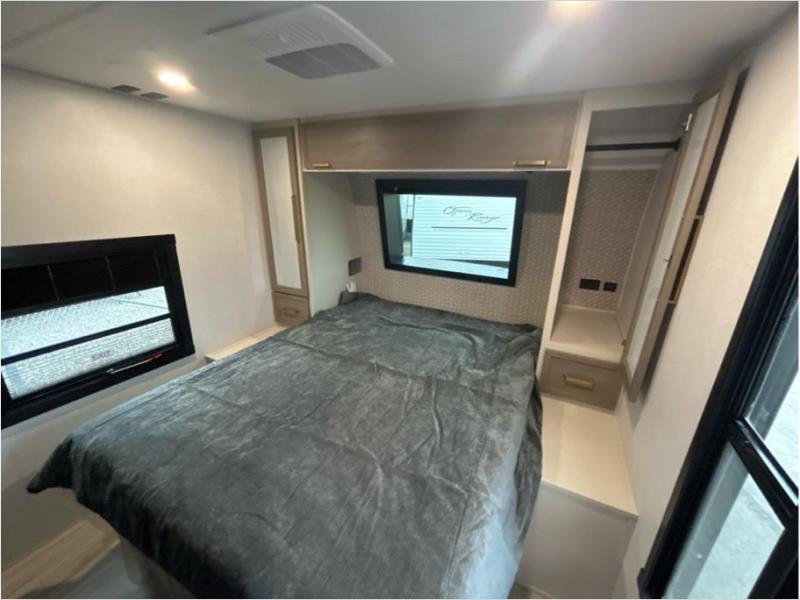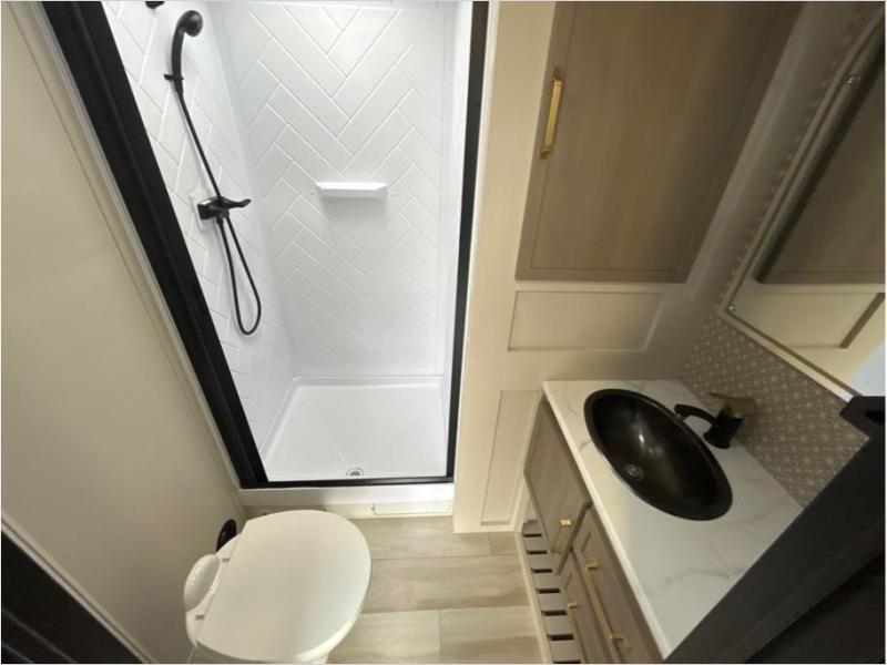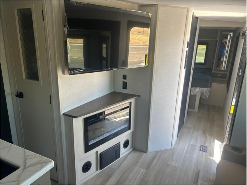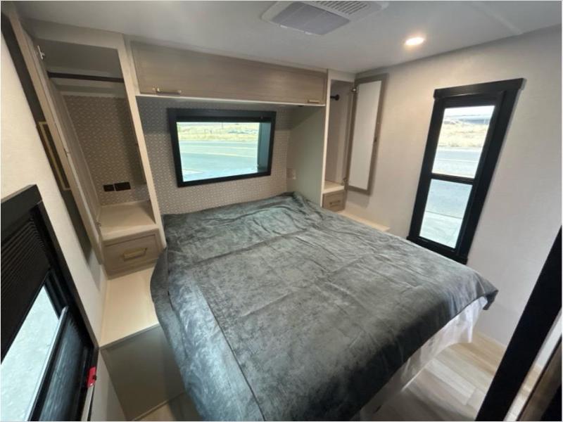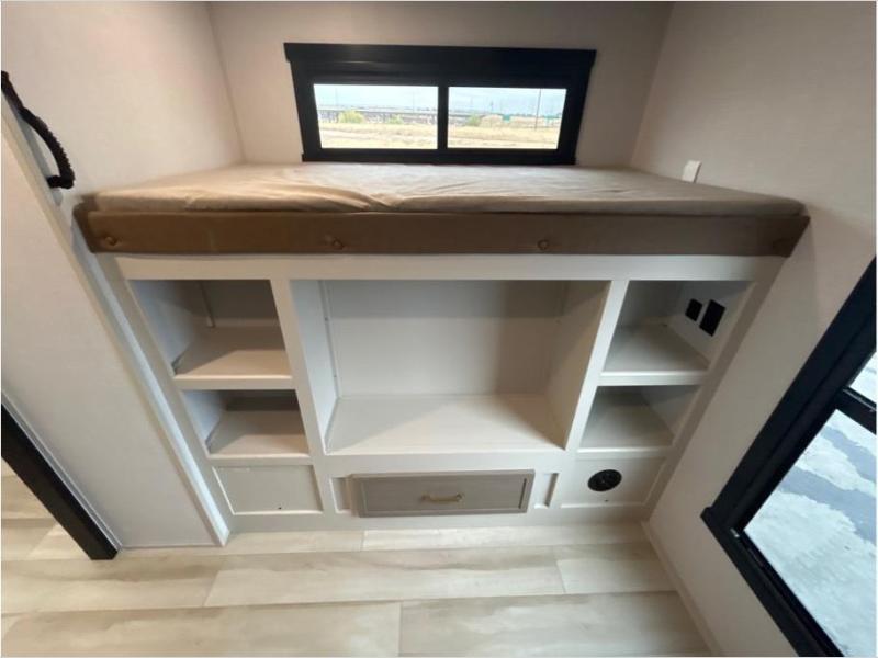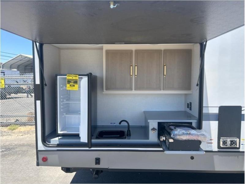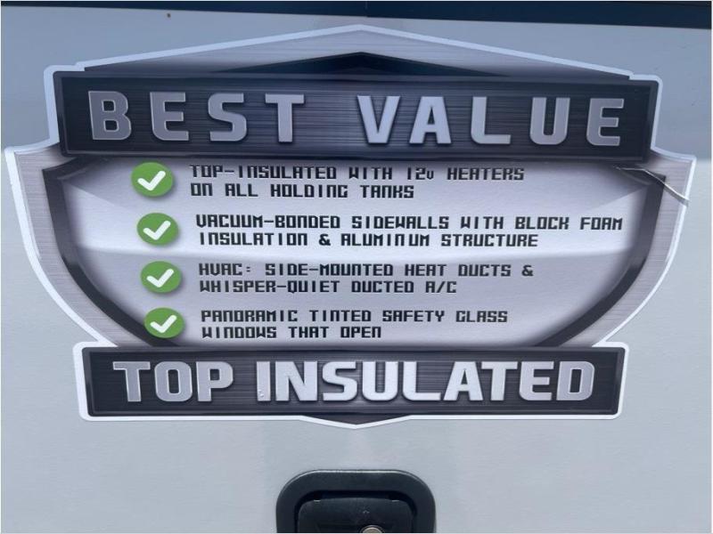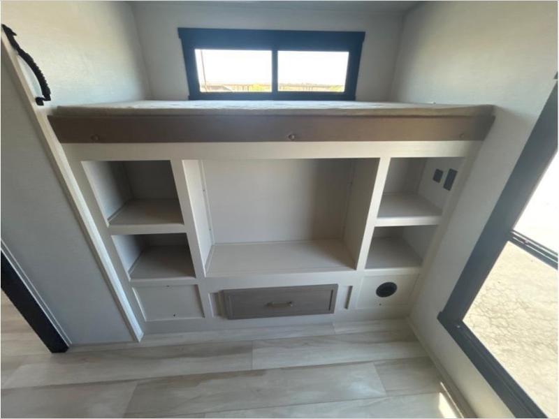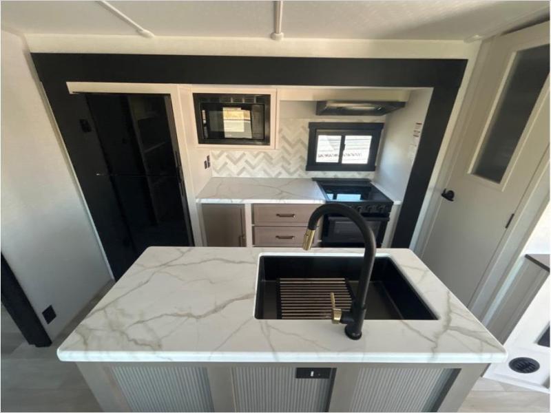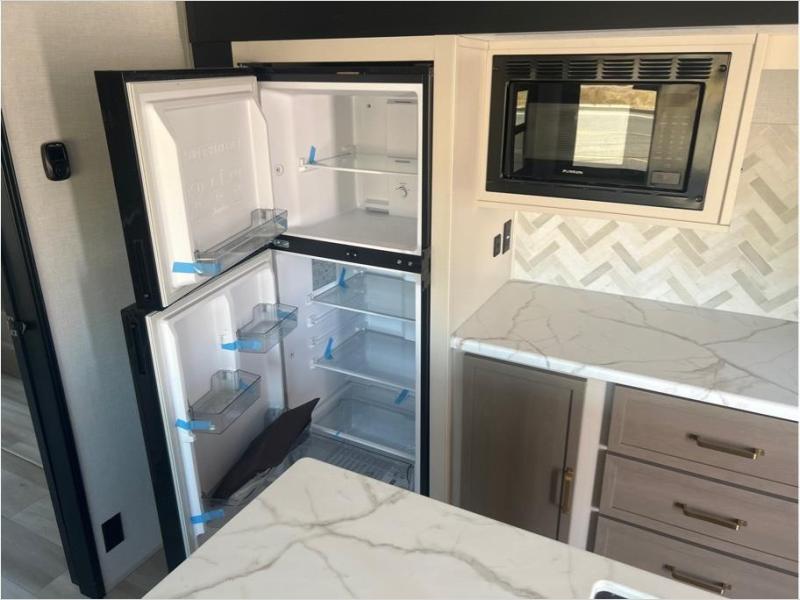 Your kids or friends are going to love camping in this travel trailer! It features a rear private bunkhouse with a bunk above a Versa queen convertible bed/sofa plus an additional bunk above an entertainment center with storage below. Just outside the bunkhouse is the kitchen with a 10 cu. ft. 12V black refrigerator, a microwave, a kitchen island, and a chef-sized walk-in pantry big enough to store everyone's favorite snacks. The booth dinette and the theatre seating are right next to panoramic windows so you can enjoy looking out at your beautiful scenery. You will also love taking a hot, steamy shower in the 30" x 36" shower with skylights and get a good night's rest on the queen bed in the front private bedroom!