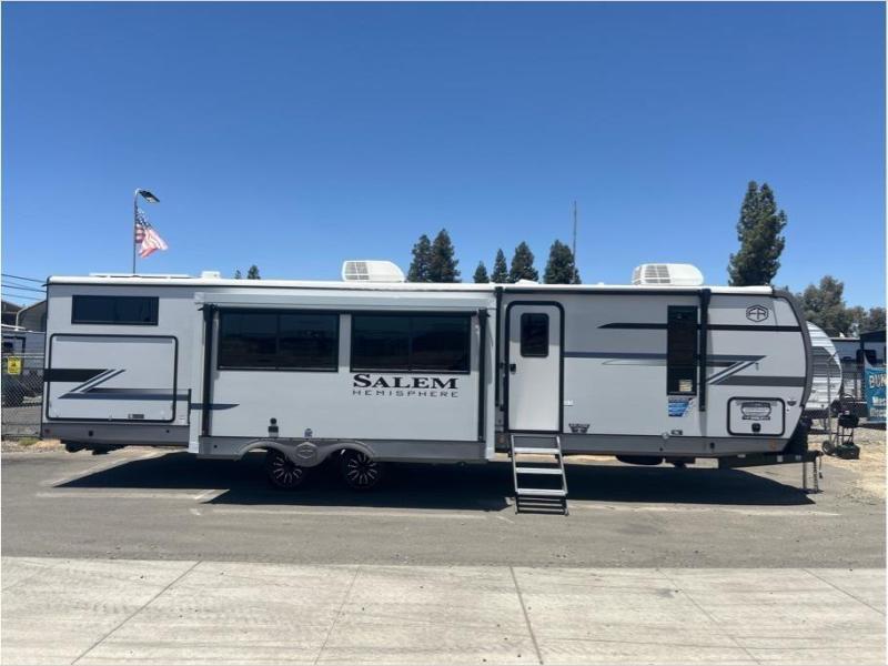 The Salem Hemisphere travel trailers by Forest River are packed with features, while still being value-minded! Each model is constructed with laminated "Aluma Frame" sidewalls and floor with block foam insulation plus an enclosed underbelly with 12V tank heaters on all holding tanks. There are LED awning, marker and taillights outside, along with an extra-large pass-thru storage with slam latch baggage doors, plus solar prep and Lippert On-The-Go ladder prep. The 60K on-demand tankless water heater will provide endless hot showers, and the JBL sound system includes a head unit plus interior and exterior speakers to keep the party going. There are also many interior comforts found throughout that will make you feel right at home!