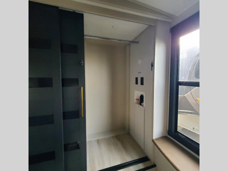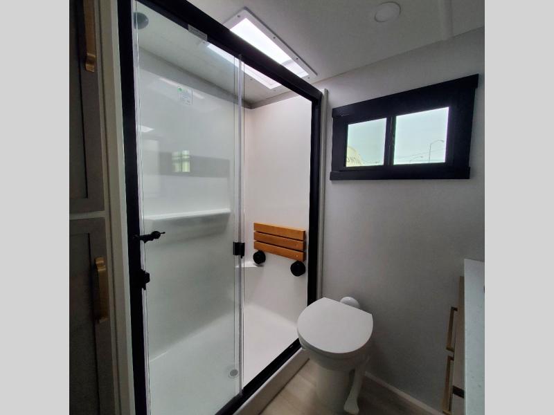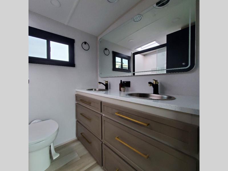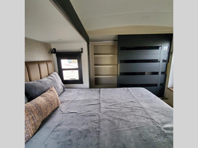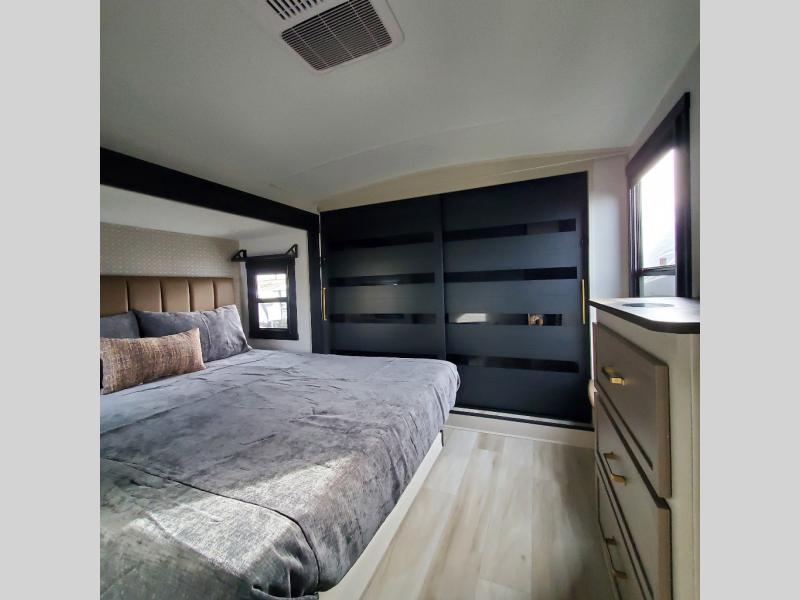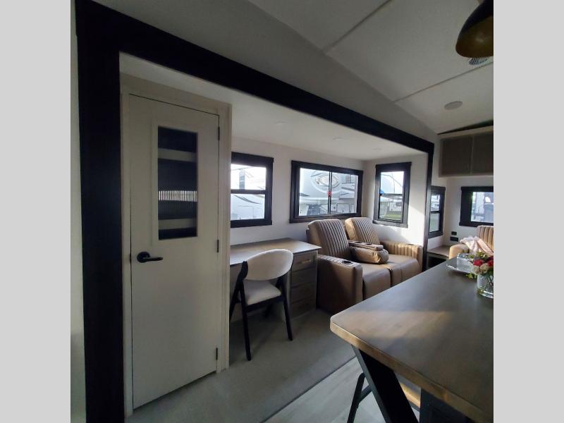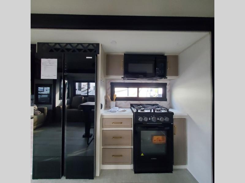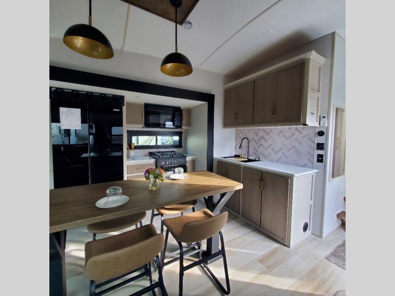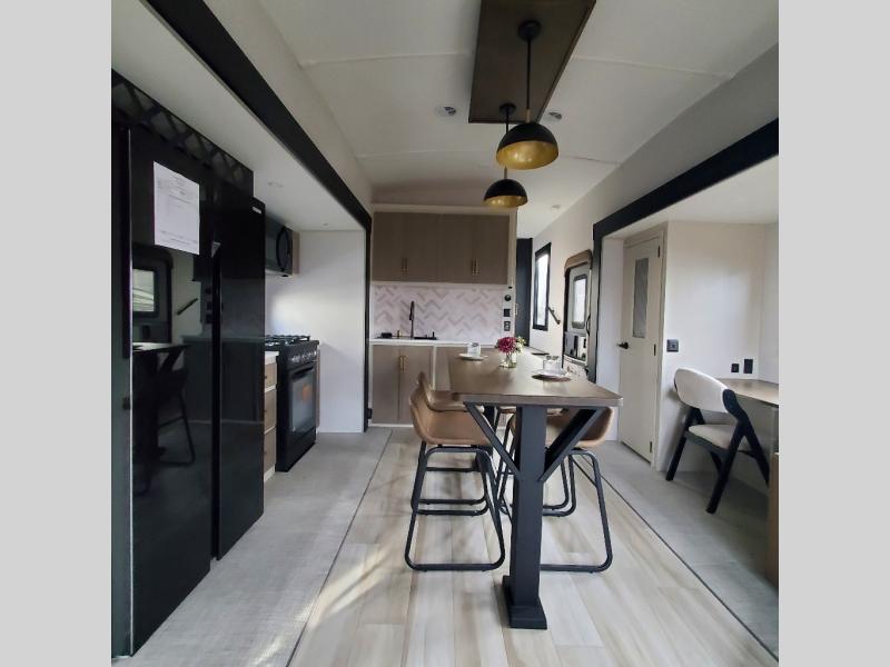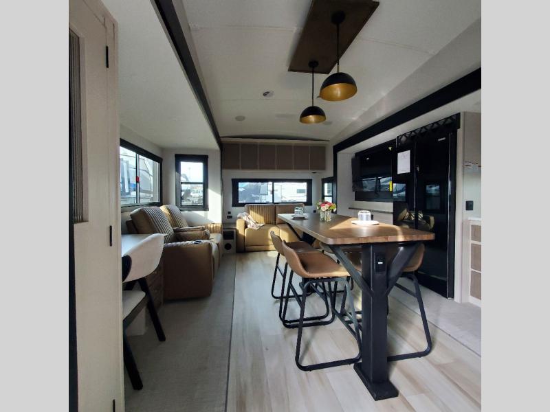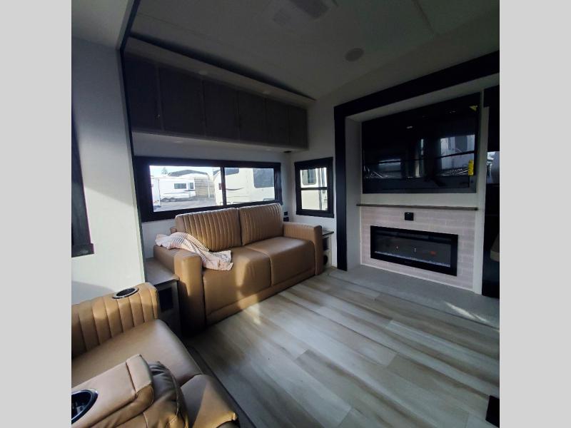 It won't be hard to find comfort in this spacious fifth wheel for four! Once you've unloaded the pass-thru storage, you can head inside to make lunch in the full kitchen. There is a 16-cu. ft. 12V refrigerator here to keep food fresh, and everyone can dine at the kitchen island with four chairs. The theater seating is directly across from the 50" TV and fireplace, and you'll appreciate the hidden storage behind the TV for movies, games, and books! A desk with a chair is also found in the combined kitchen and living area if you need to get some work done, and a rear tri-fold sofa provides sleeping space for guests. Don't overlook the spacious full bath with dual sinks and the front private bedroom with a custom king bed slide. A front wardrobe plus a dresser will let you keep your space tidy, and there is washer/dryer prep if you plan to add those appliances!
