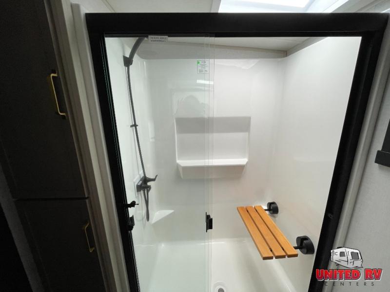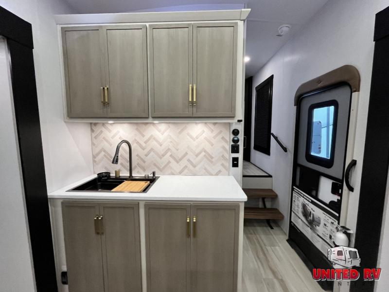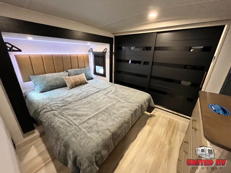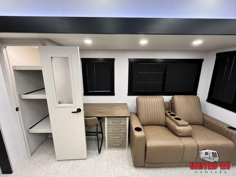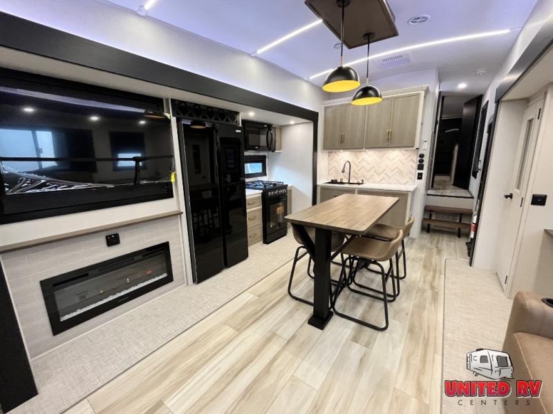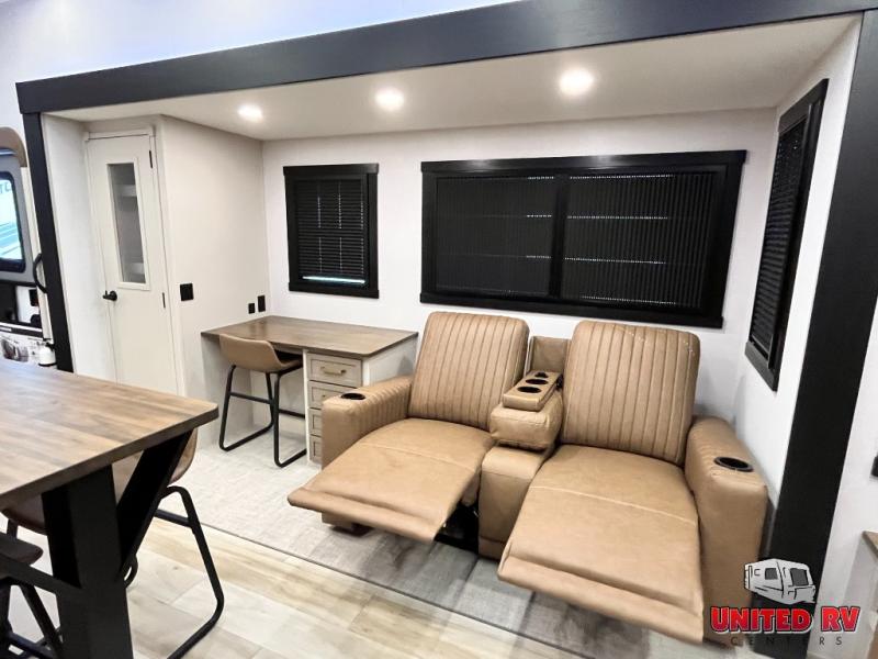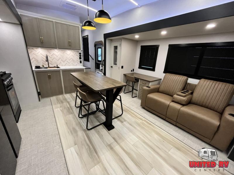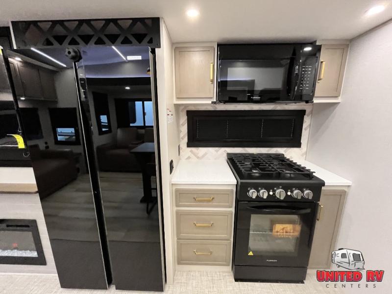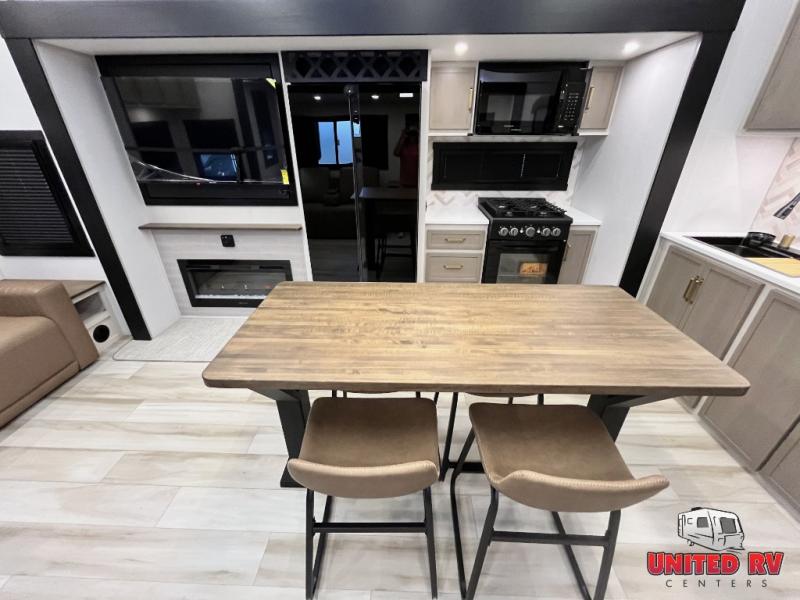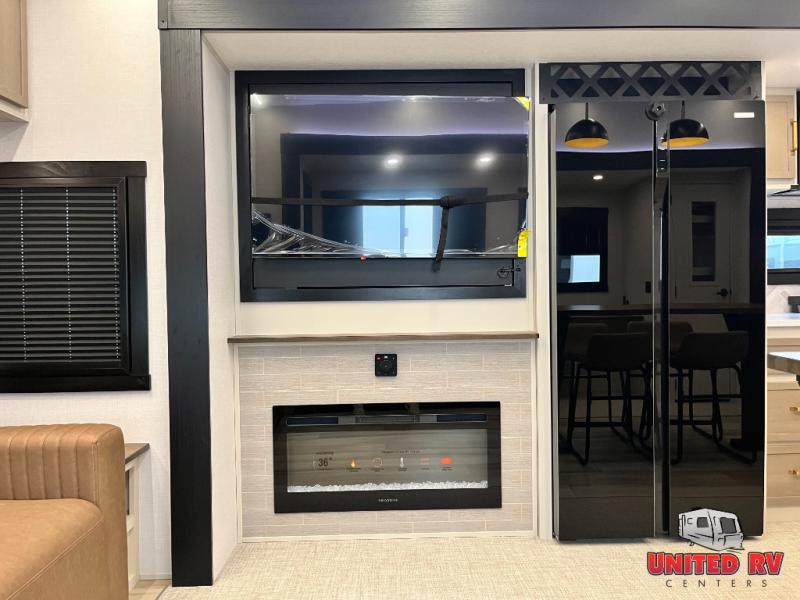 It won't be hard to find comfort in this spacious fifth wheel for four! Once you've unloaded the pass-thru storage, you can head inside to make lunch in the full kitchen. There is a 16-cu. ft. 12V refrigerator here to keep food fresh, and everyone can dine at the kitchen island with four chairs. The theater seating is directly across from the 50" TV and fireplace, and you'll appreciate the hidden storage behind the TV for movies, games, and books! A desk with a chair is also found in the combined kitchen and living area if you need to get some work done, and a rear tri-fold sofa provides sleeping space for guests. Don't overlook the spacious full bath with dual sinks and the front private bedroom with a custom king bed slide. A front wardrobe plus a dresser will let you keep your space tidy, and there is washer/dryer prep if you plan to add those appliances!