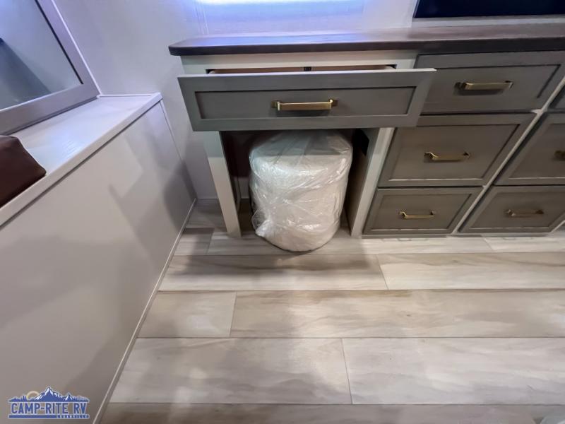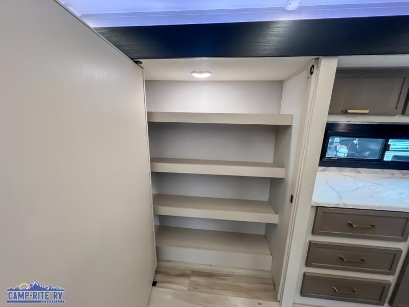 This rig has everything you could want for extended stays or full-time living. Start your day in a walk-in residential shower with skylight, offering both headroom and natural light. Cook like a pro with the kitchen island and added hutch space for extra storage. Need to work on the go? You’ll love the roomy desk at the rear.