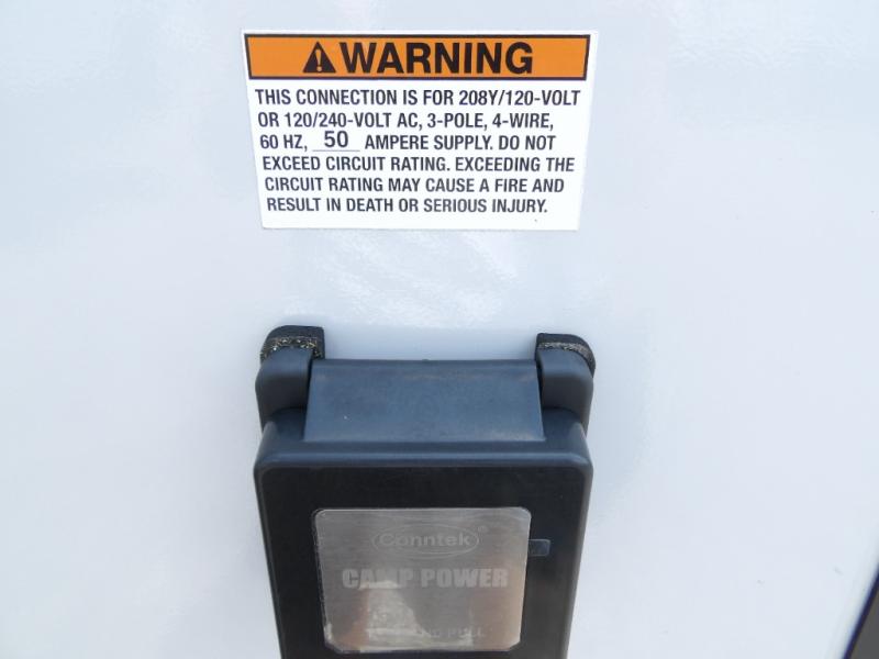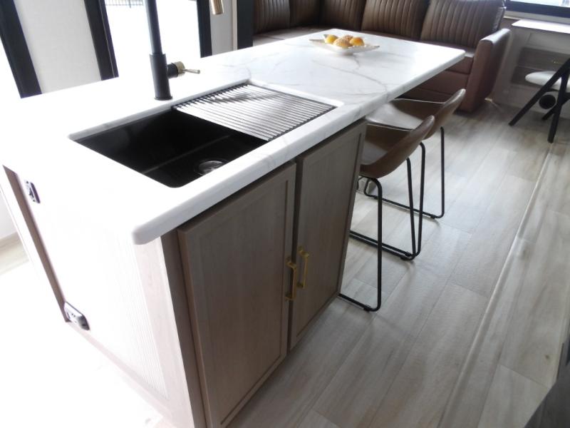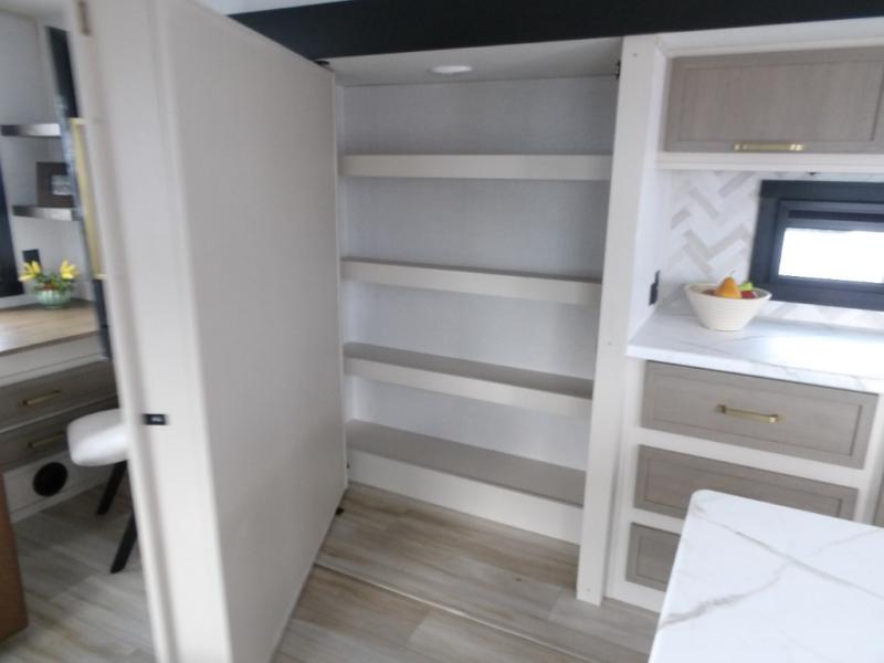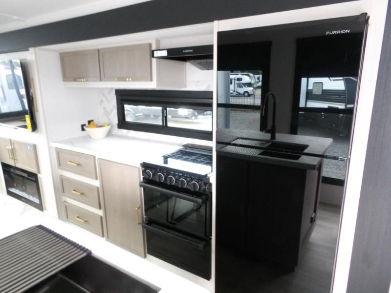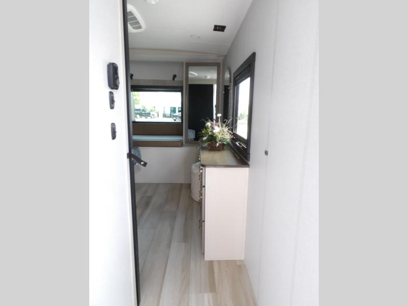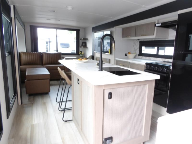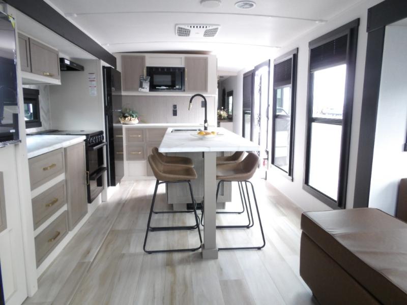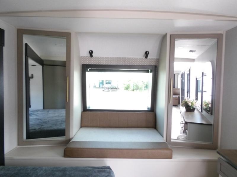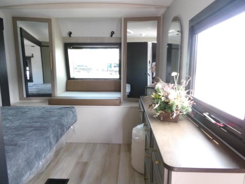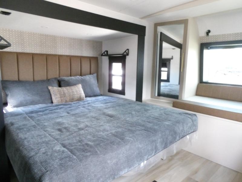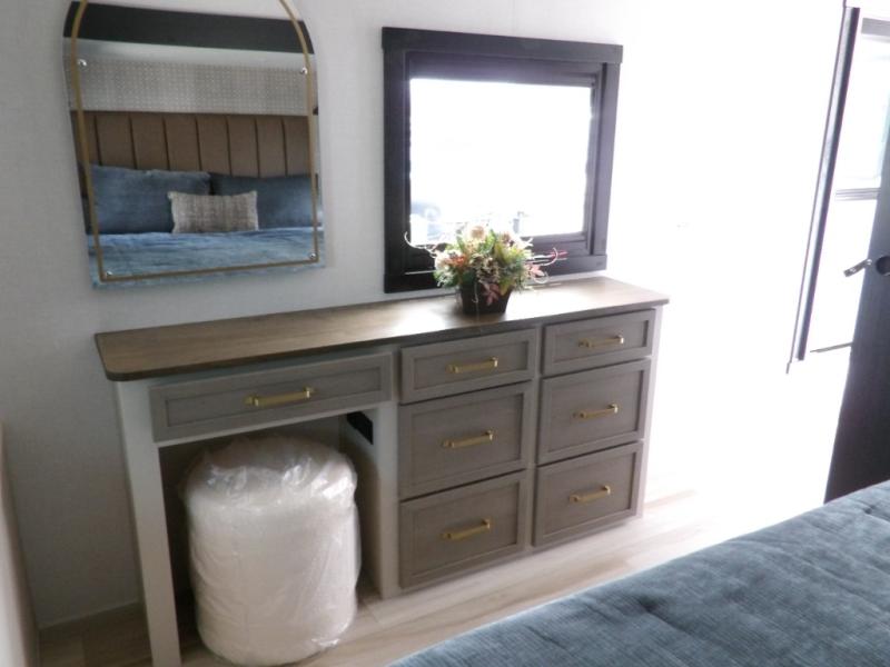 Enjoy comfortable stays at the campground in this spacious travel trailer. The rear living area with panoramic windows will be a favorite place to relax with its L-shaped sofa and ottoman, which is in direct view of the 50" TV and fireplace. There is also a hidden storage behind the TV, and a designated desk space in the back where you can get some work done. The chef of your group can create meals in the full kitchen, and there is dining space at the kitchen island with four chairs. Towards the front, a full bath will let you freshen up each day, and the front private bedroom with a queen bed slide is sure to bring comfort. There are also dual wardrobes with a bench in between, plus a dresser with an ottoman!