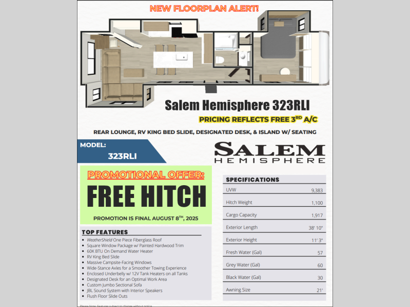 Salem Hemisphere 323RLI WITH REAR LOUNGE, RV KING BED SLIDE, DESIGNATED DESK, & ISLAND W/ SEATING PLUS MORE....