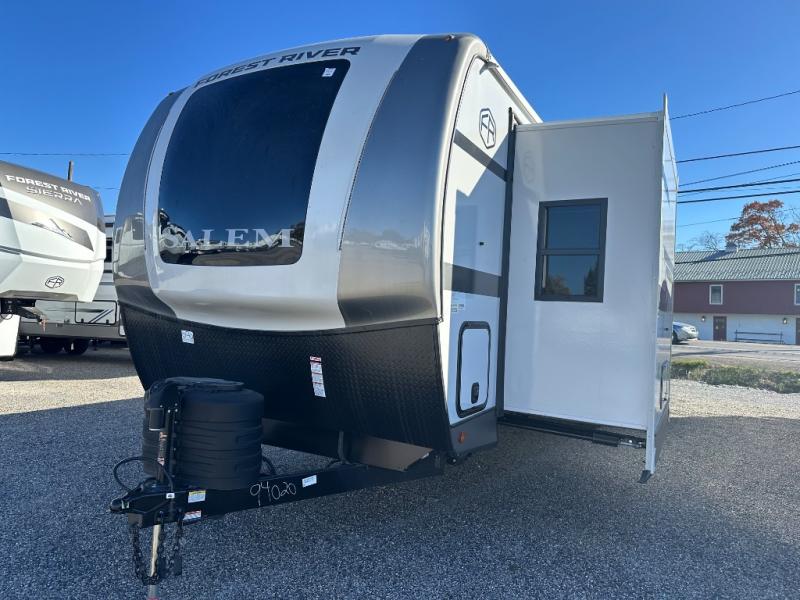 The Salem Hemisphere travel trailers by Forest River are packed with features, while still being value-minded! Each model is constructed with laminated "Aluma Frame" sidewalls and floor with block foam insulation plus an enclosed underbelly with 12V tank heaters on all holding tanks. There are LED awning, marker and taillights outside, along with an extra-large pass-thru storage with slam latch baggage doors, plus solar prep and Lippert On-The-Go ladder prep. The 60K on-demand tankless water heater will provide endless hot showers, and the JBL sound system includes a head unit plus interior and exterior speakers to keep the party going. There are also many interior comforts found throughout that will make you feel right at home!