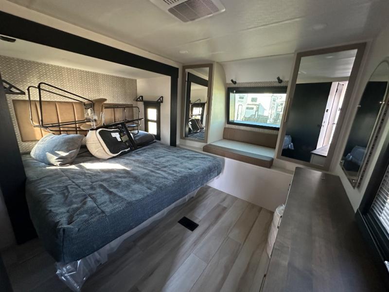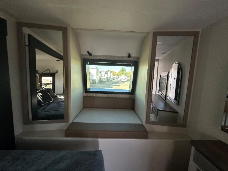 Enjoy comfortable stays at the campground in this spacious travel trailer. The rear living area with panoramic windows will be a favorite place to relax with its L-shaped sofa and ottoman, which is in direct view of the 50" TV and fireplace. There is also a hidden storage behind the TV, and a designated desk space in the back where you can get some work done. The chef of your group can create meals in the full kitchen, and there is dining space at the kitchen island with four chairs. Towards the front, a full bath will let you freshen up each day, and the front private bedroom with a queen bed slide is sure to bring comfort. There are also dual wardrobes with a bench in between, plus a dresser with an ottoman!