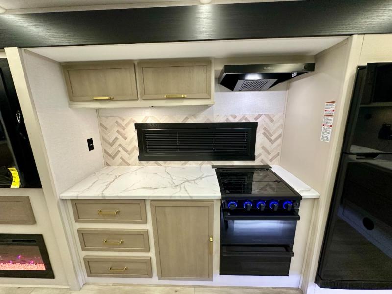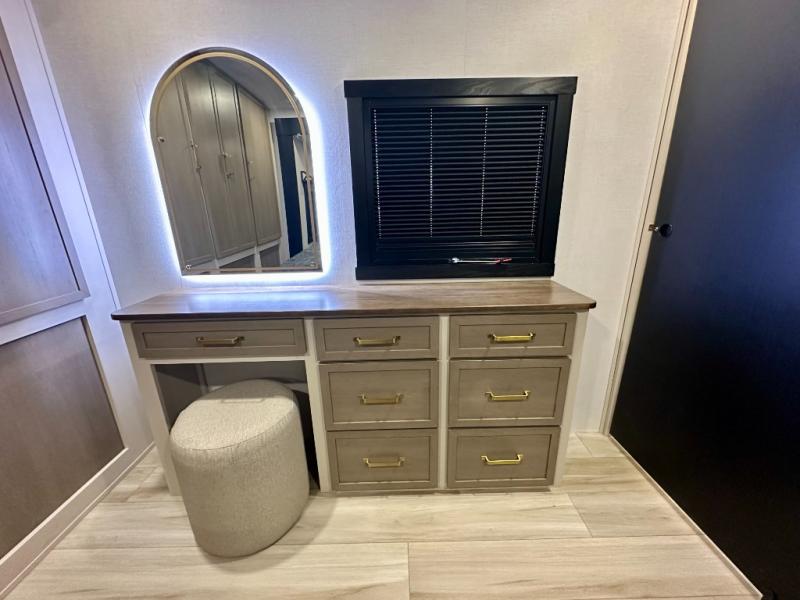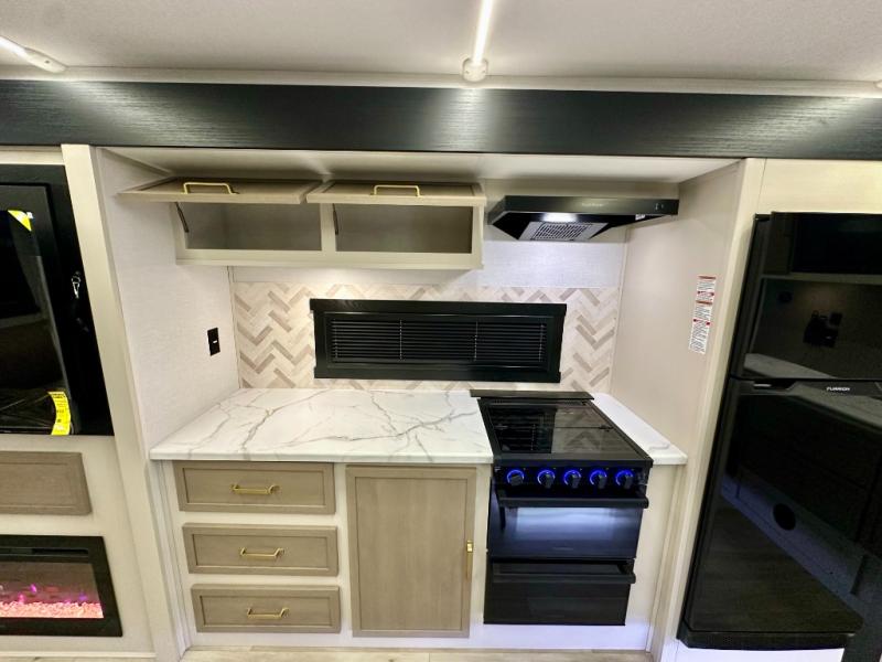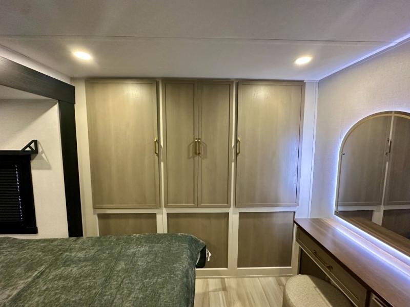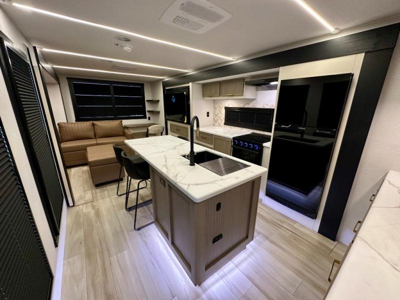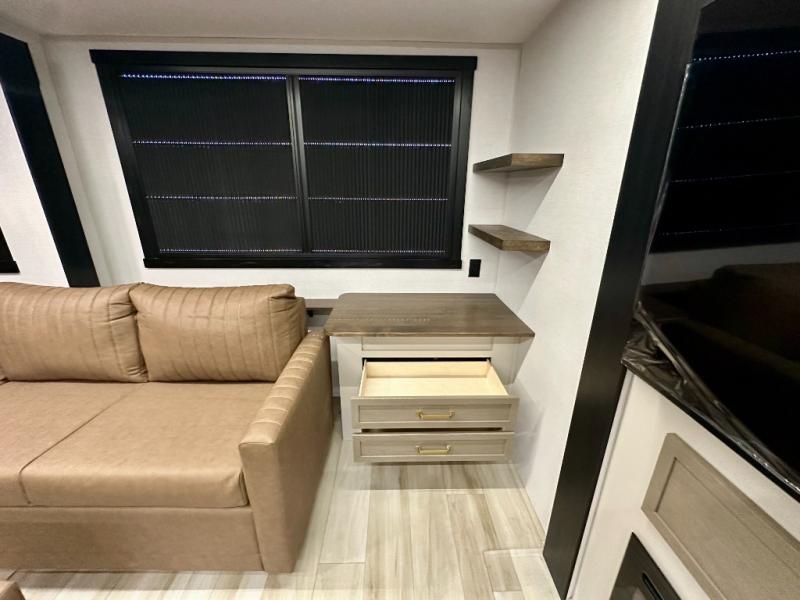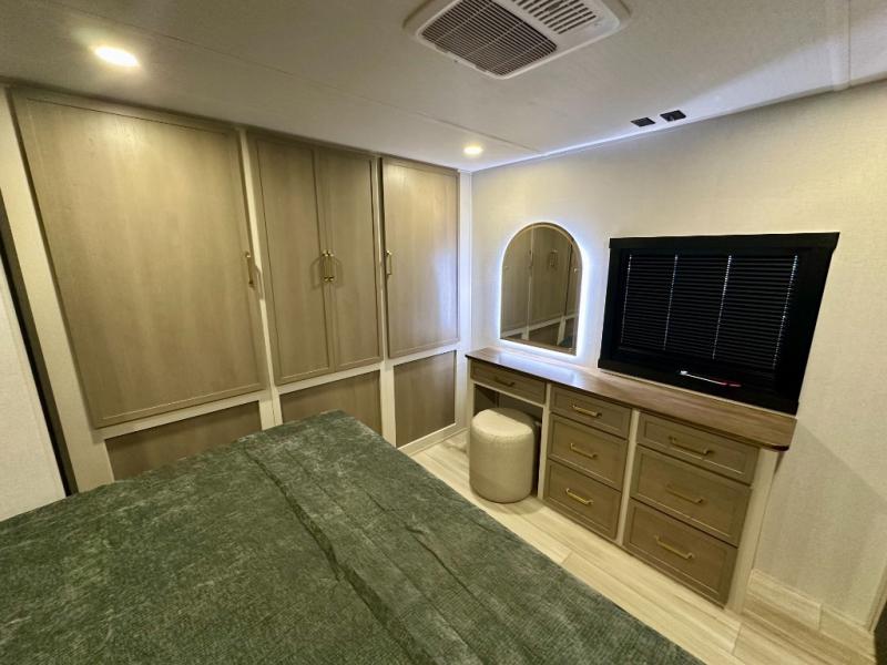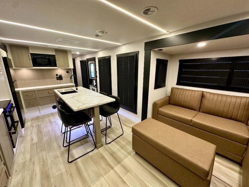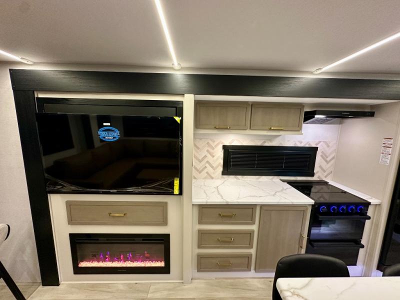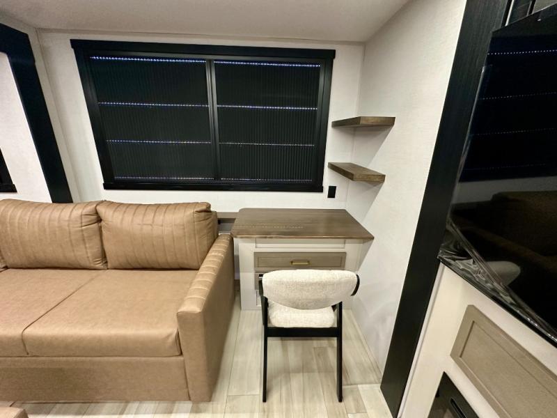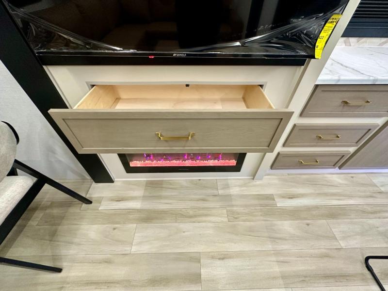 Enjoy comfortable stays at the campground in this spacious travel trailer. The rear living area with panoramic windows will be a favorite place to relax with its L-shaped sofa and ottoman, which is in direct view of the 50" TV and fireplace. There is also a hidden storage behind the TV, and a designated desk space in the back where you can get some work done. The chef of your group can create meals in the full kitchen, and there is dining space at the kitchen island with four chairs. Towards the front, a full bath will let you freshen up each day, and the front private bedroom with a queen bed slide is sure to bring comfort. There are also dual wardrobes with a bench in between, plus a dresser with an ottoman!
